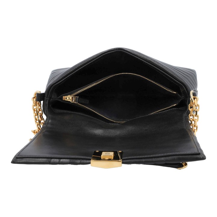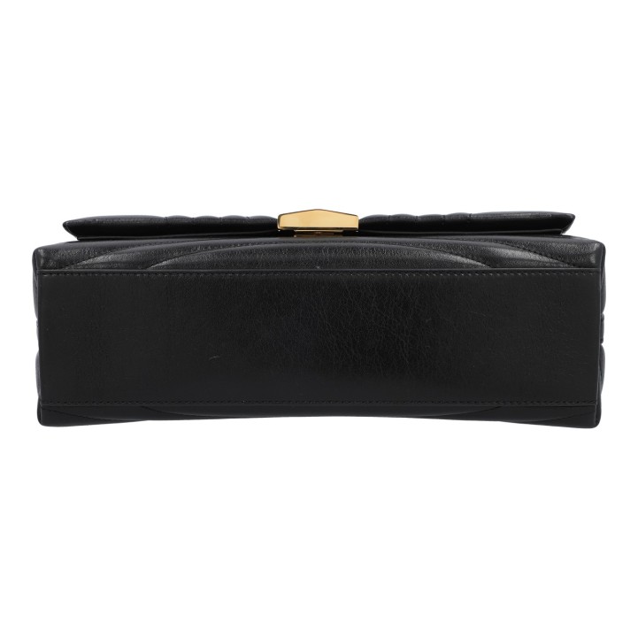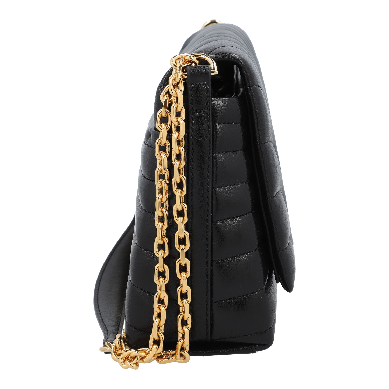 Wattiertes Leder in Schwarz mit feiner Narbung un ddekorativem Steppmuster. Hardware in Goldfarben. Überschlag mit magnetischem Verschluss, Innenfutter aus Textil, Hauptfach unterteilt in mehrere Fächer. Sehr guter Erhalt. Staubbeutel anbei. 28x9x18cm.