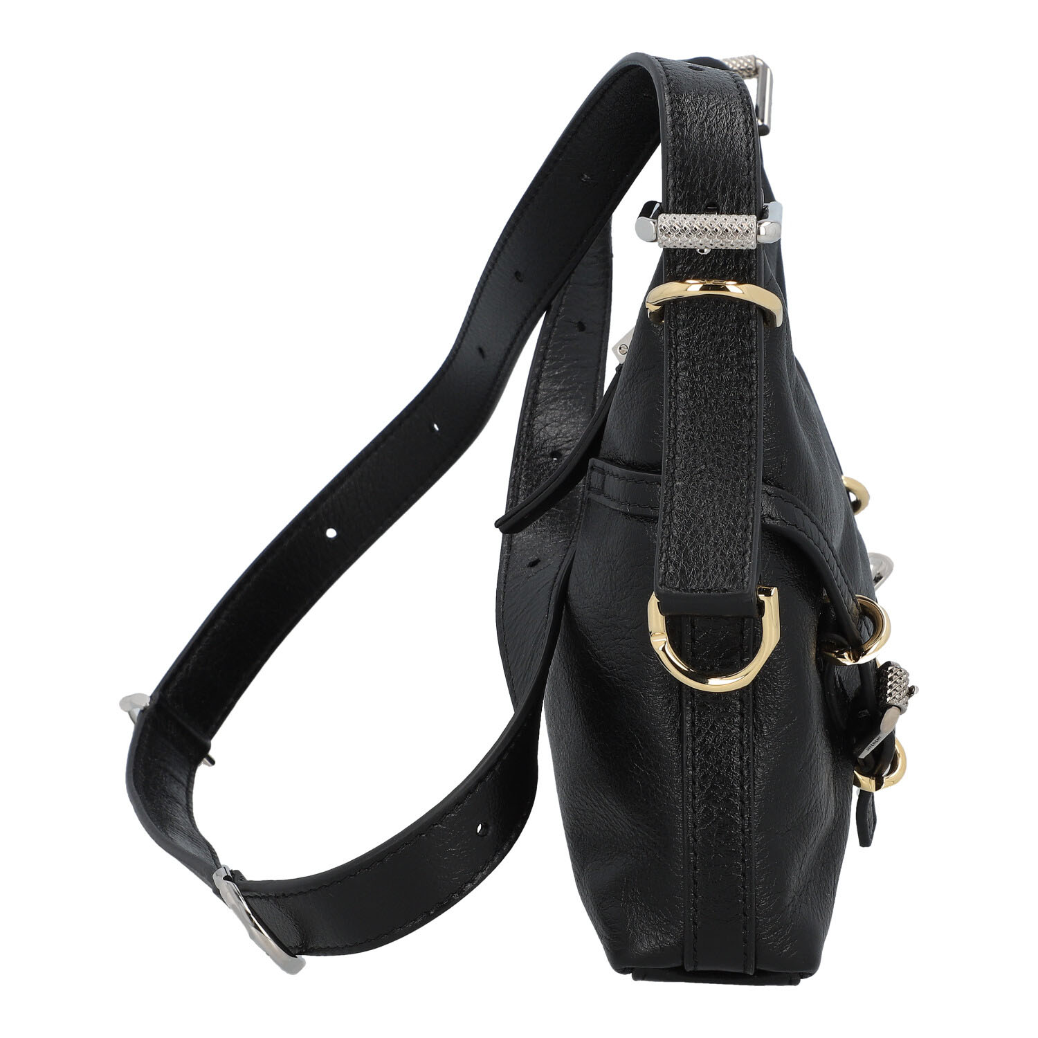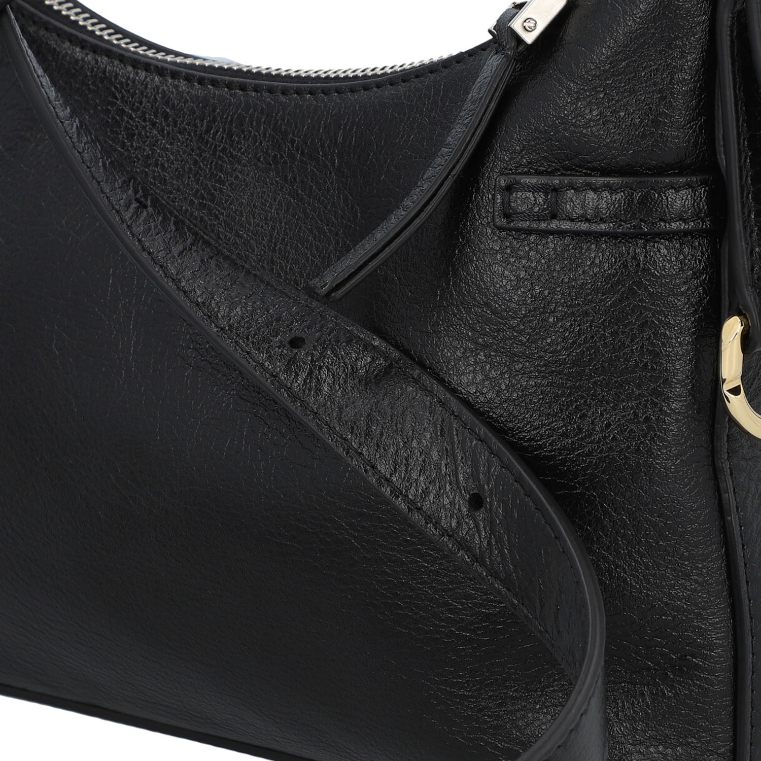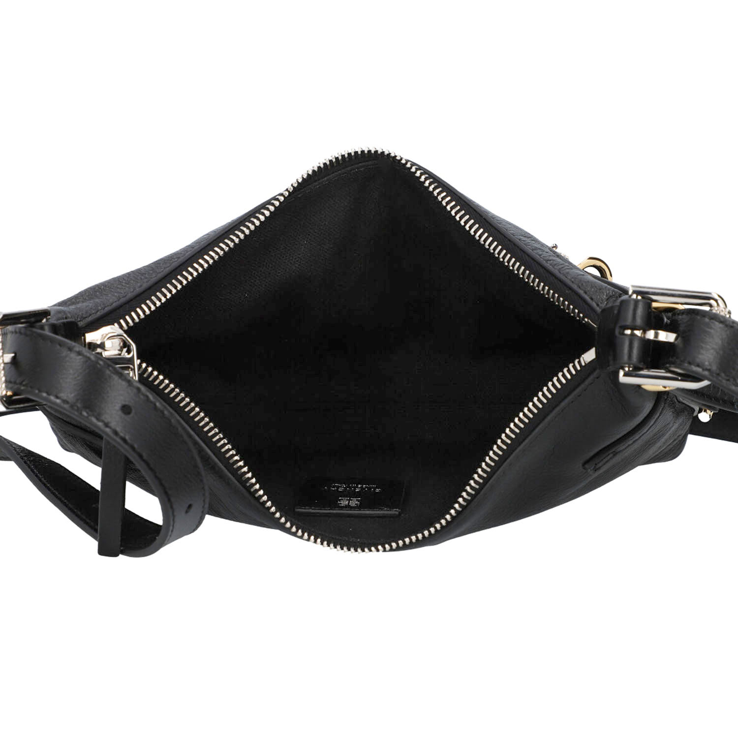Kalbsleder in Schwarz mit Hardware in Bicolore Hardware, dekorativen Riemen auf der Front, einen Reißverschluss und einen längenverstellbaren Schulterriemen. Innenraum aus schwarzem Textil. Staubbeutel anbei. Neuwertig mit Etikett. Maße: 22 x 4 x 15 cm.