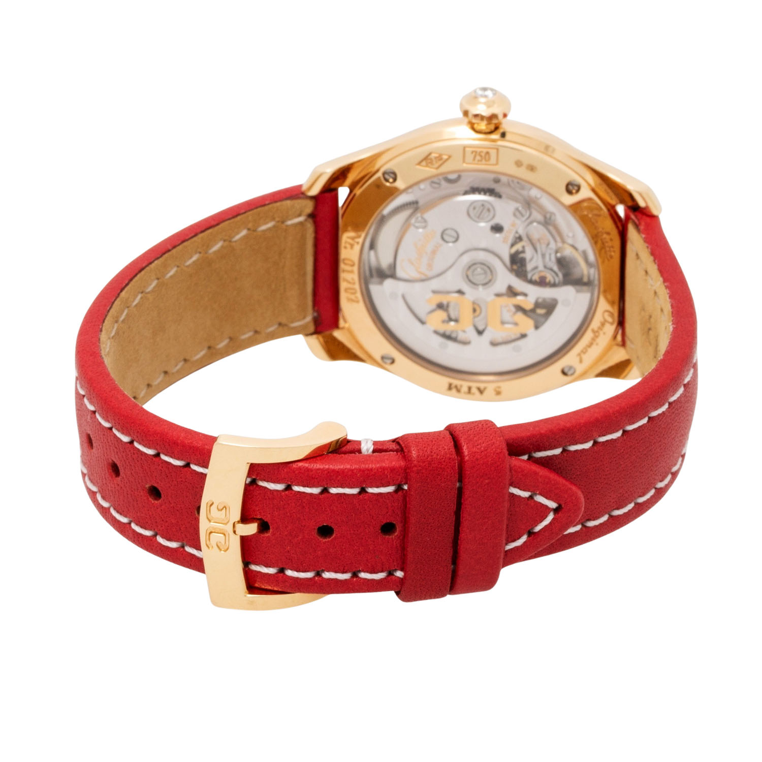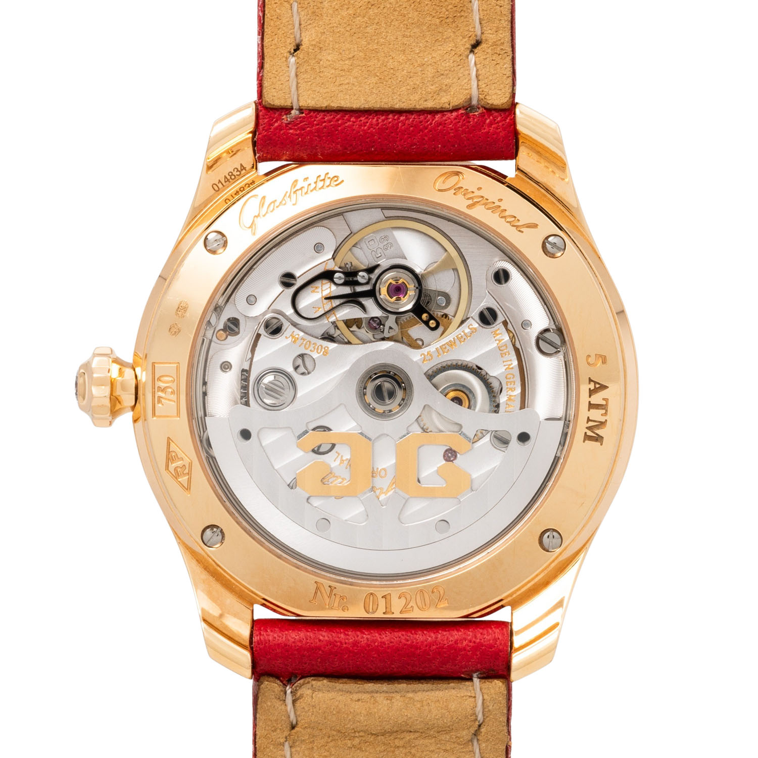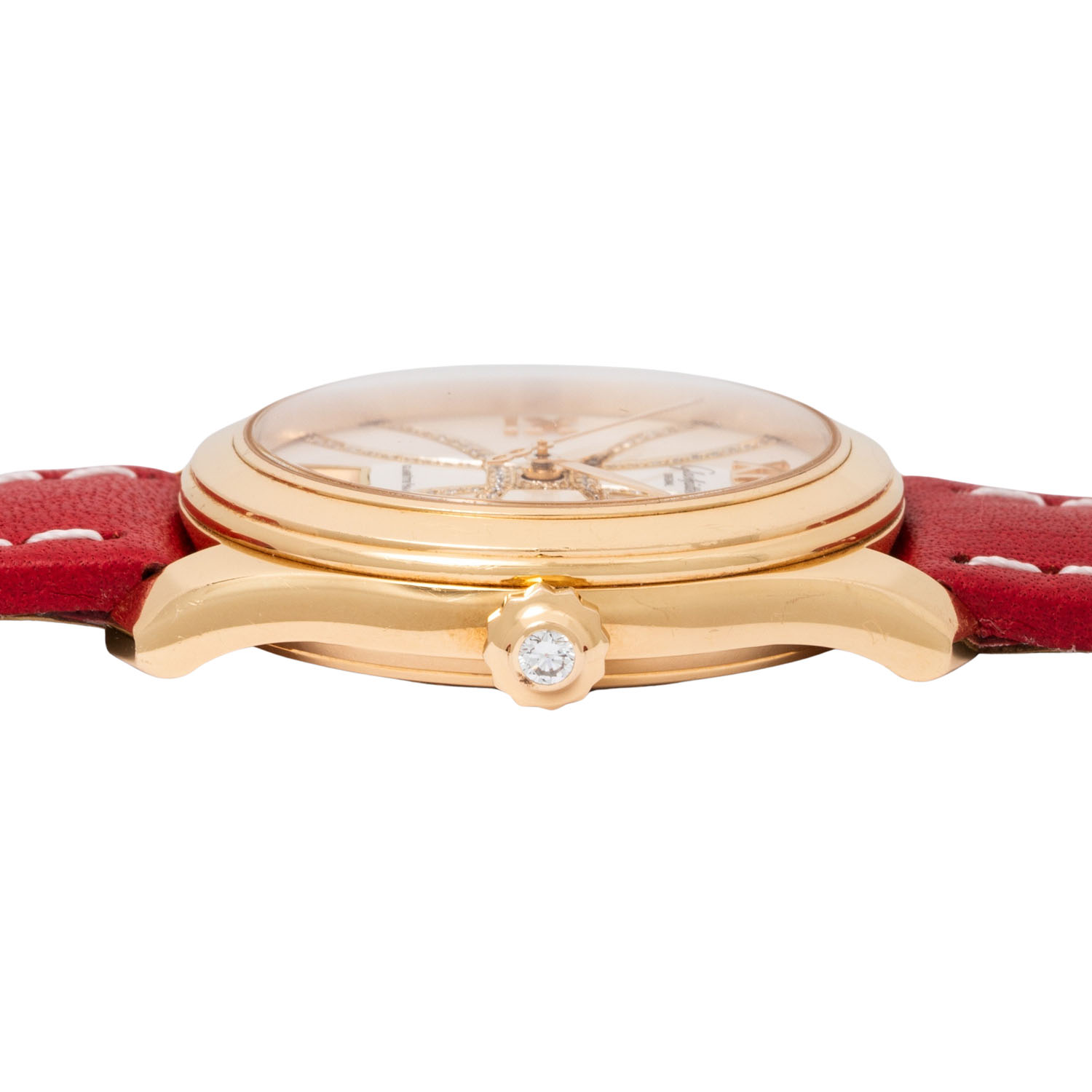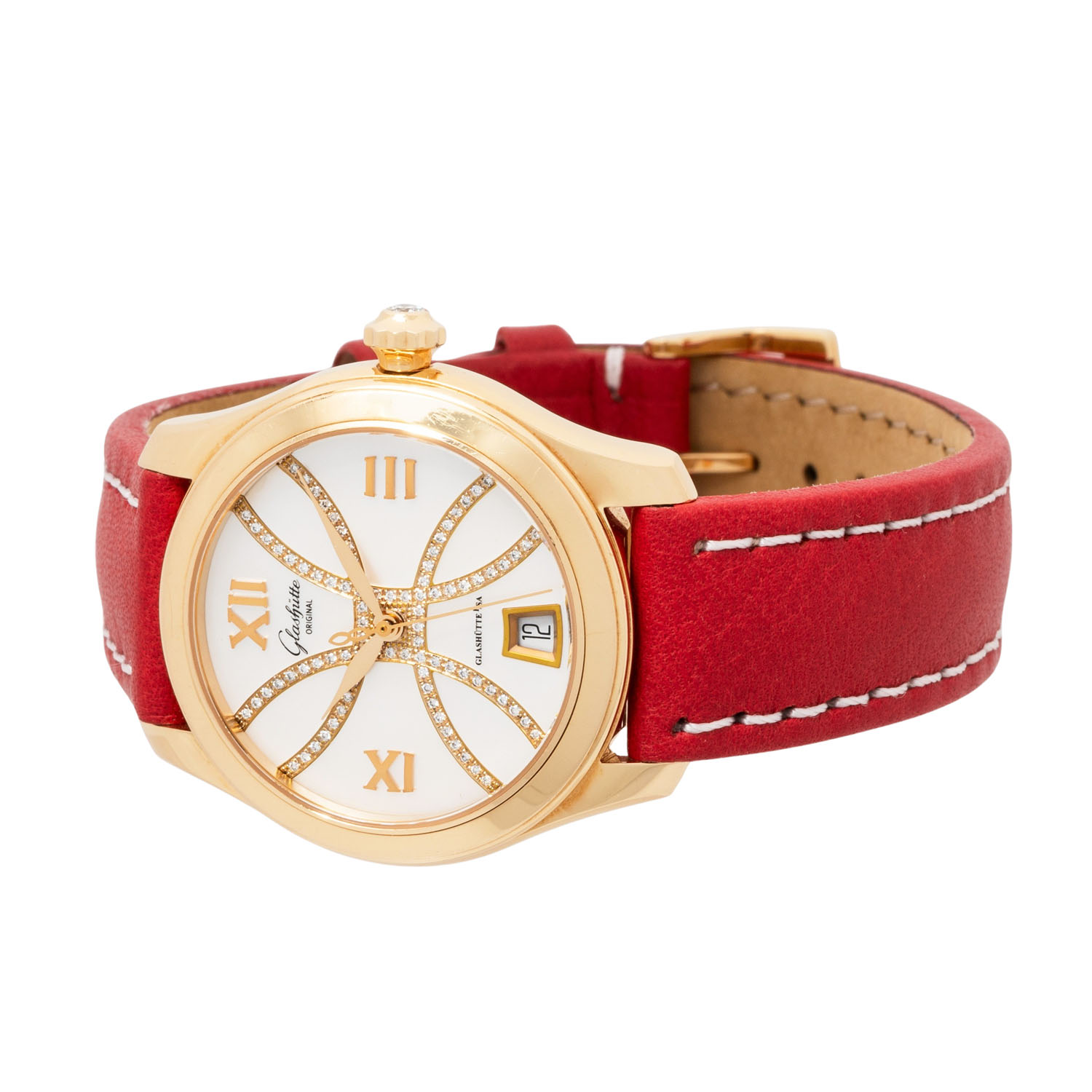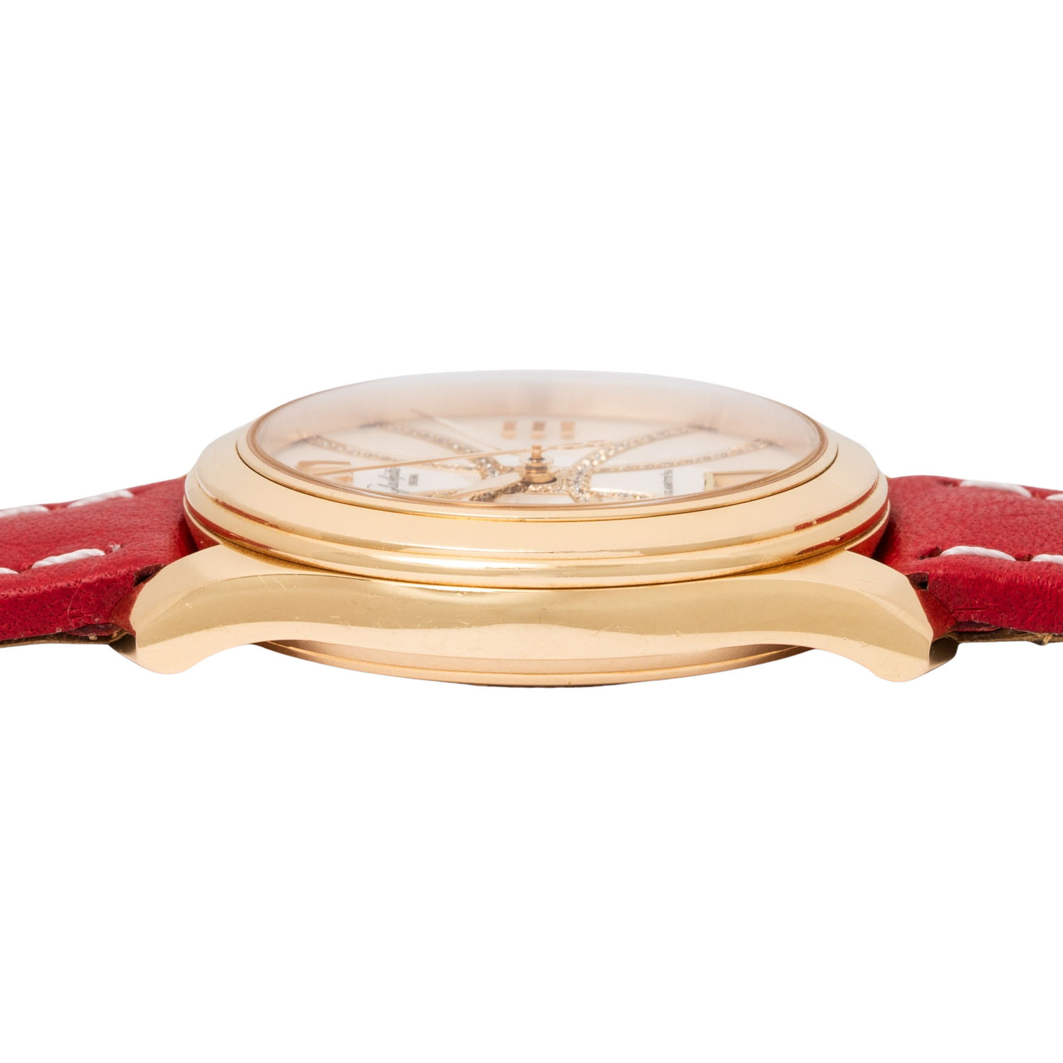 18K Rosegold. Automatik-Werk Kal. 39 mit sehr guten Gangwerten (+7s/d. 266°). Weißes Perlmutzifferblatt mit Factory Diamanten besetzt, römischen Indizes und Datumsanzeige. Die Krone ist mit einem Diamanten besetzt. Neues Lederband mit Glashütte Original Dornschließe in 18K Rosegold. Guter Zustand mit Tragespuren. Durchmesser ca. 36 mm ohne Krone.