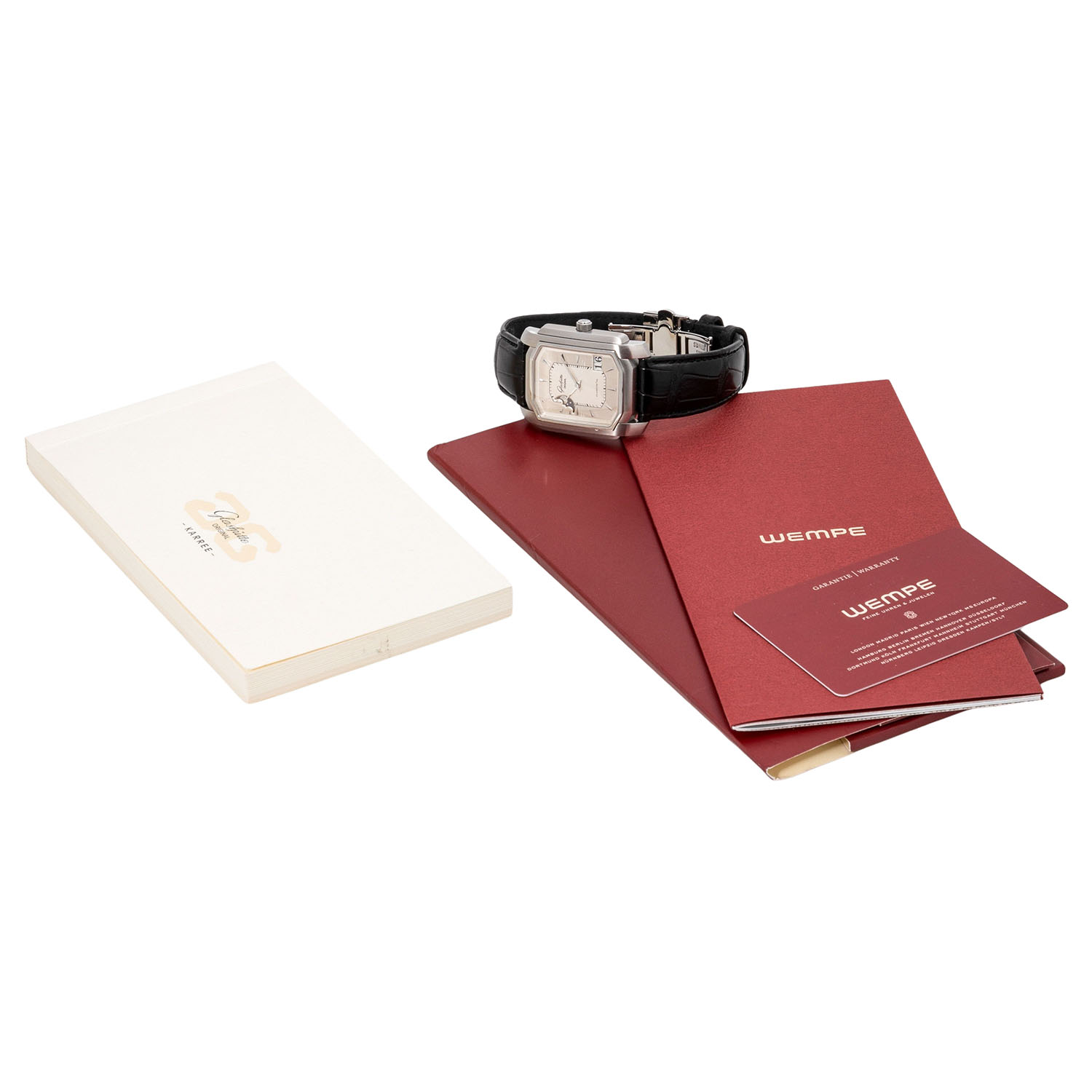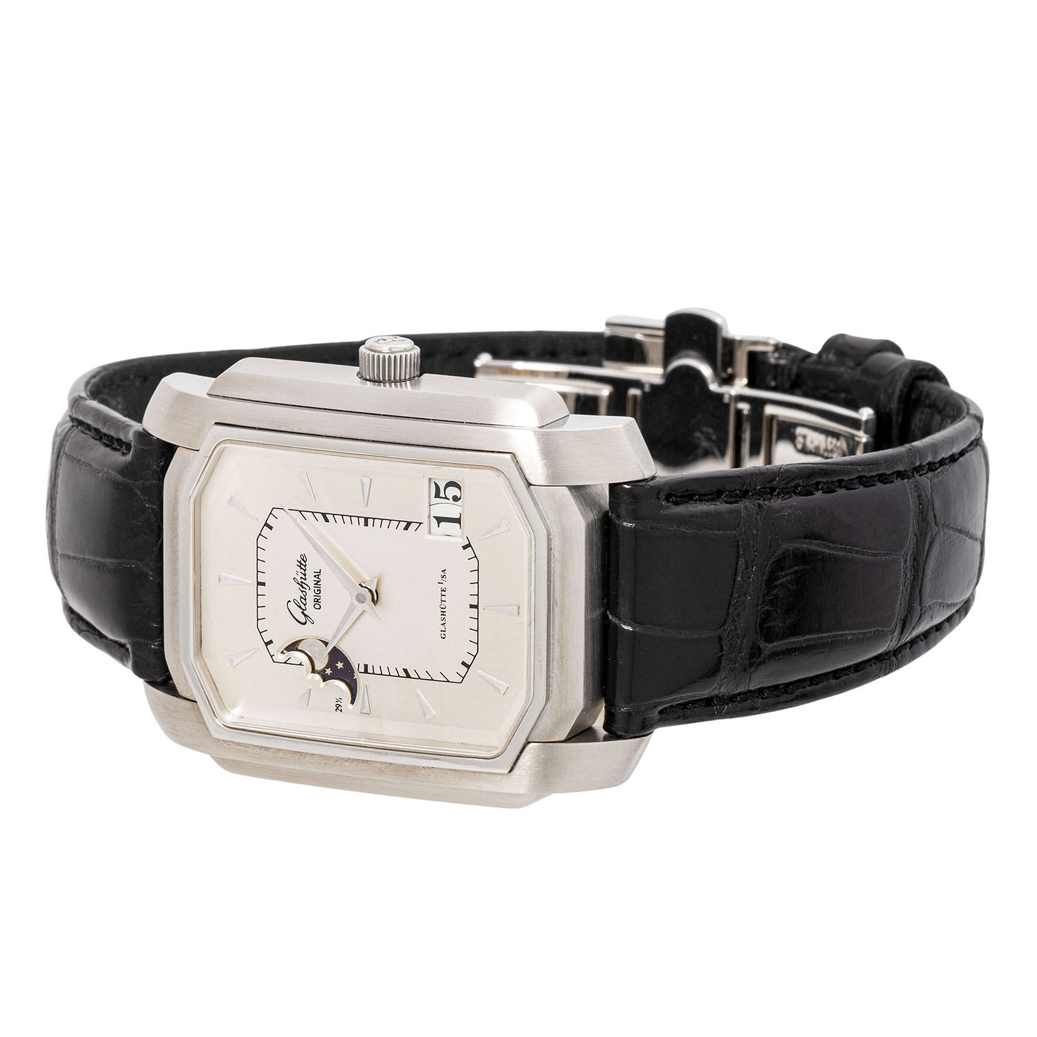 Edelstahl. Glasboden. Automatik-Werk Kal. GUB 39-43 mit sehr guten Gangwerten (+8s/d. 296°). Silberfarbenes Zifferblatt mit Pfeilindizes, Mondphase und Datumsanzeige. Glashütte Lederband mit Faltschließe aus Edelstahl. Sehr guter Zustand mt leichten Tragespuren. Erstkafrechnung, Anleitung, Wempe Heft, Einstellstift, Revisionsnachweis vom Juni 2015 und Garantiekarte anbei. Gekauft im Februar 2005 bei Juwelier Wempe in Stuttgart. Durchmesser ca. 35 mm (gemessen ohne Krone). Passend bis zu ca. 20 cm Handgelenkumfang.