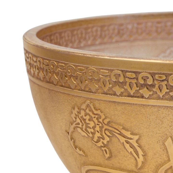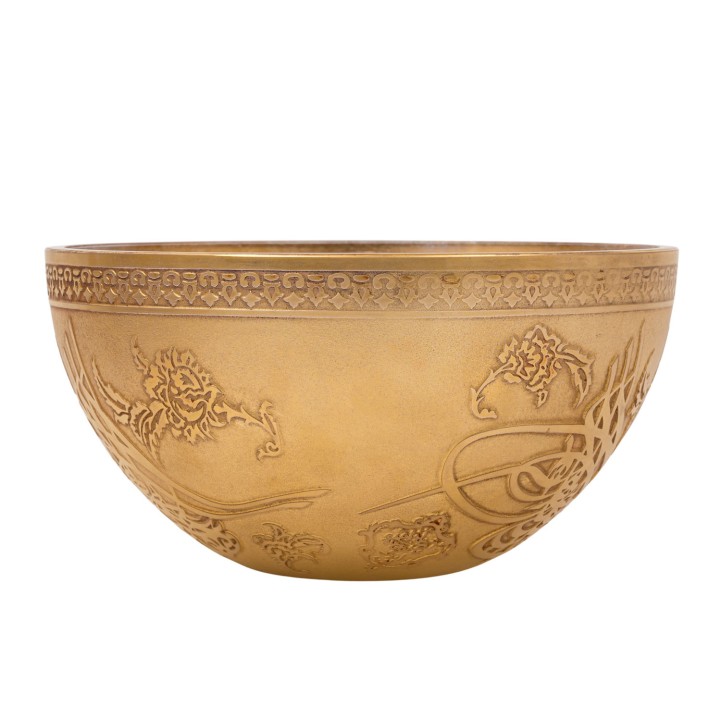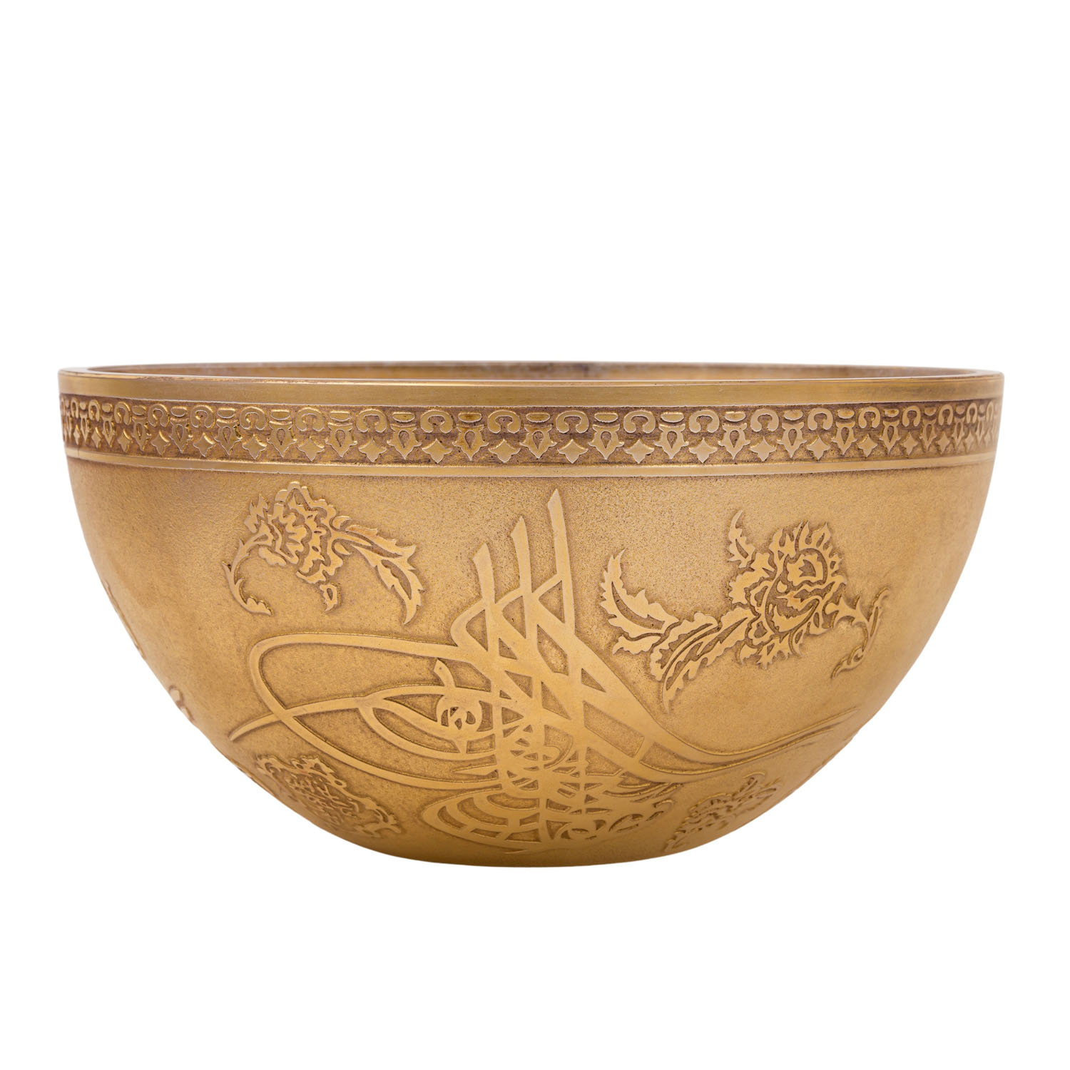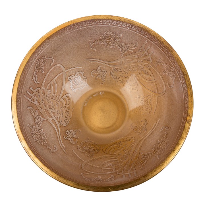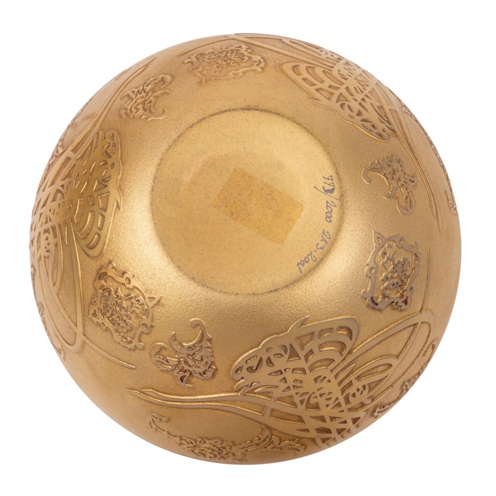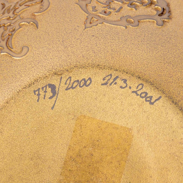 Aus schwerem, farblosem Glas, mit Reliefdekor von Sultan-Sigaturen des Osmanischen Reichs, mit goldenem Überfang, Jubiläumsausgabe 773/2000. Im dazugehörenden Holzkasten. D 22 cm, Altersspuren.