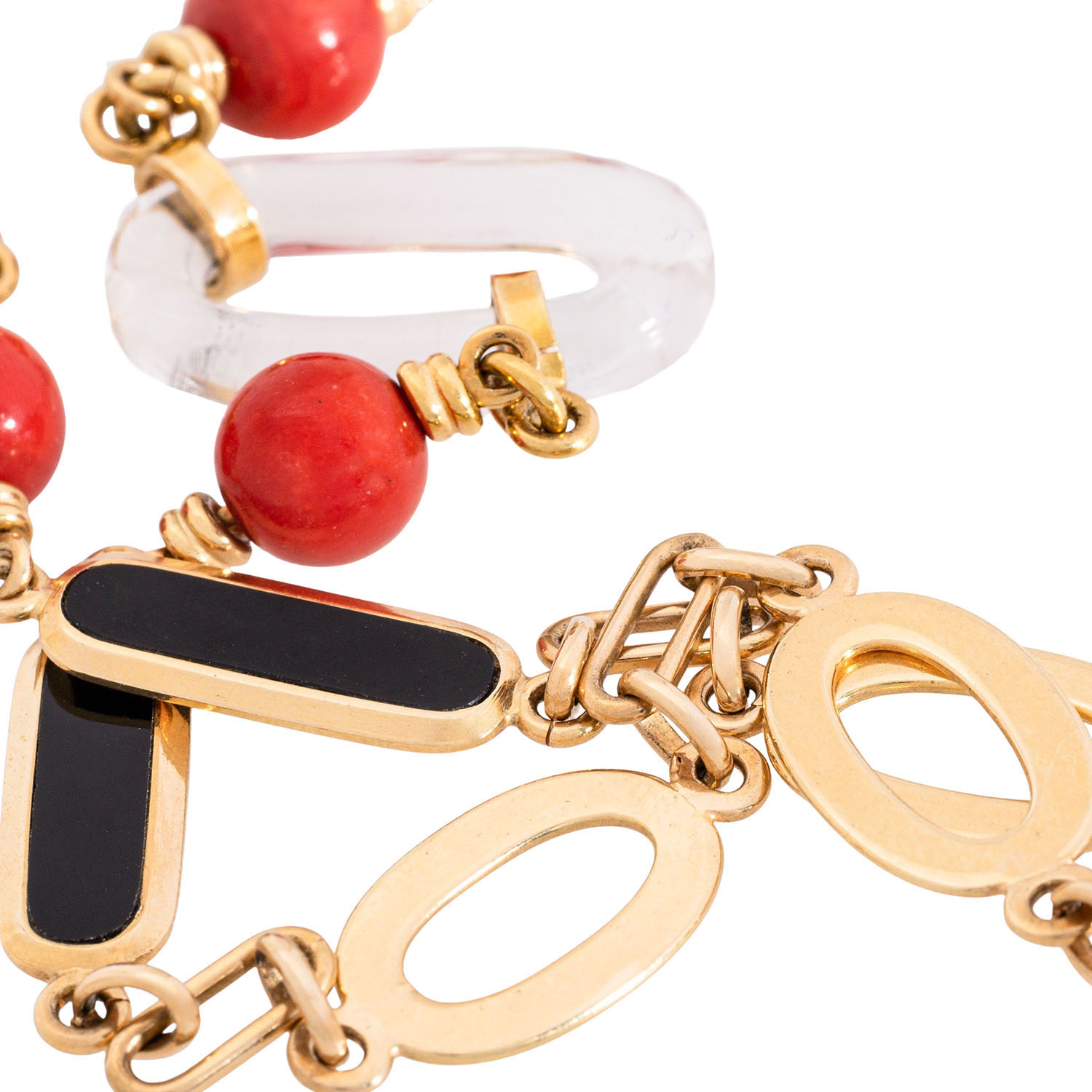 Gliederkette, mit Onyxplatten, Kunststoffösen und Korallenkugel besetzt.
