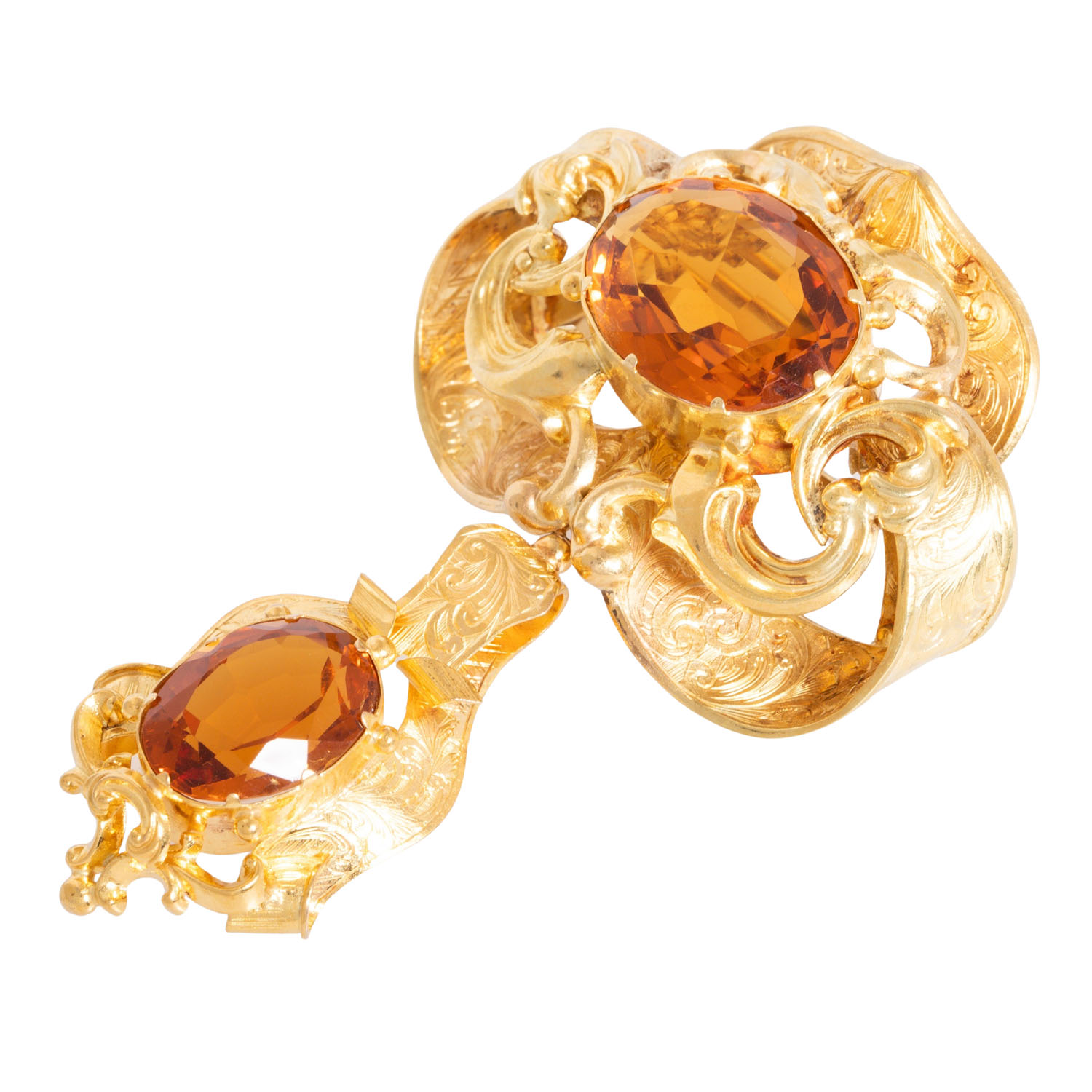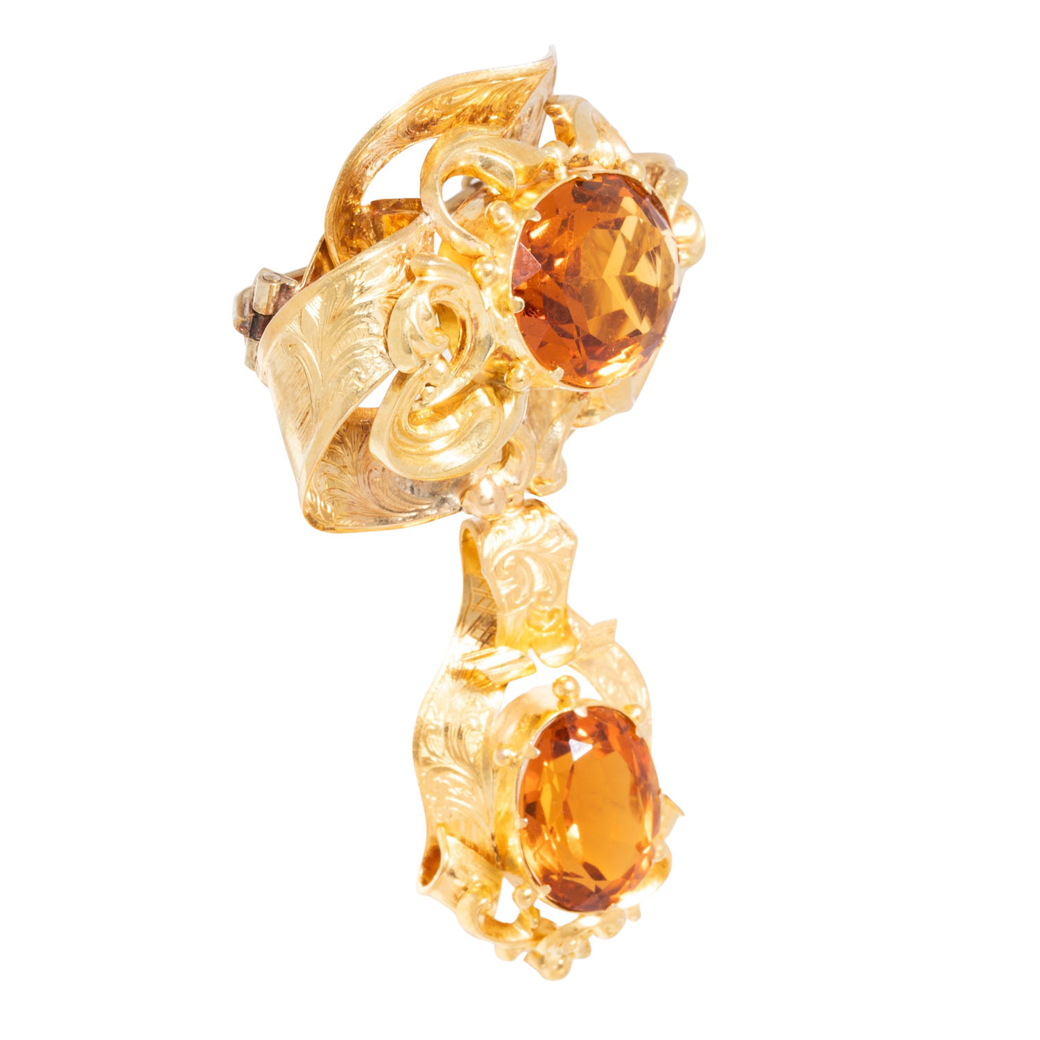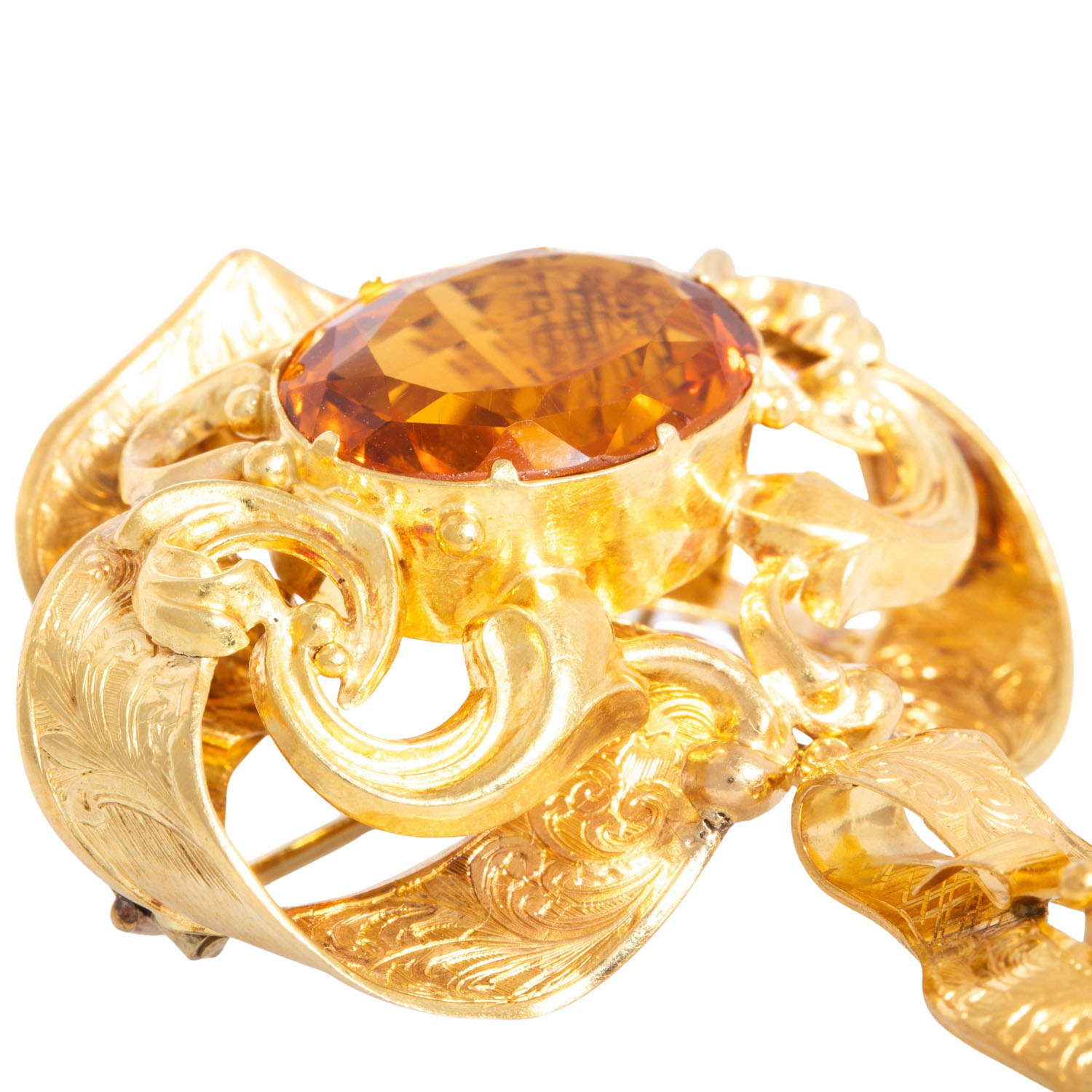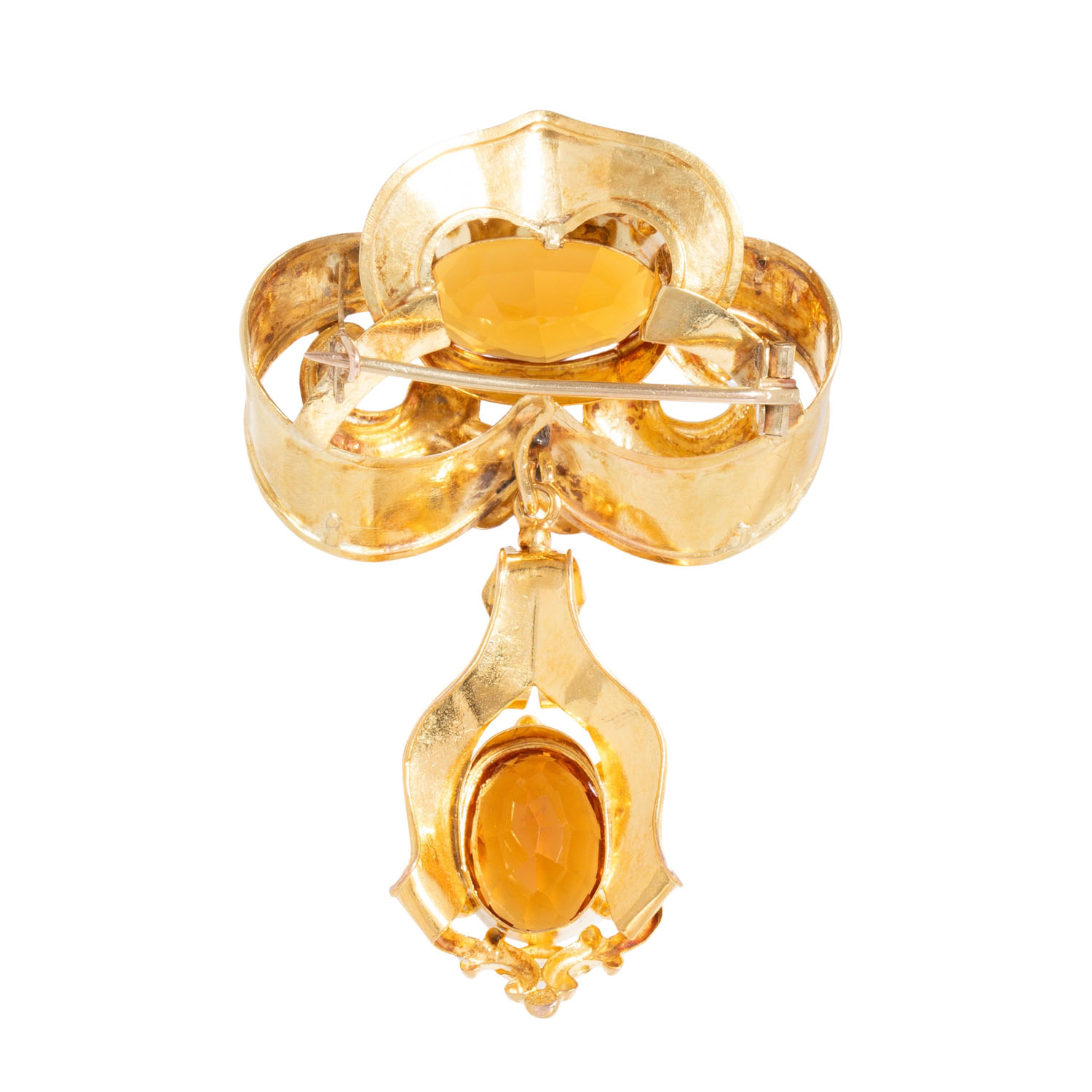 besetzt mit facettierten Citrinen, GG 15K, 13,2 g, Länge ca. 6 cm, sehr guter Zustand, Abhängung abnehmbar. Lt. beiligender Expertise Mitte 19. Jh.; lt. Meinung der Eppli Experten jedoch eine Replik aus dem späten 20. Jh.