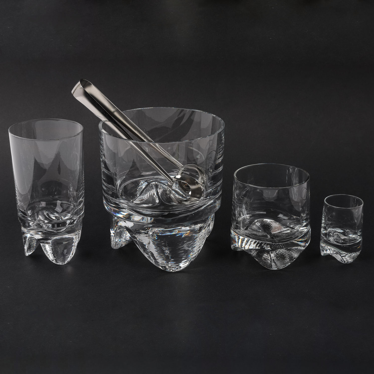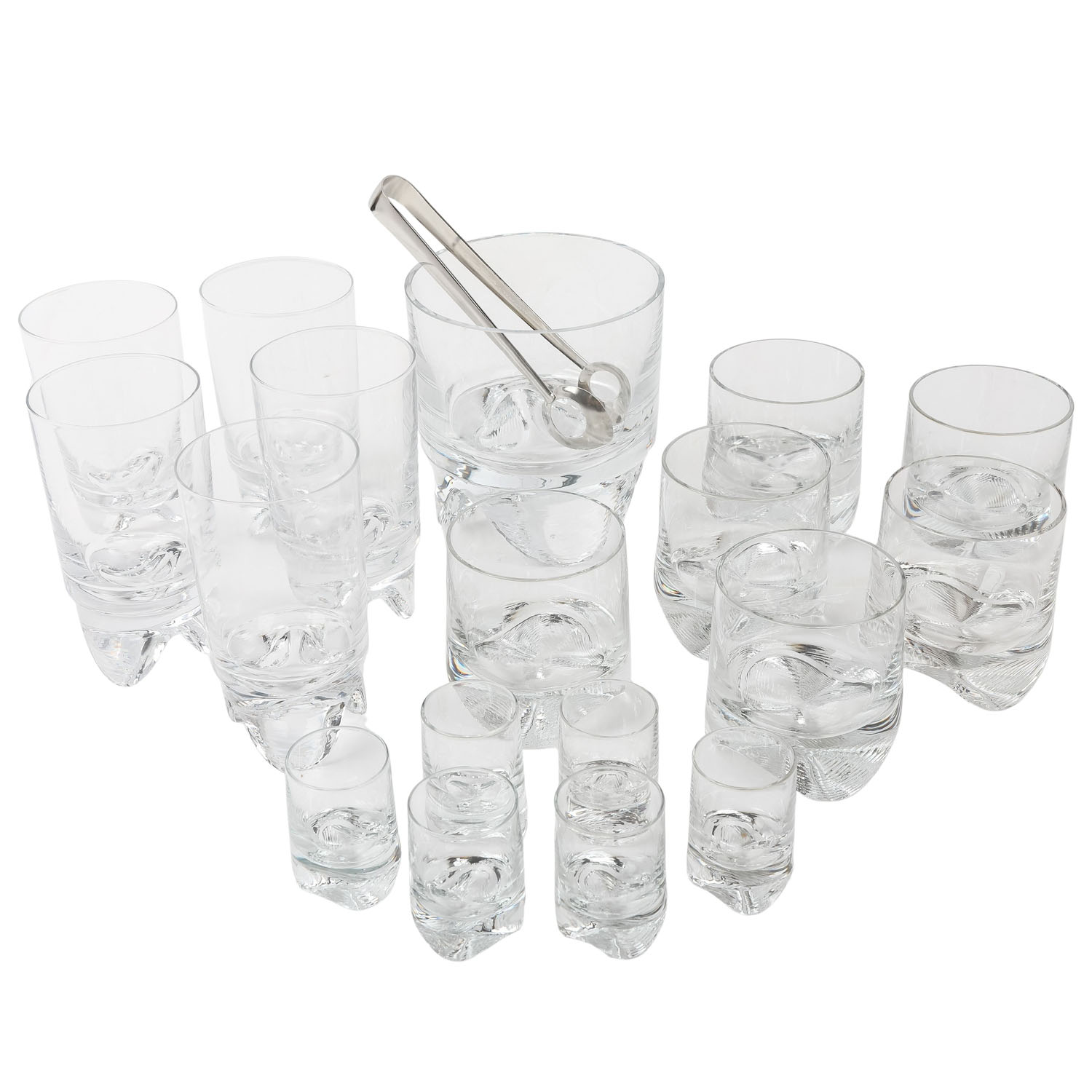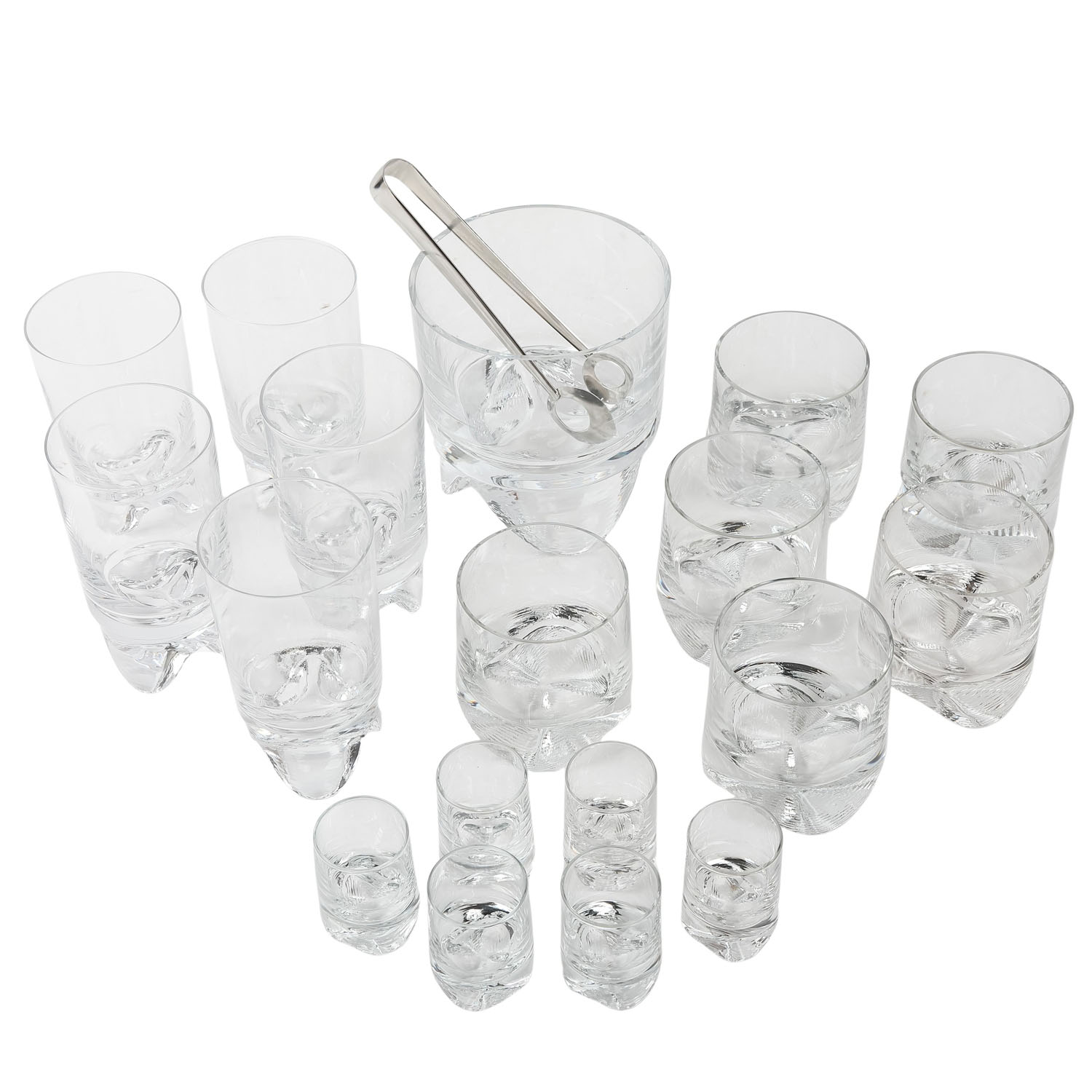 Farbloses Kristallglas, 6 Whiskygläser (H. ca. 9 cm), 6 Schnapsgläser (H. ca. 6), 5 Longdrinkgläser (H. ca. 14), 1 Eiskübel (H. ca. 14,6) und 1 Eiszange.