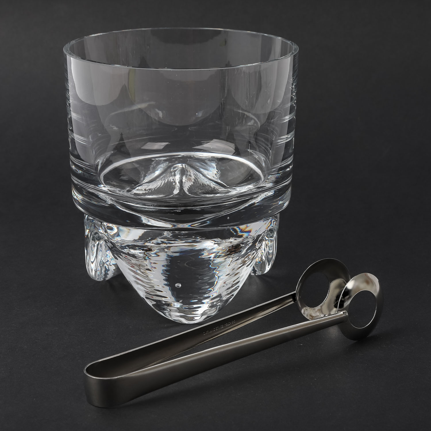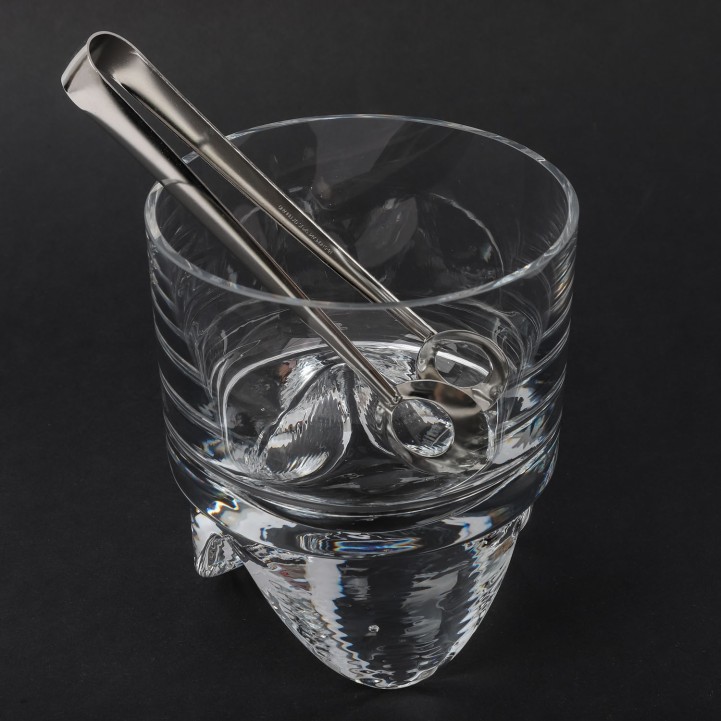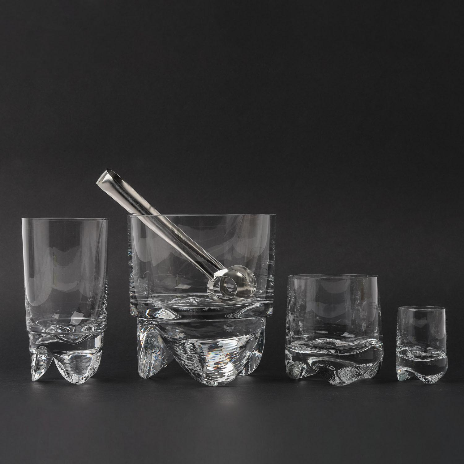 Farbloses Kristallglas, 6 Whiskygläser (H. ca. 9 cm), 6 Schnapsgläser (H. ca. 6), 5 Longdrinkgläser (H. ca. 14), 1 Eiskübel (H. ca. 14,6) und 1 Eiszange.