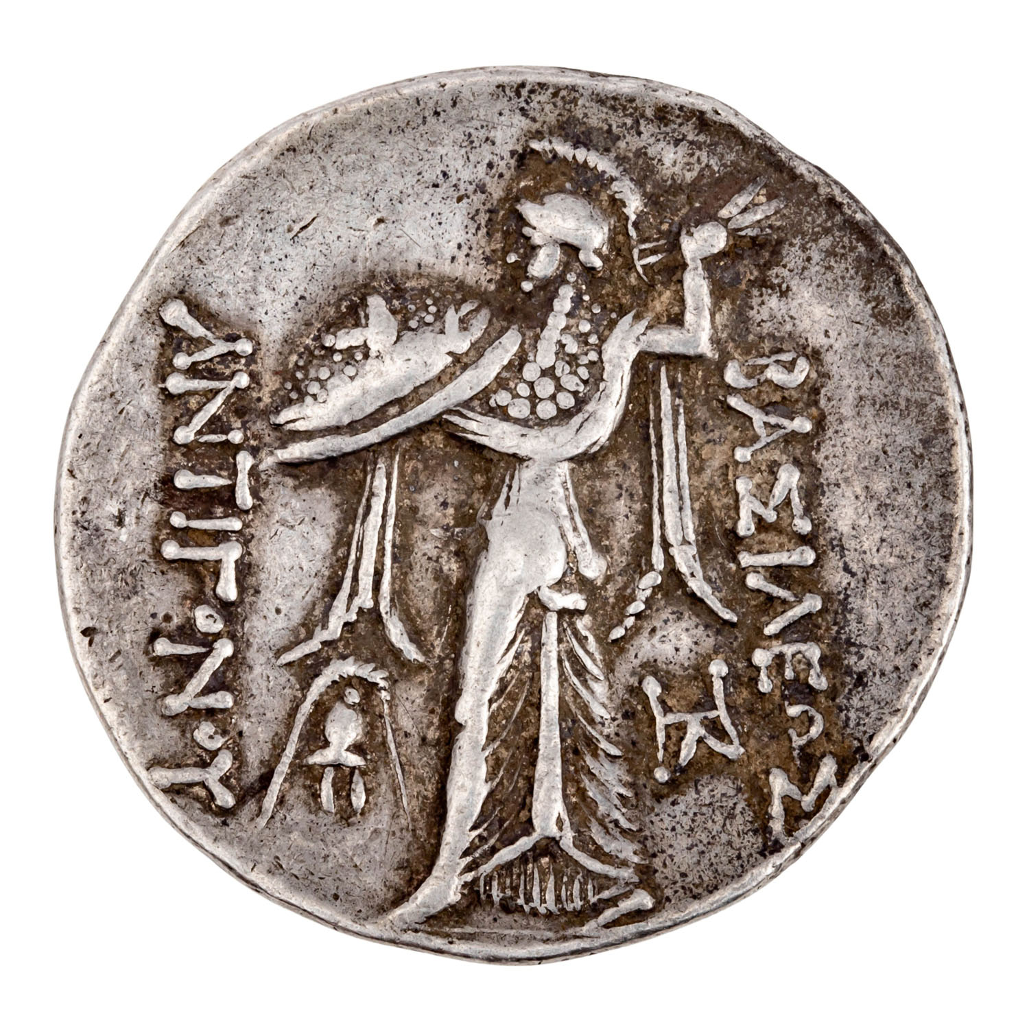 Amphipolis, ca. 17,12g, Dm. ca. 30,7 mm, ss; Avers: Makedonischer Schild, im Zentrum Panbüste mit Pedum nach links gerichtet / Revers: ΒΑΣΙΛΕΩΣ ΑΝΤΙΓΟΝΟΥ, Athena Alkis schreitet nach links mit Gorgonenschild und Keraunos; Makedonenhelm und Monogramm.