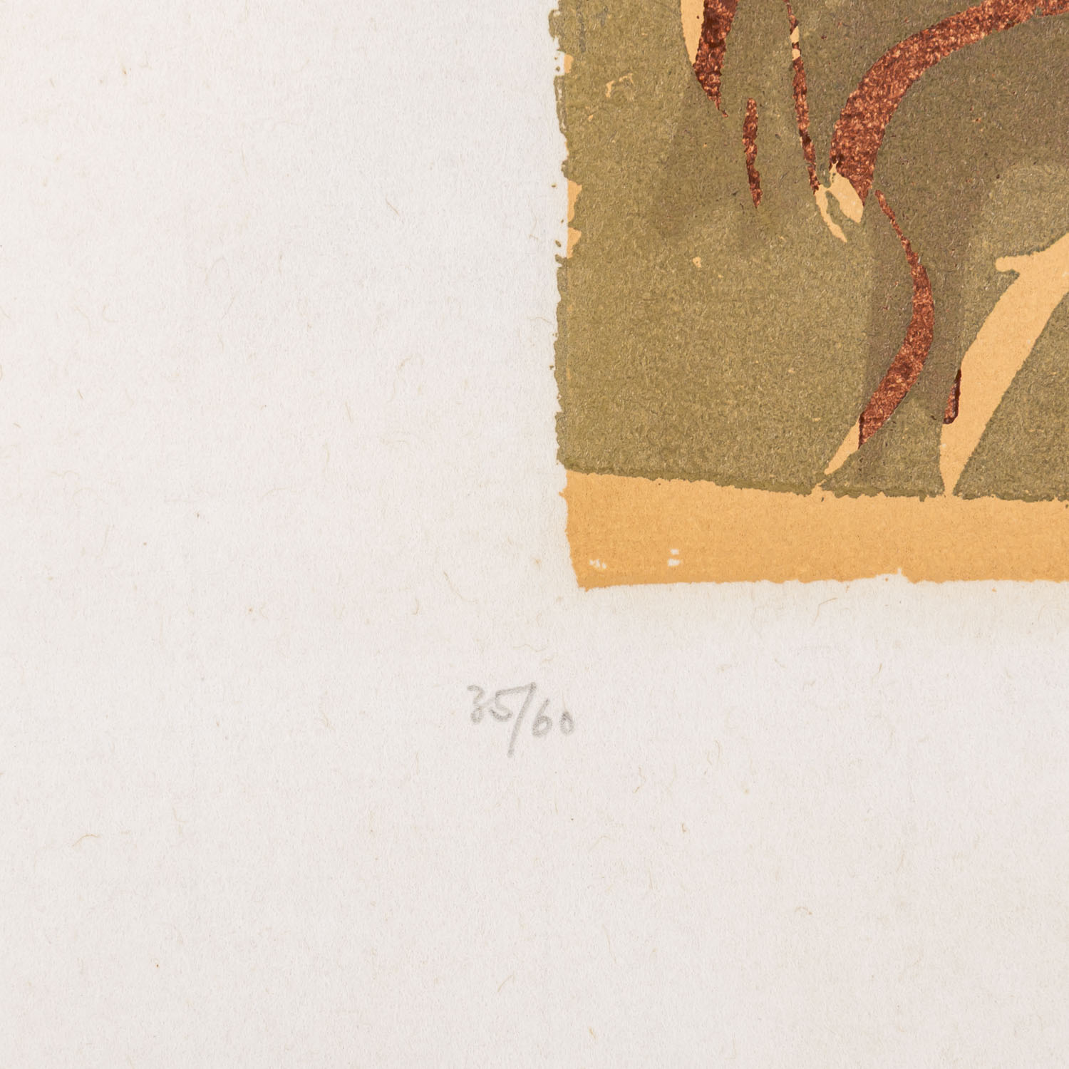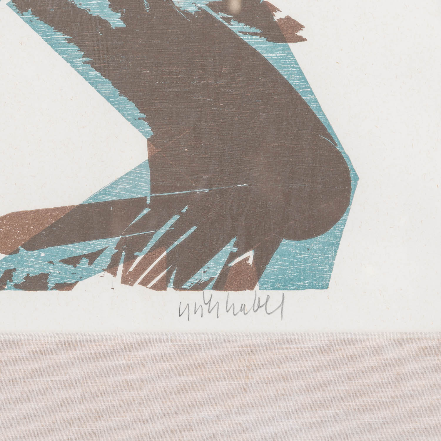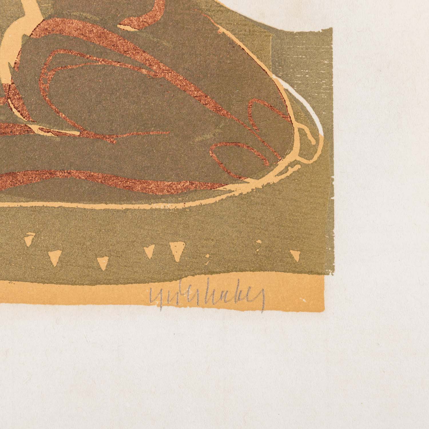1.) 'Das andere Ufer vor Augen', Farbholzschnitt (ocker, braun und Goldton)/Bütten, u.re. mit Bleistift von Hand signiert, u.li. mit Bleistift num. 35/60, HxB: Platte ca. 21,5x16,5 cm, Blatt ca. 39,5x28 cm. Gebräunt und part. fleckig. Ohne Rahmen; 2.) 'Die Füße des Donners', Farbholzschnitt/Papier, u.re. mit Bleistift von Hand signiert, HxB: Platte ca. 38x28,5 cm, Passepartoutausschnitt ca. 40x28 cm. Außenmaß Rahmen ca. 58x45 cm. Altersspuren, leicht gewellt. Im Passepartout hinter Glas gerahmt.