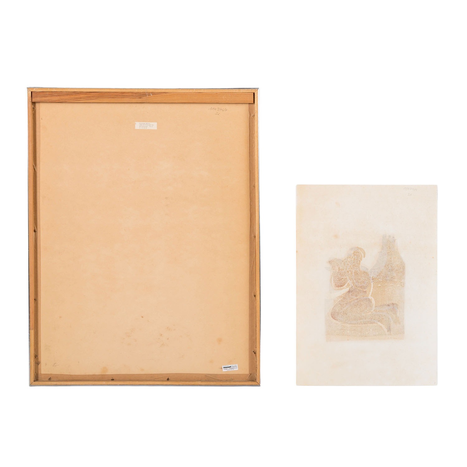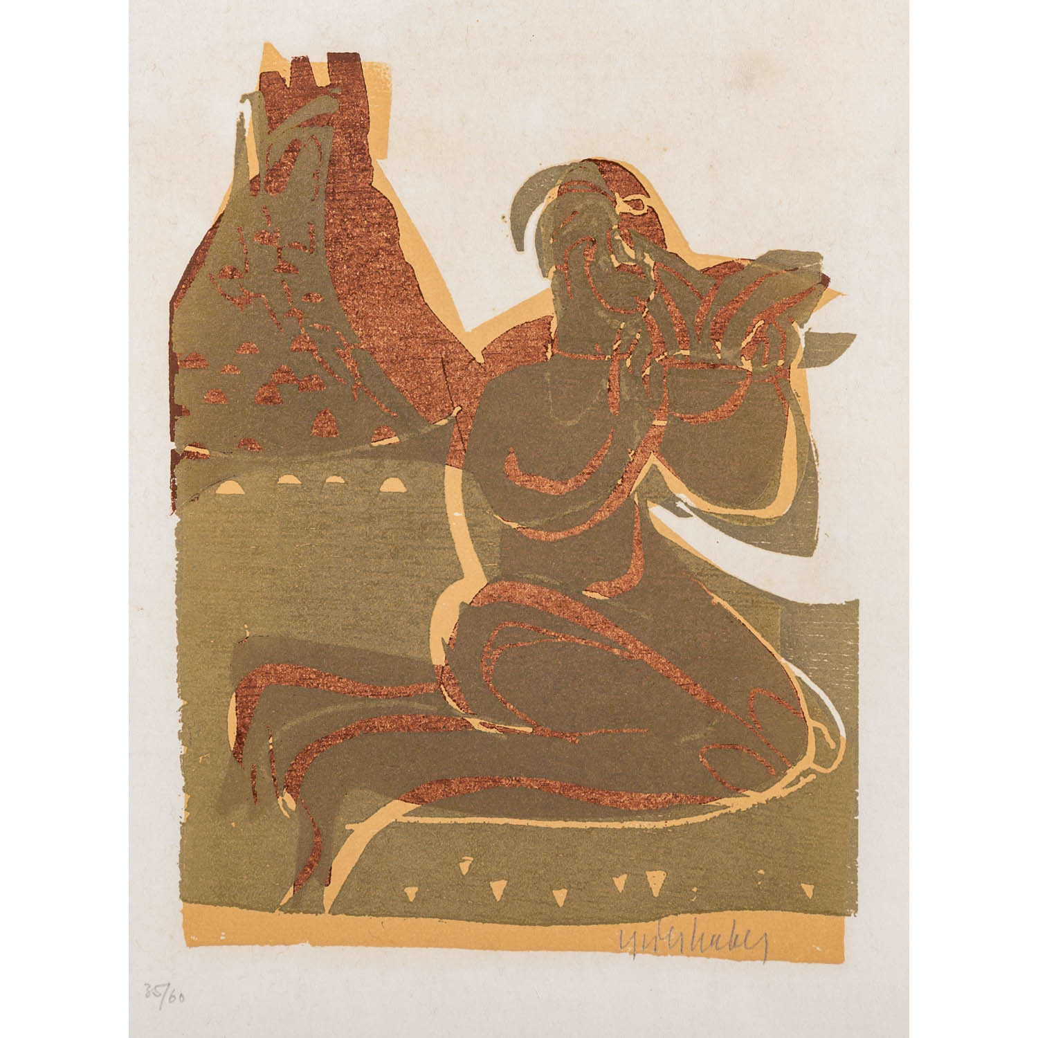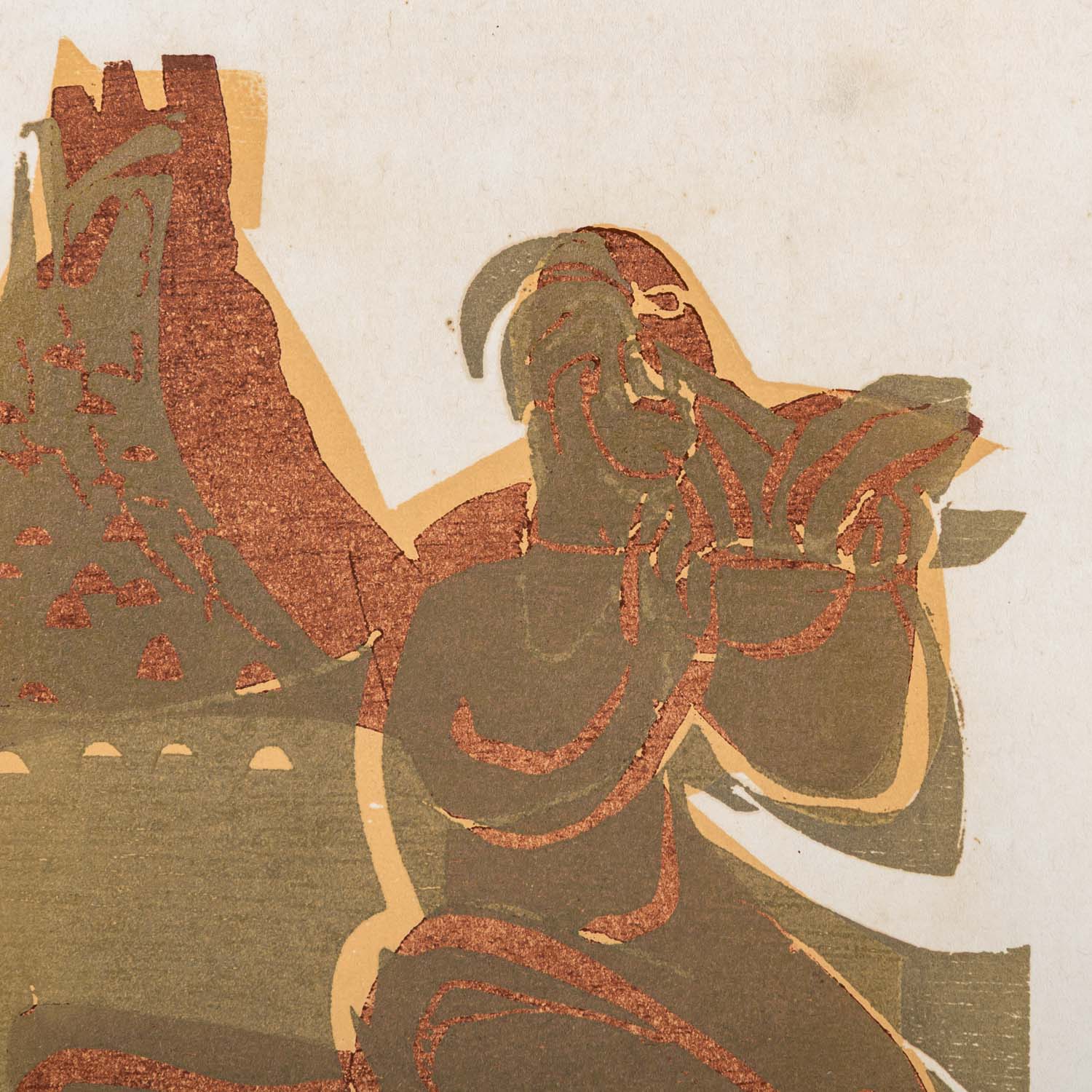 1.) 'Das andere Ufer vor Augen', Farbholzschnitt (ocker, braun und Goldton)/Bütten, u.re. mit Bleistift von Hand signiert, u.li. mit Bleistift num. 35/60, HxB: Platte ca. 21,5x16,5 cm, Blatt ca. 39,5x28 cm. Gebräunt und part. fleckig. Ohne Rahmen; 2.) 'Die Füße des Donners', Farbholzschnitt/Papier, u.re. mit Bleistift von Hand signiert, HxB: Platte ca. 38x28,5 cm, Passepartoutausschnitt ca. 40x28 cm. Außenmaß Rahmen ca. 58x45 cm. Altersspuren, leicht gewellt. Im Passepartout hinter Glas gerahmt.