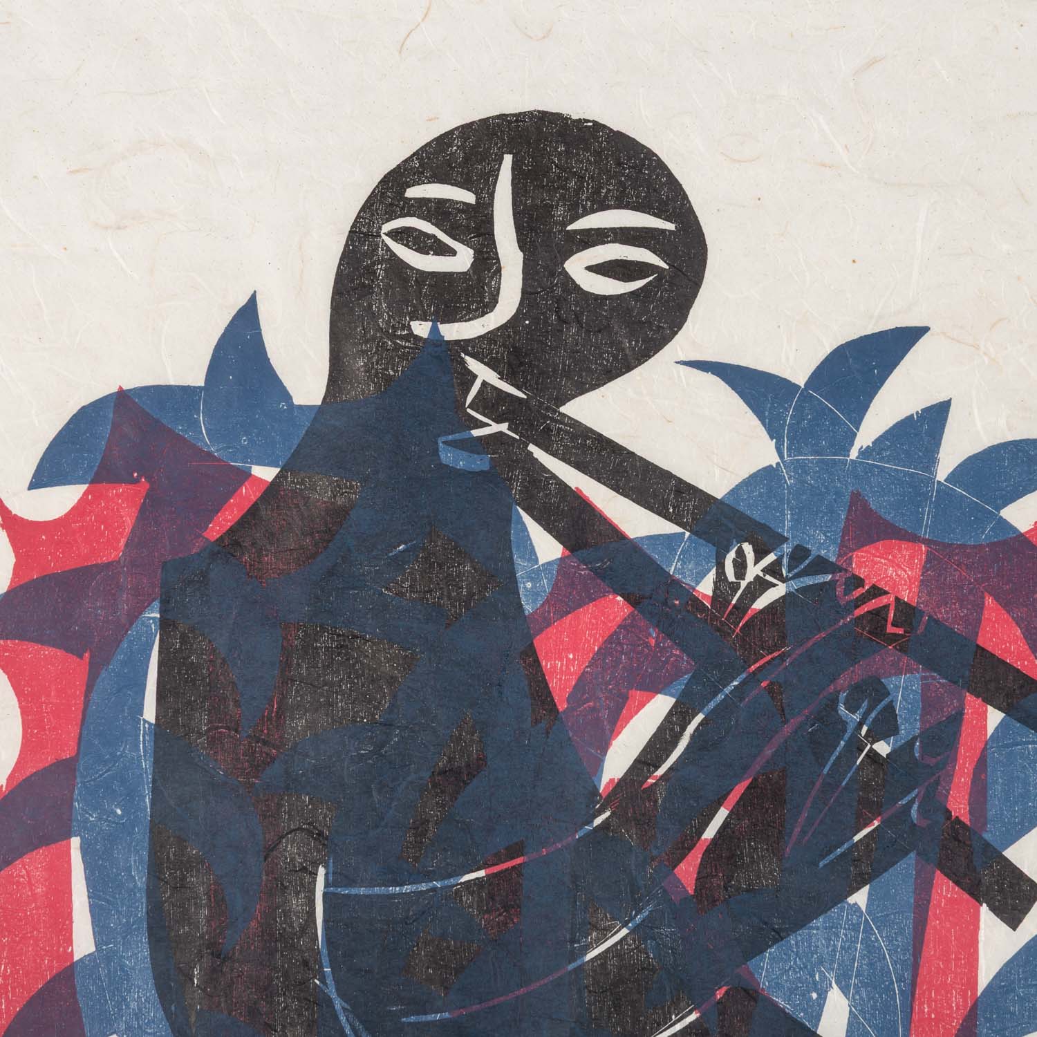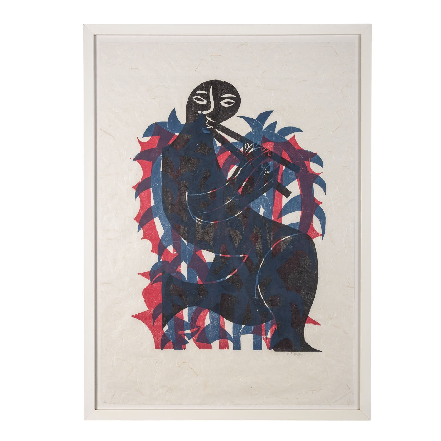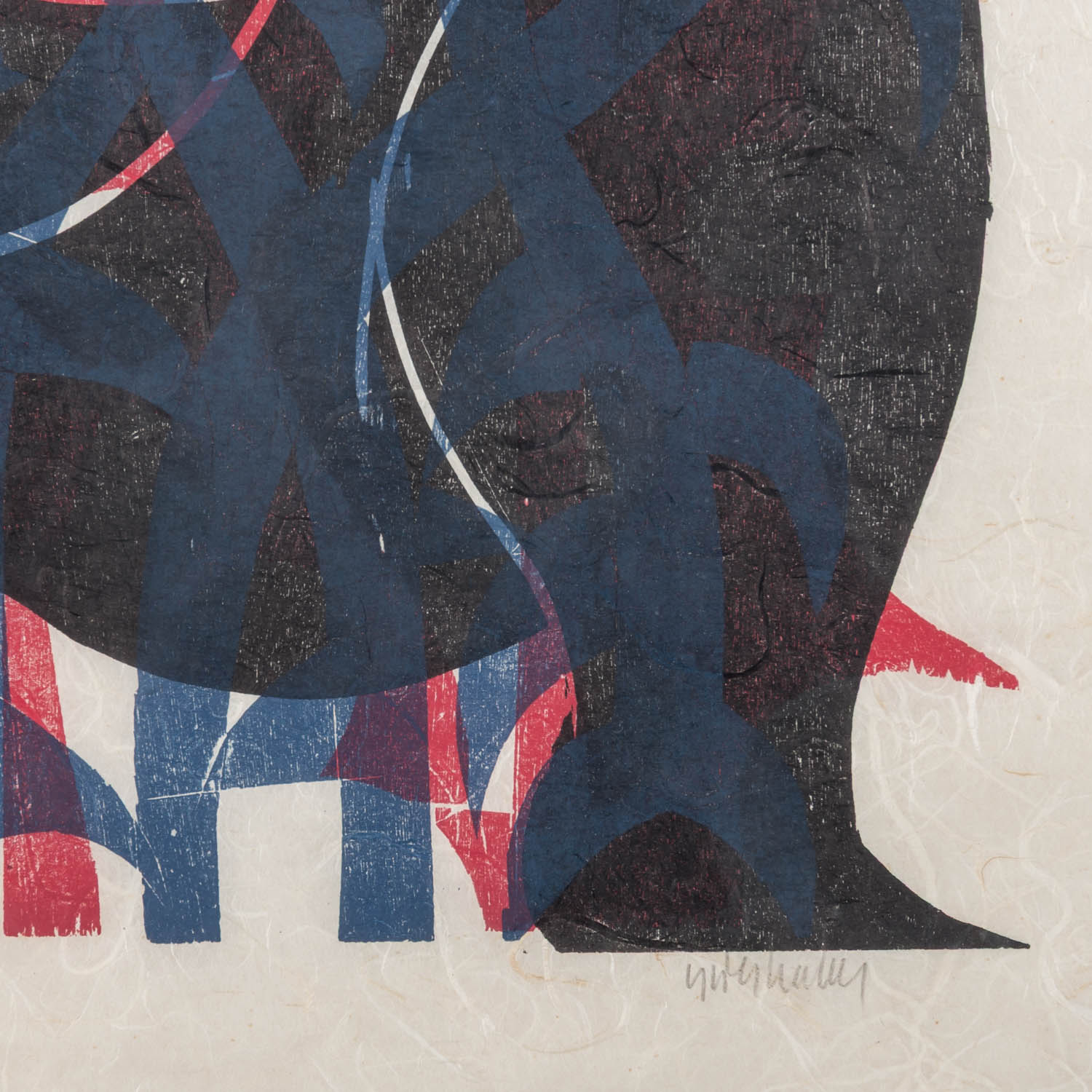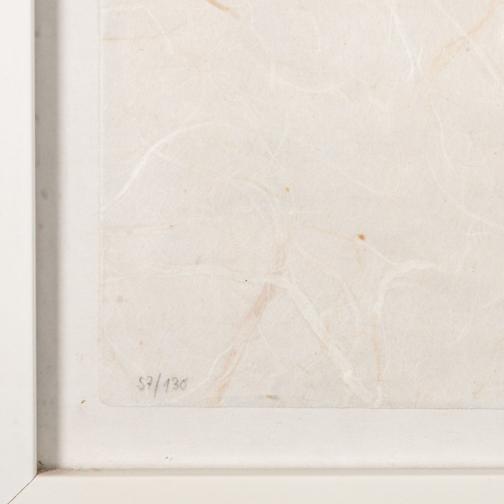 Farbholzschnitt/Japanpapier, u.re. mit Bleistift von Hand signiert, u.li. mit Bleistift num. 57/130, HxB: Platte ca. 74x54 cm, Blatt ca. 100x70 cm, Außenmaße Rahmen ca. 109x79 cm. Alters- und Knickspuren, leicht gewellt und gebräunt. Mit verglastem Rahmen. VERSO Etikett Kunsthaus Schaller, Stuttgart mit Bezeichnung.