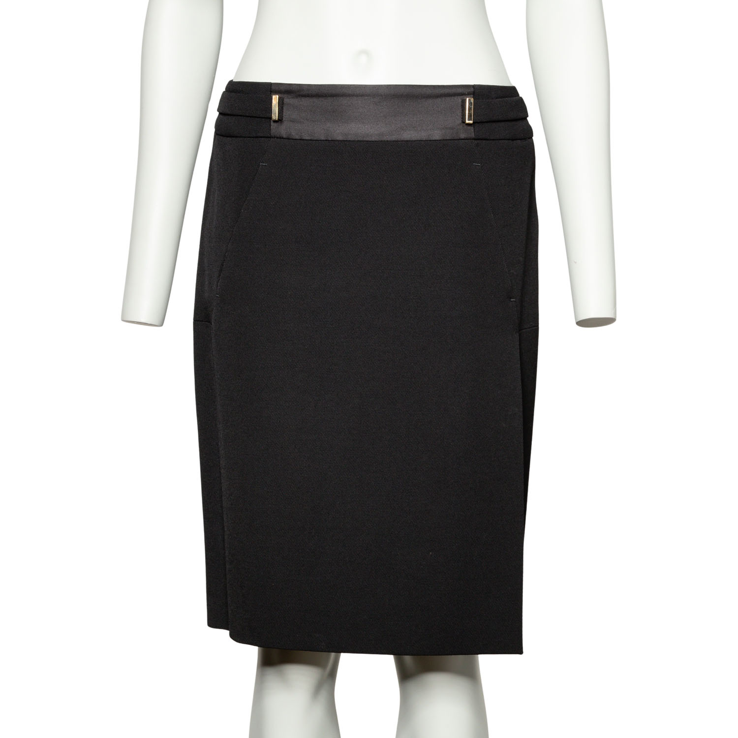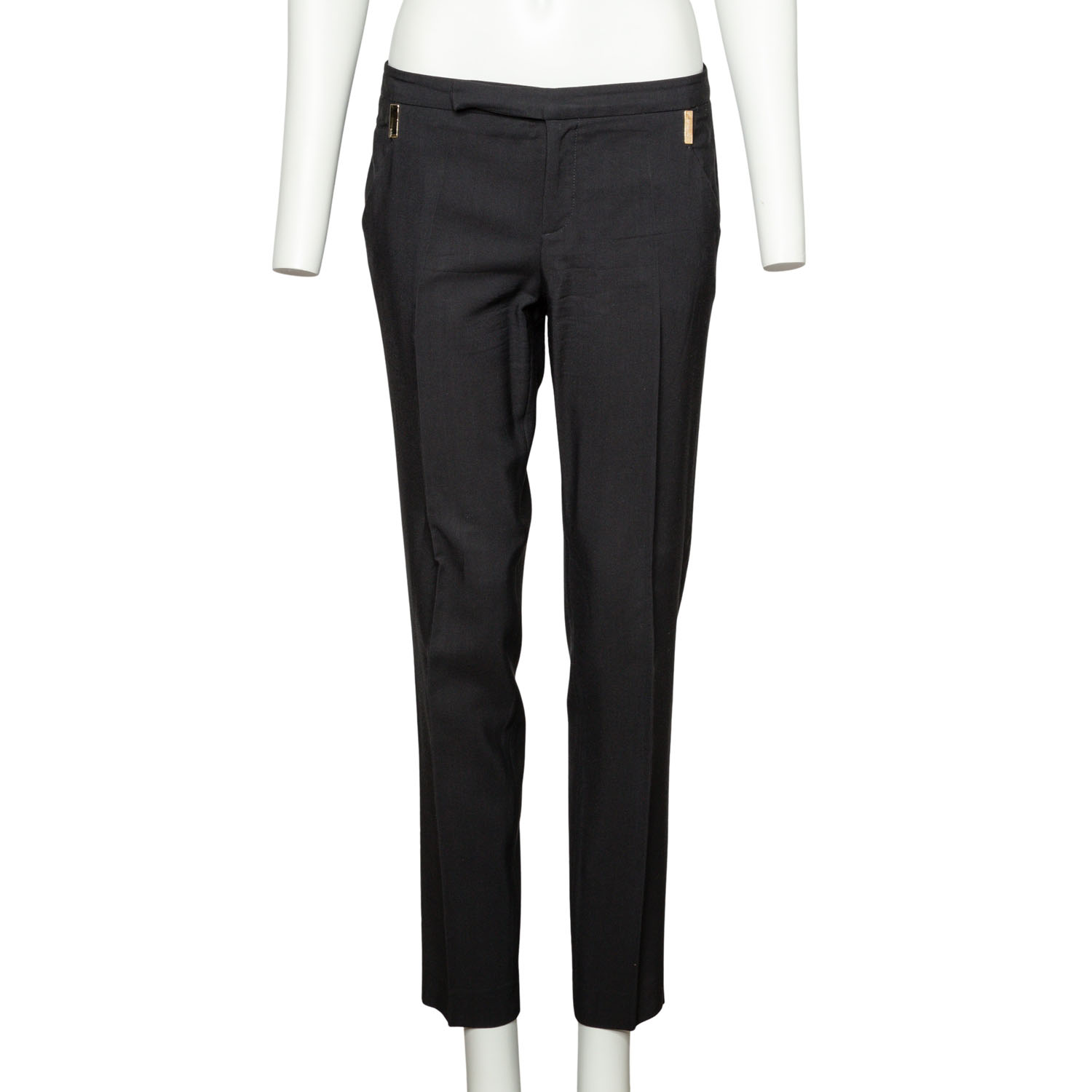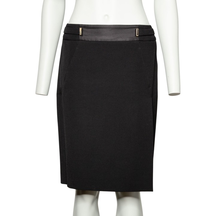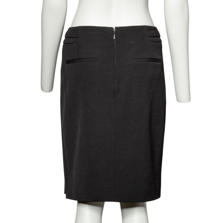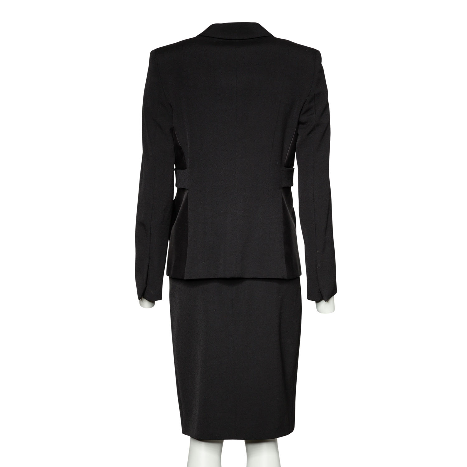 Wolle und Seide. Modell in Schwarz mit goldfarbenen Akzenten, Knopfverschluss, Reverskragen und dekorativen Einsätzen entlang der Seitennaht. Passende Hose und Rock anbei. Guter Erhaltungszustand.