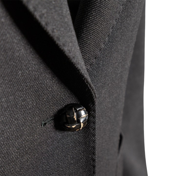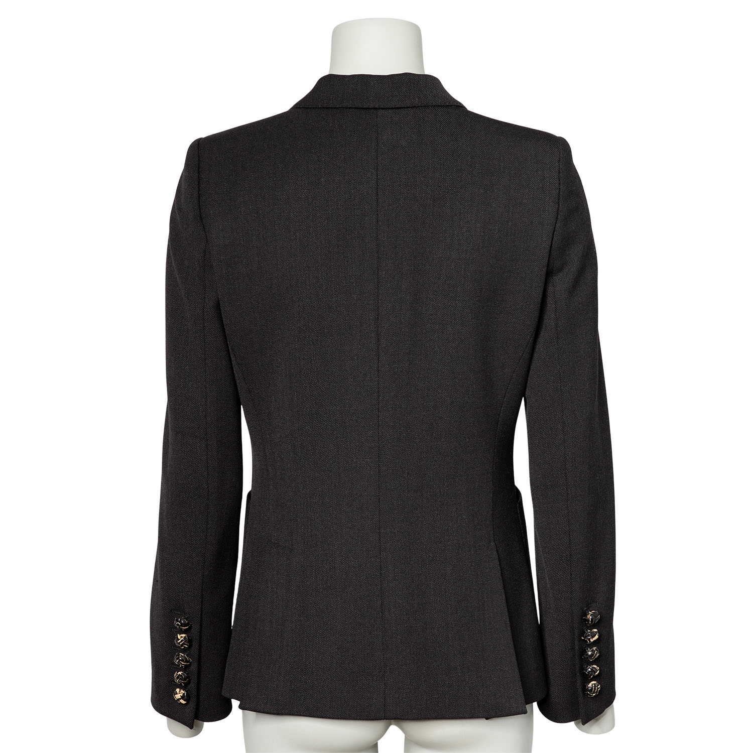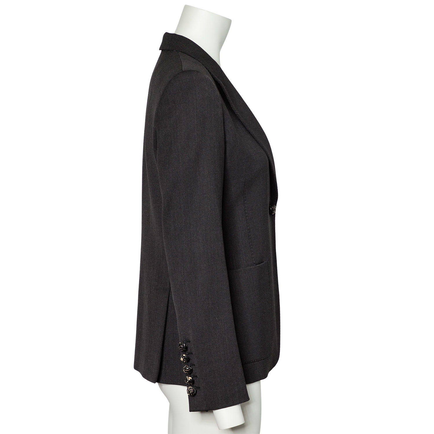 Wollgemisch in Anthrazit mit schmalem Reverskragen, einer Brusttasche, zwei aufgesetzte Eingrifftaschen und dekorative Lederknöpfe (leicht beschädigt). Guter Erhalt.