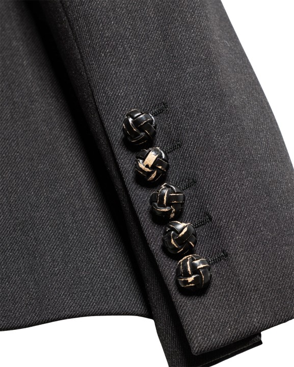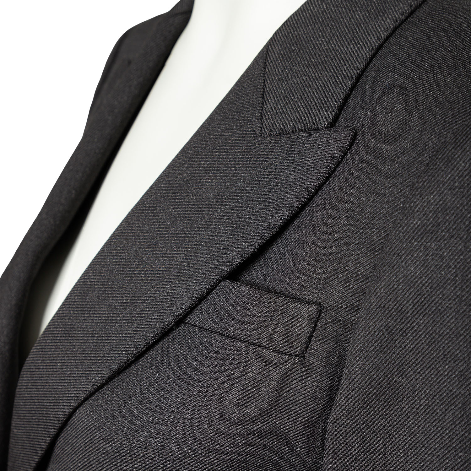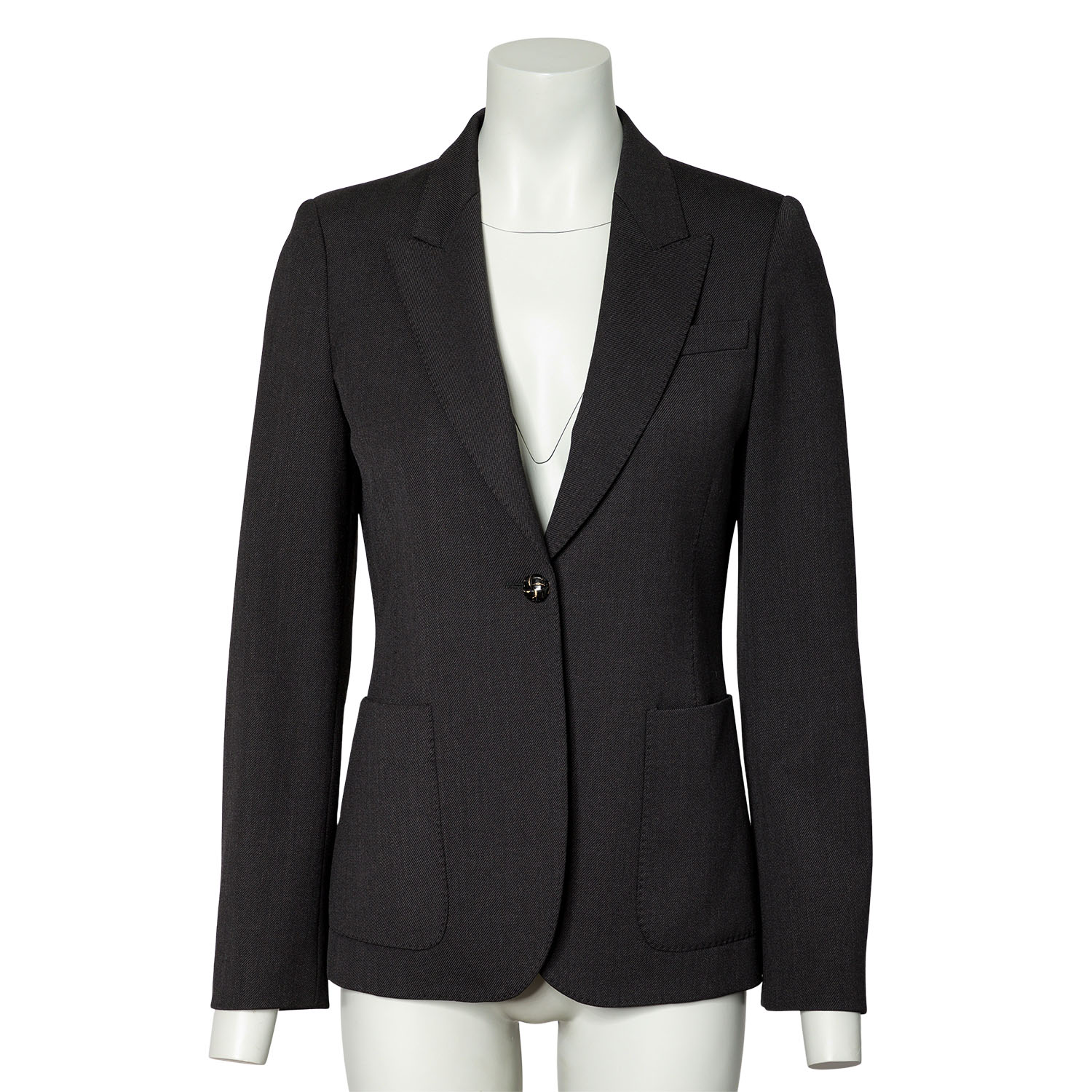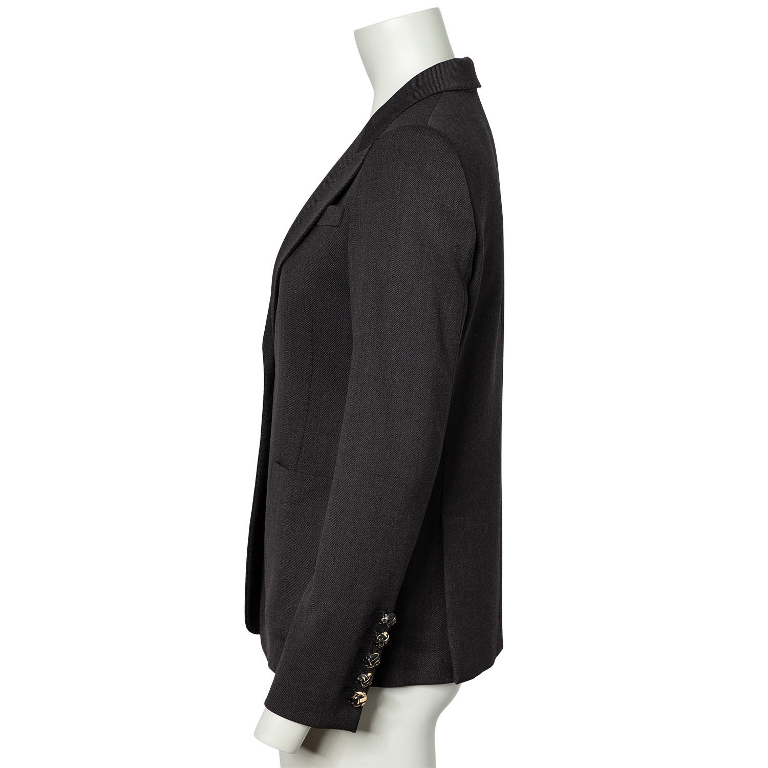 Wollgemisch in Anthrazit mit schmalem Reverskragen, einer Brusttasche, zwei aufgesetzte Eingrifftaschen und dekorative Lederknöpfe (leicht beschädigt). Guter Erhalt.