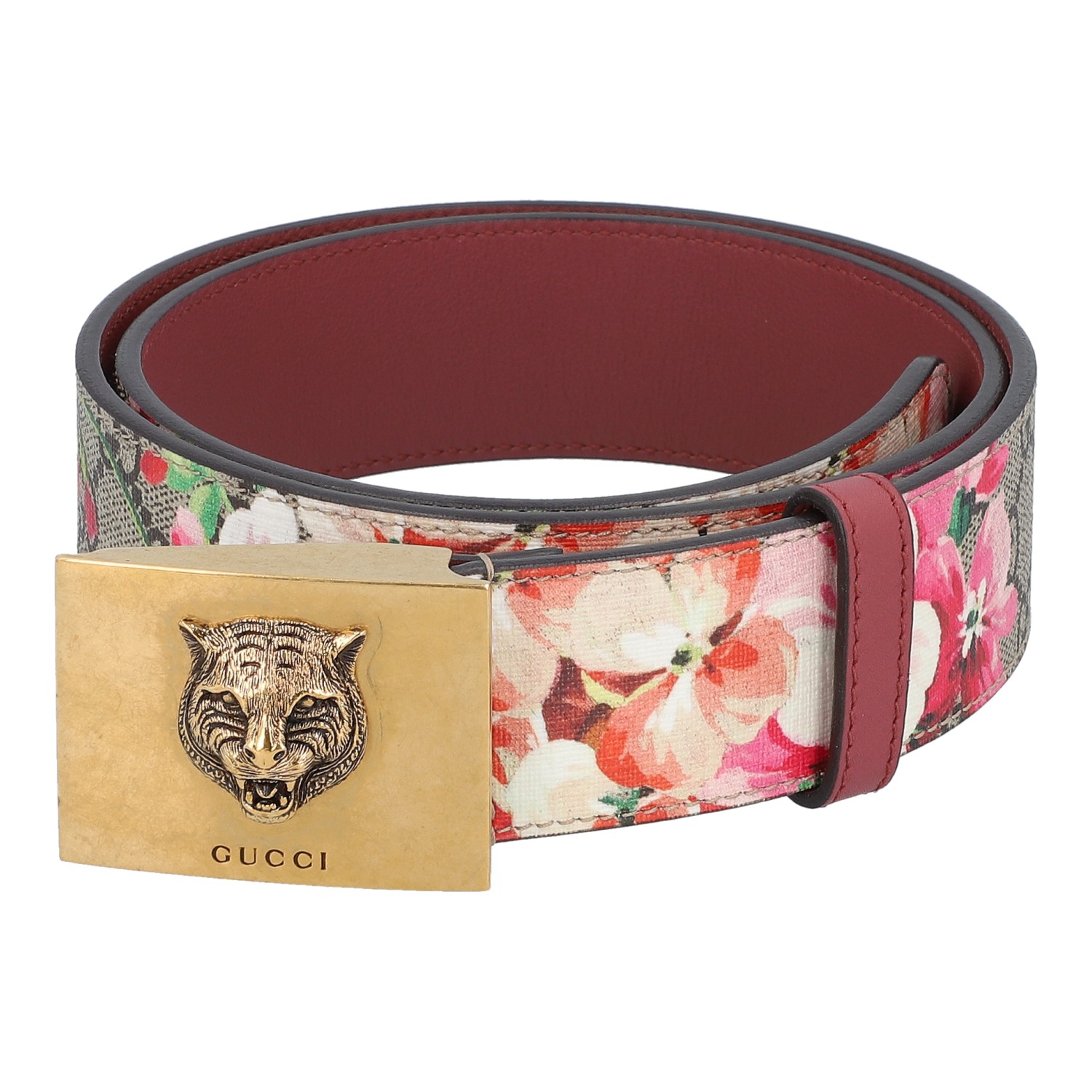GG Supreme Canvas mit Bloom Print, goldfarbener Schließe mit Löwenkopf. Tragespuren vorhanden. Breite: 4 cm.
