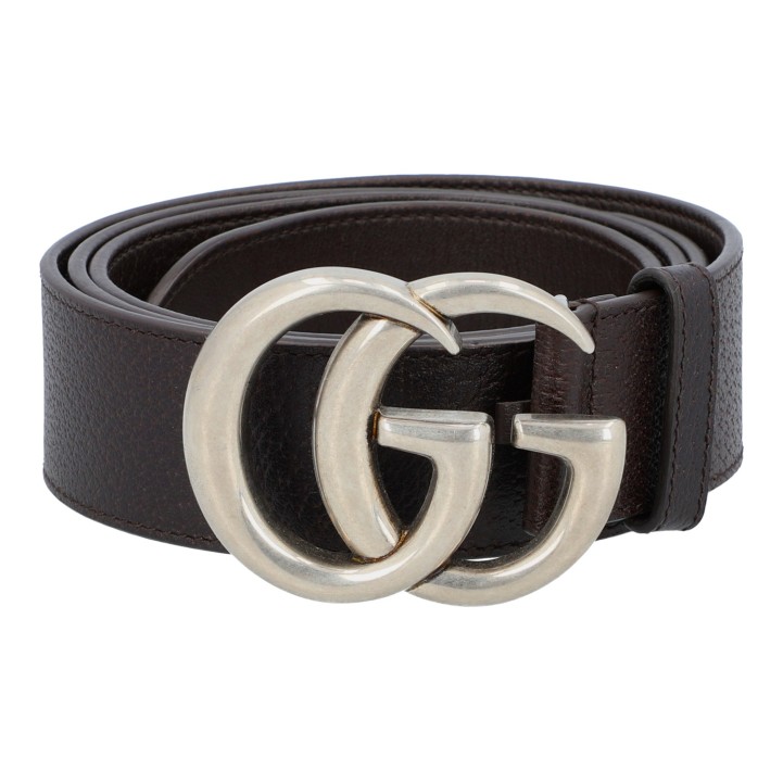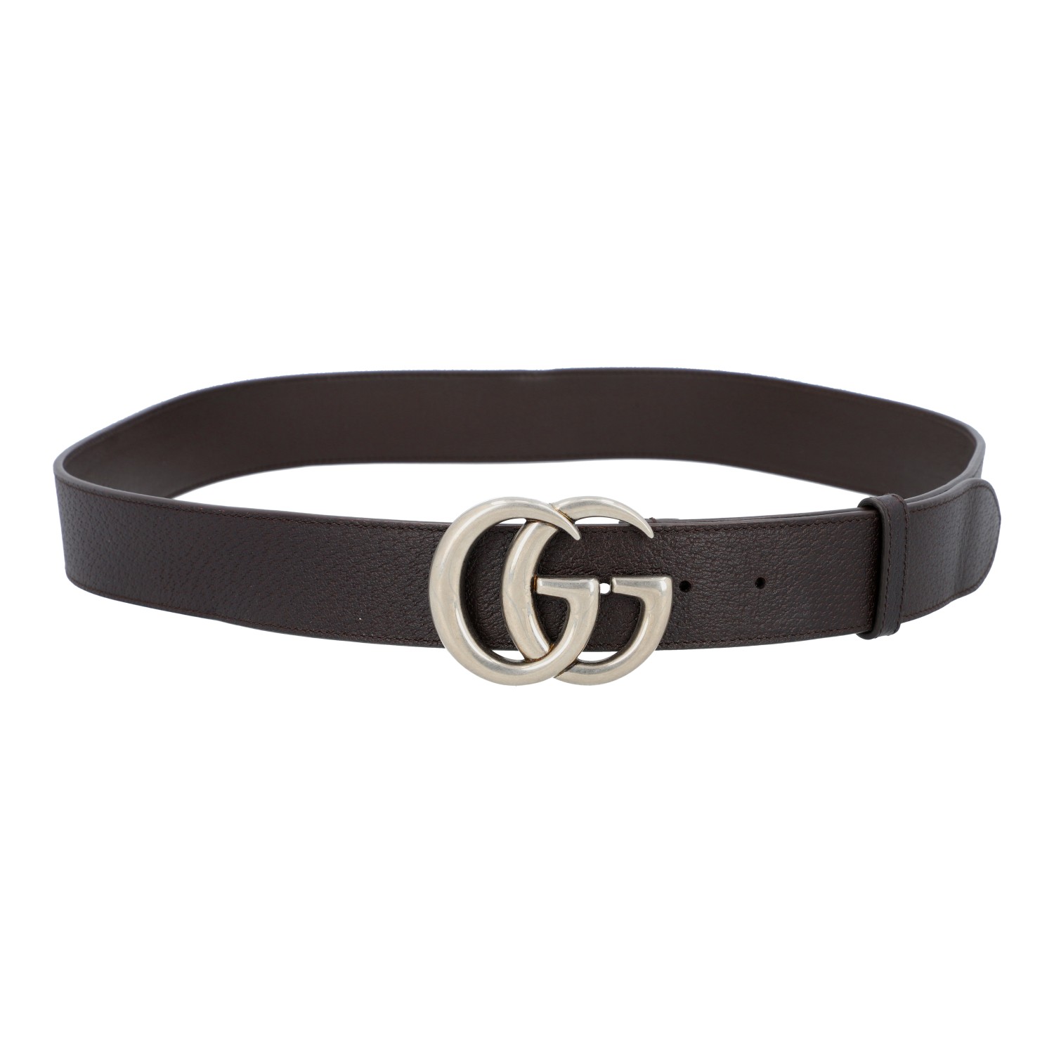 Fein genarbtes Leder in Dunkelbraun mit silberfarbener GG-Logoschließe. Tragespuren vorhanden. Breite ca. 4cm.