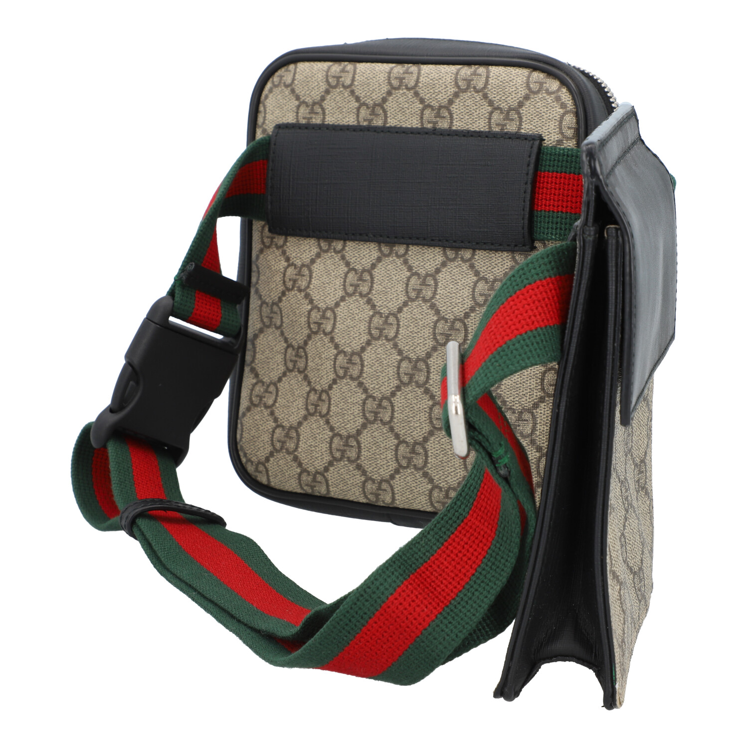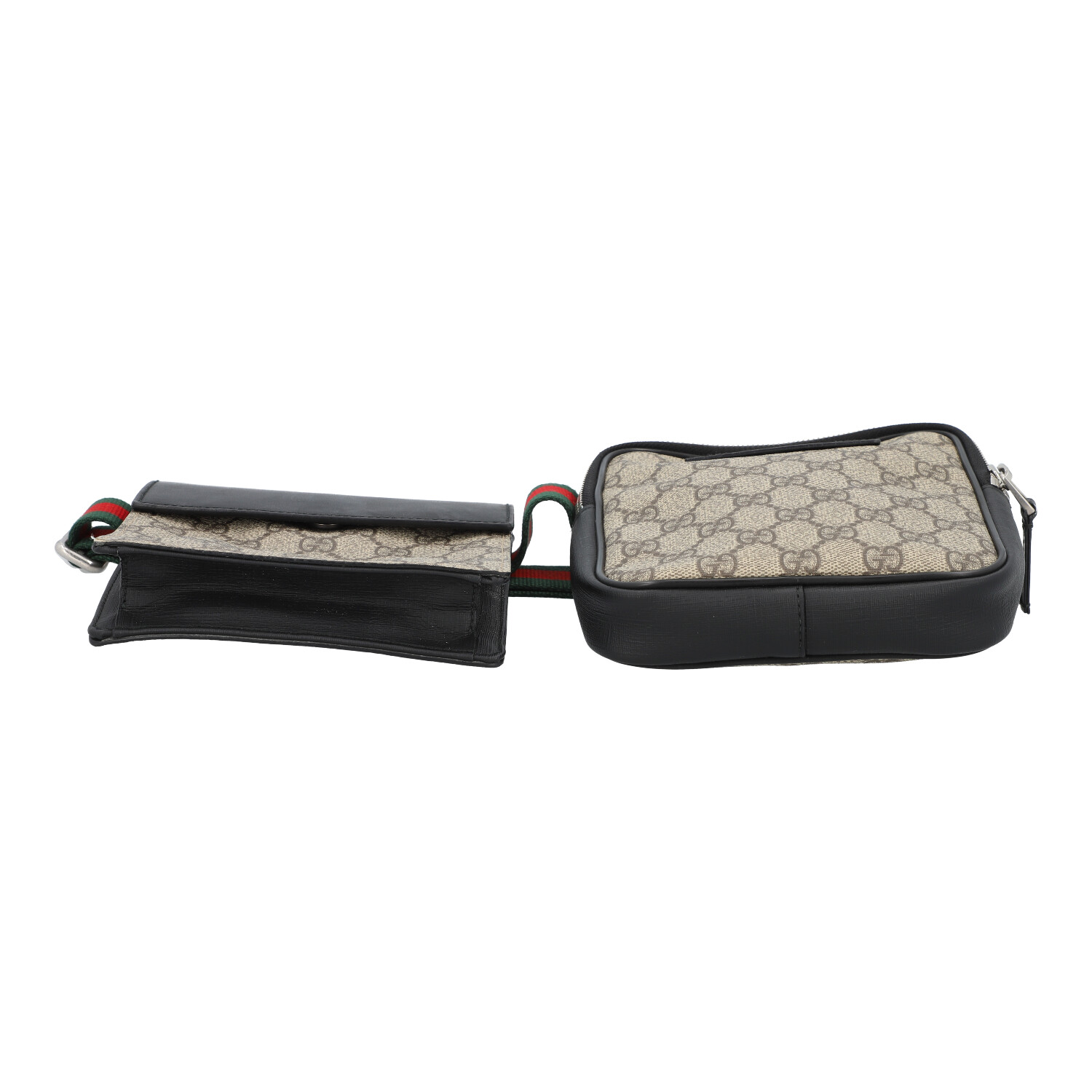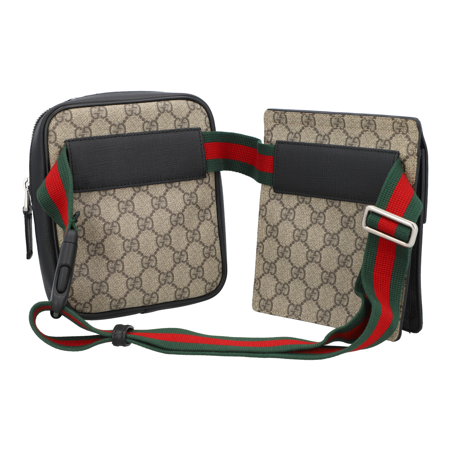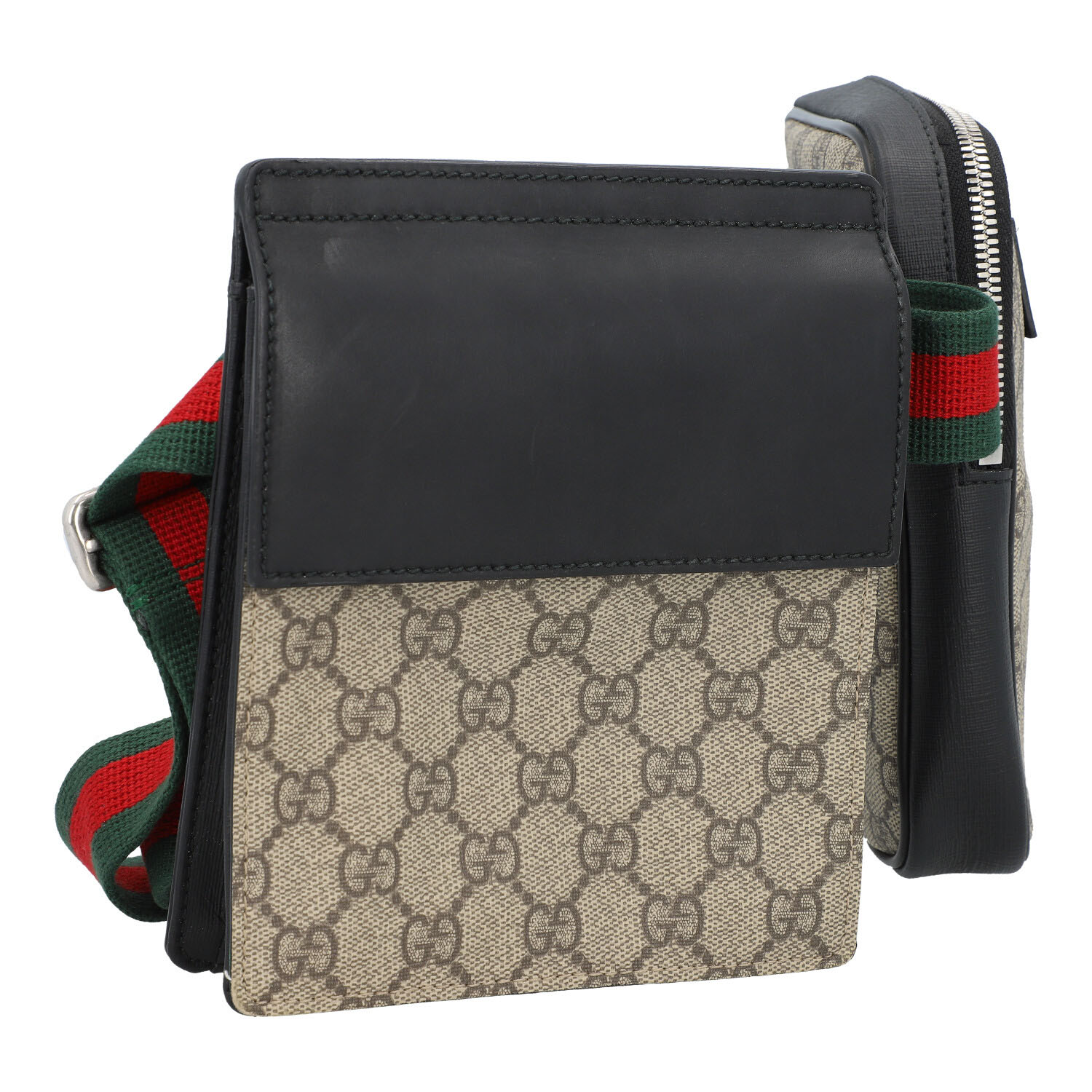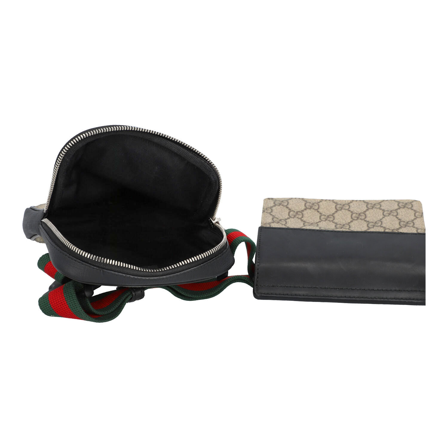 Zwei Taschen mit GG-Supreme und Details aus Leder in Schwarz. Trageriemen im klassischen Streifendesign Grün/Rot mt Steckverschluss. Hardware in Silberfarben. Gebrauchsspuren und leichter Abrieb vorhanden.