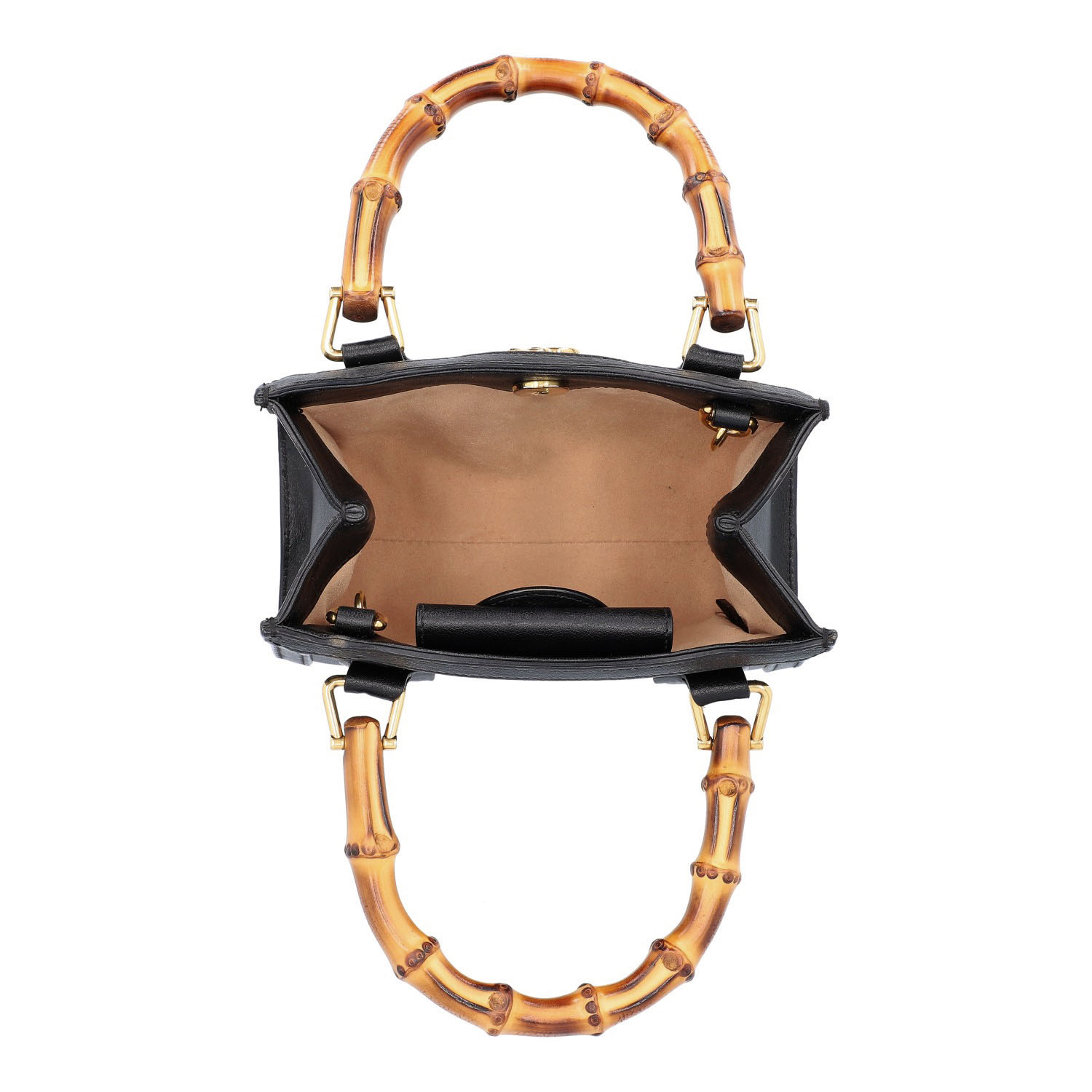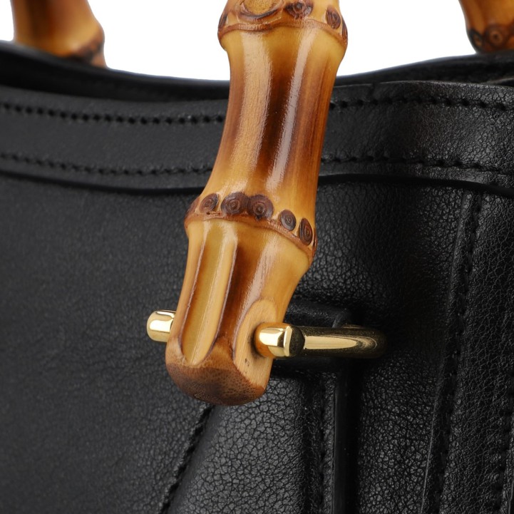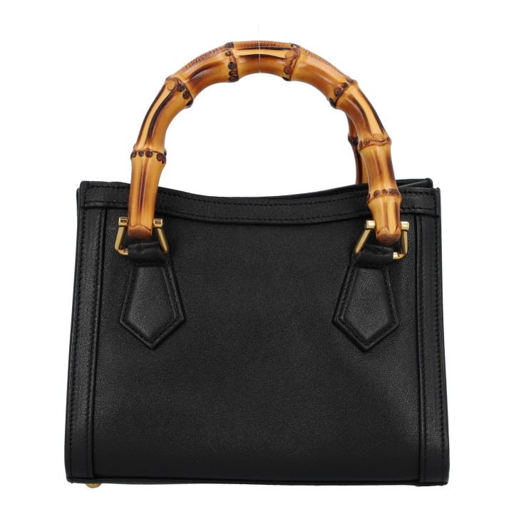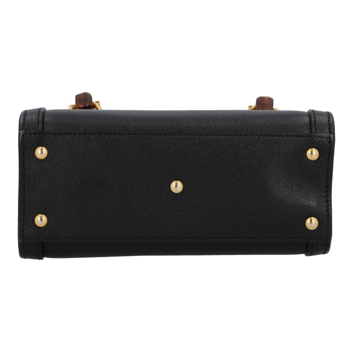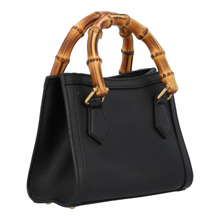 Kleiner Diana Shopper aus fein genarbtem Leder in Schwarz mit goldfarbener Hardware und klassischen Bambus-Henkeln. 2 Sets Lederlaschen, 1x in Neongelb und 1x in Neonpink. Box und Staubbeutel anbei. Guter Erhalt. 20x9x15cm.