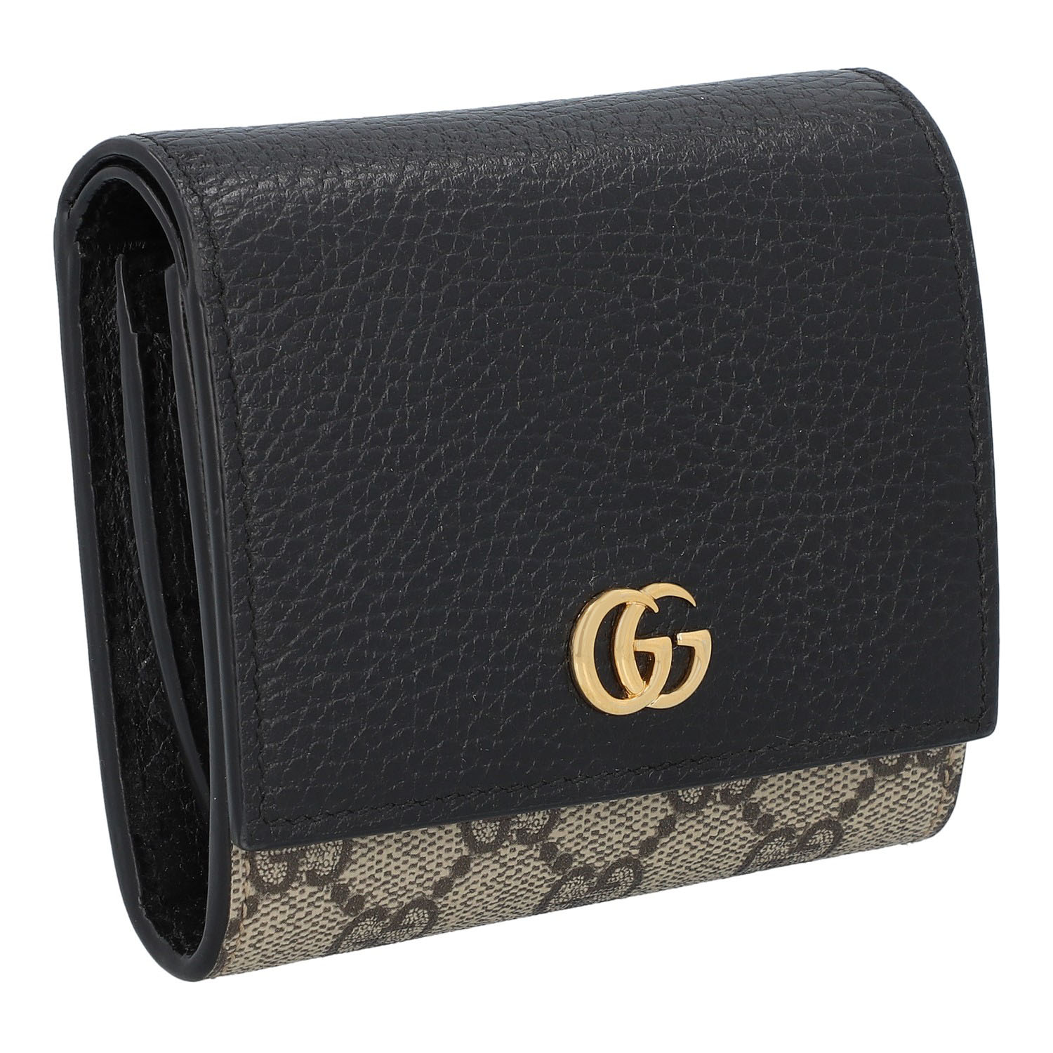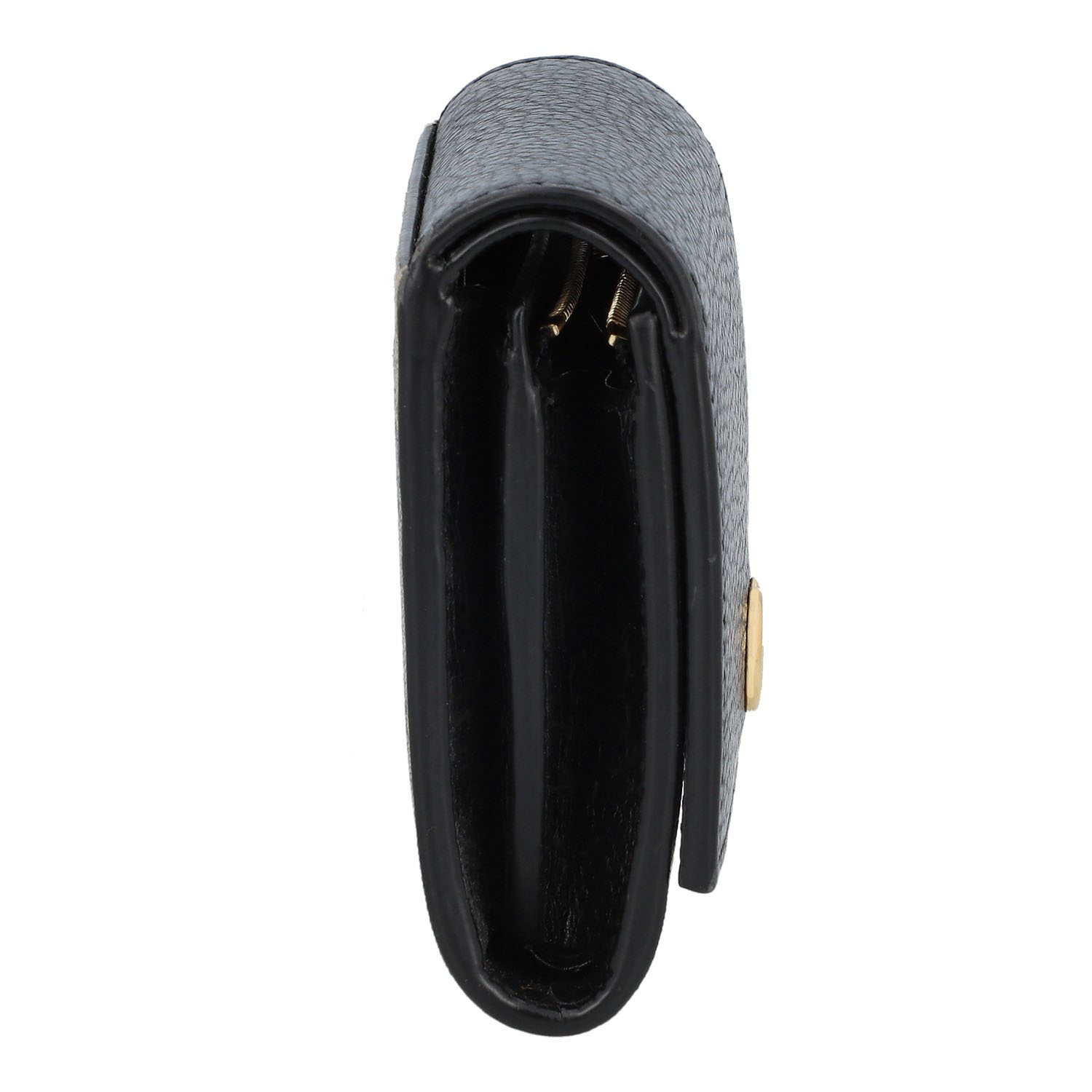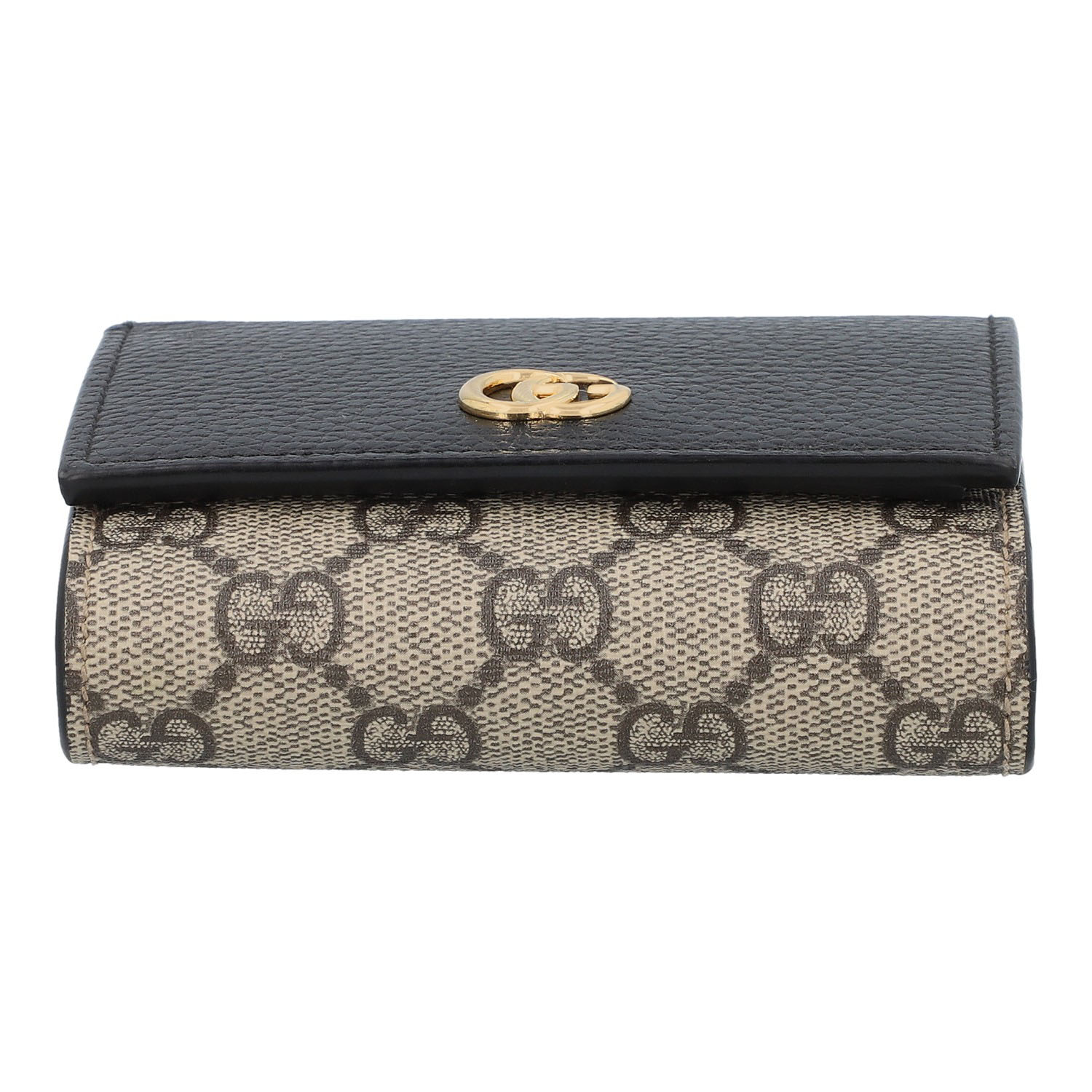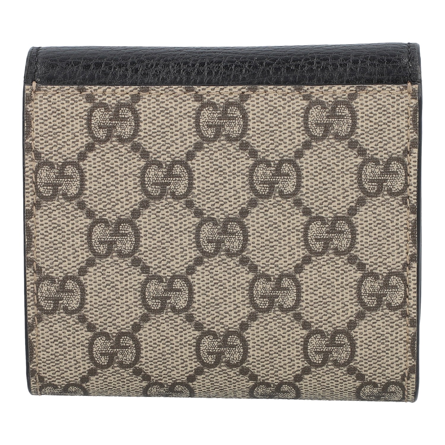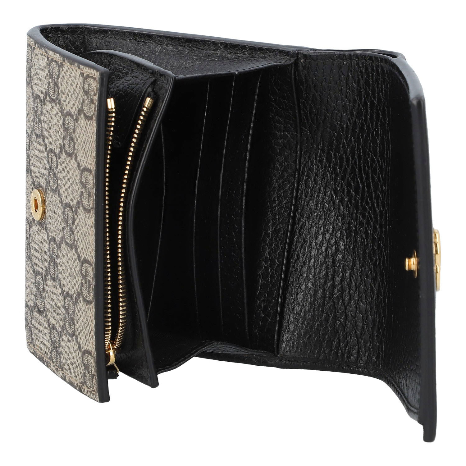 Akt. NP.: 450,-€. Mittelgroßes Modell mit GG-Supreme und schwarzem Leder. Überschlag mit goldfarbenem GG-Logo. Diverse Innenfächer. Leichte Gebrauchsspuren vorhanden. 11x3x10cm.