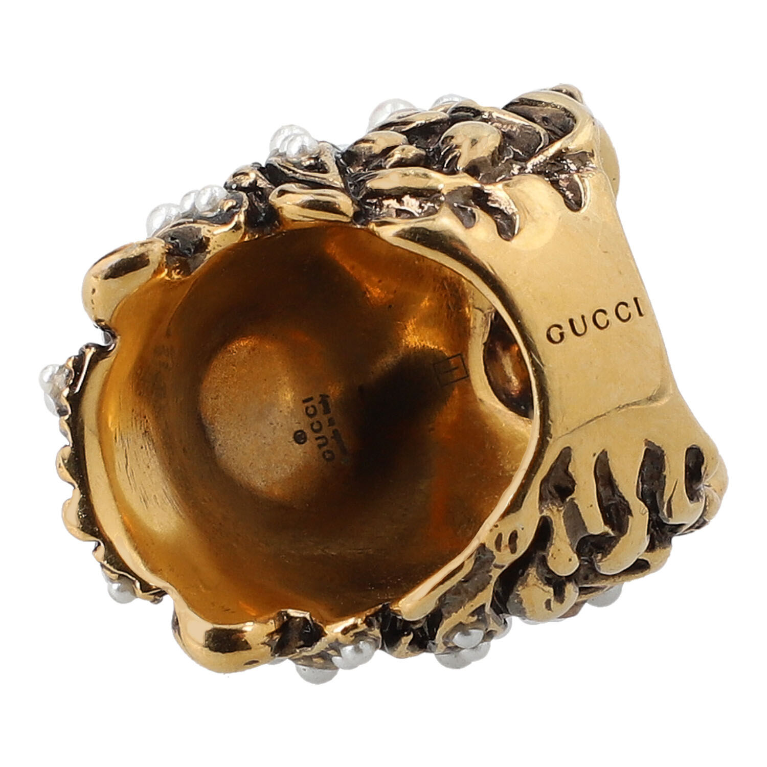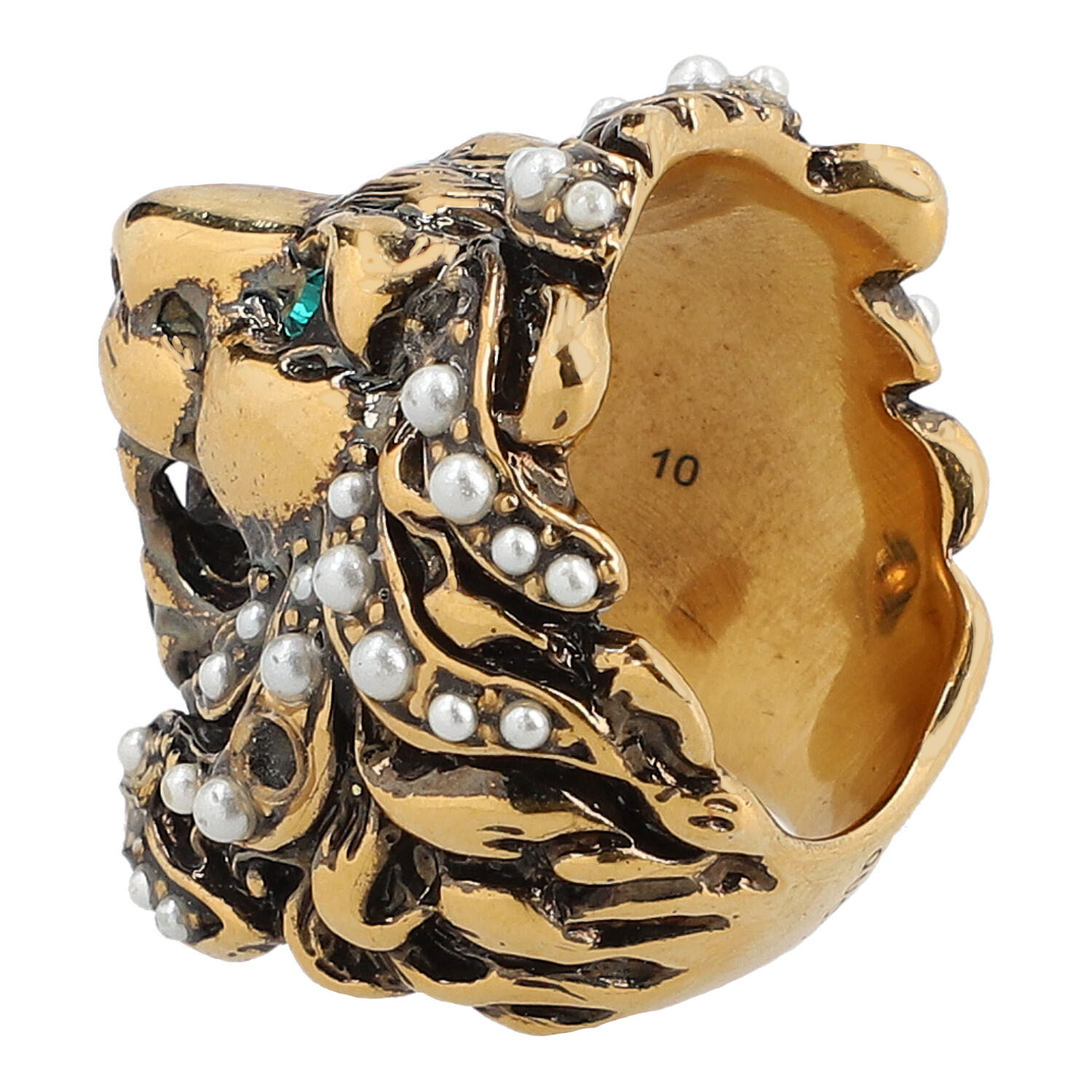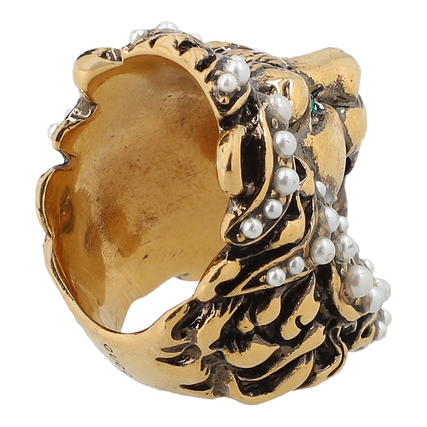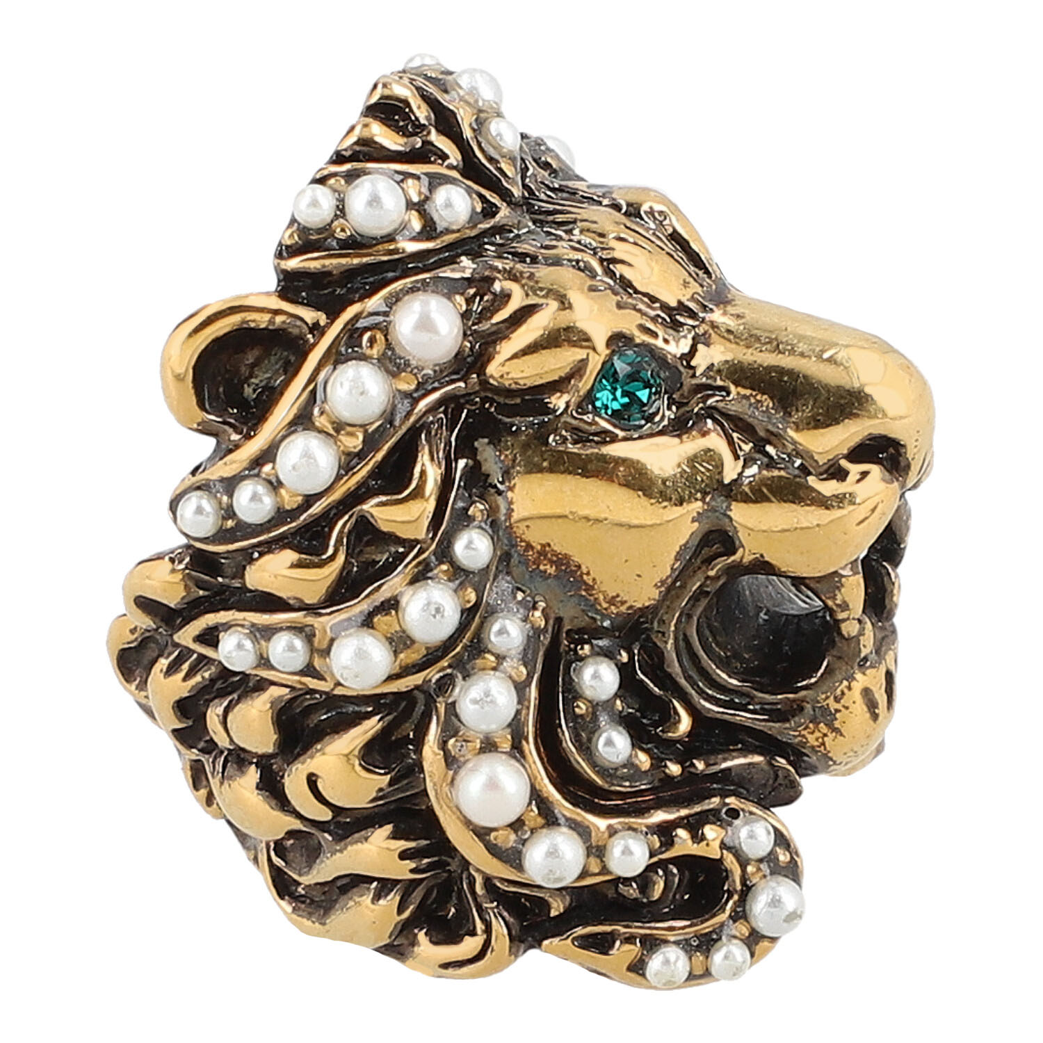 Goldfarbenes Modell mit Kunstperlenbesatz und grünen Kunststeinen als Augen. Tragespuren vorhanden.