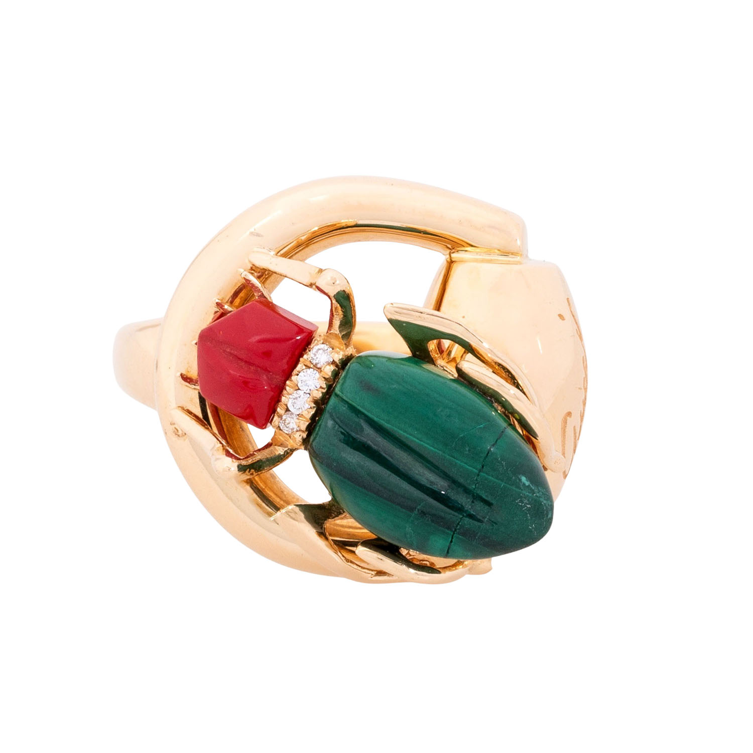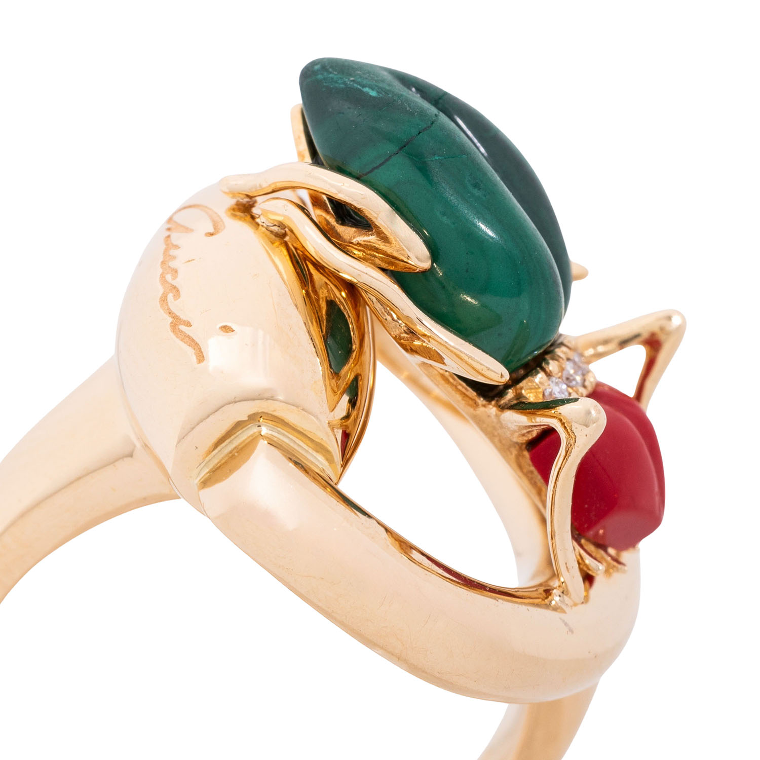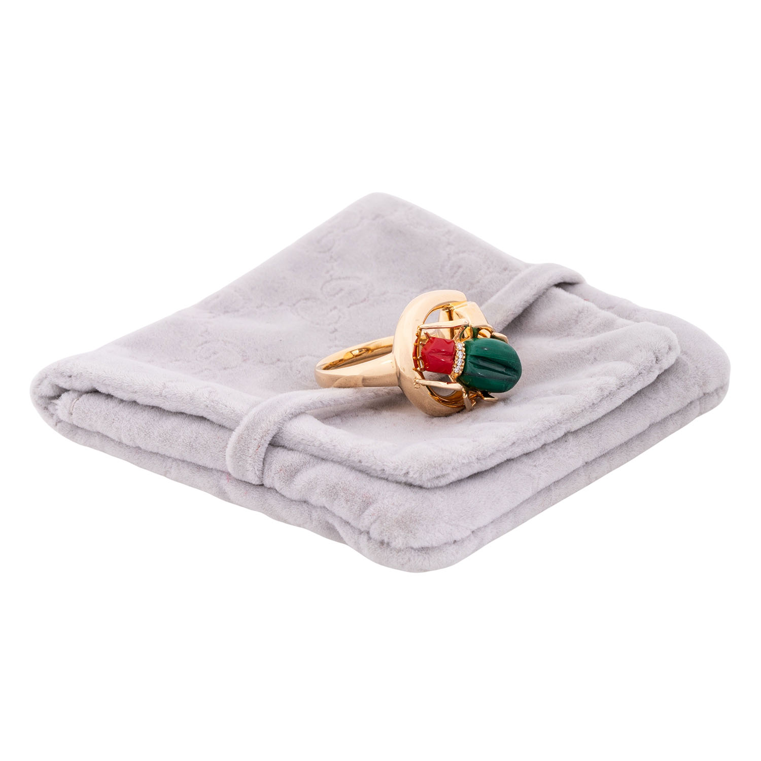 mit Malachit und rotem Stein (verm. Kunstharz) sowie kleinen Brillanten zus. ca. 0,05 ct, 18K GG, 13,8 gr, RW: 52, Anfang 2000, minimale Tragespuren, Malachit mit Riss und Berieb, inkl. Gucci Täschchen.