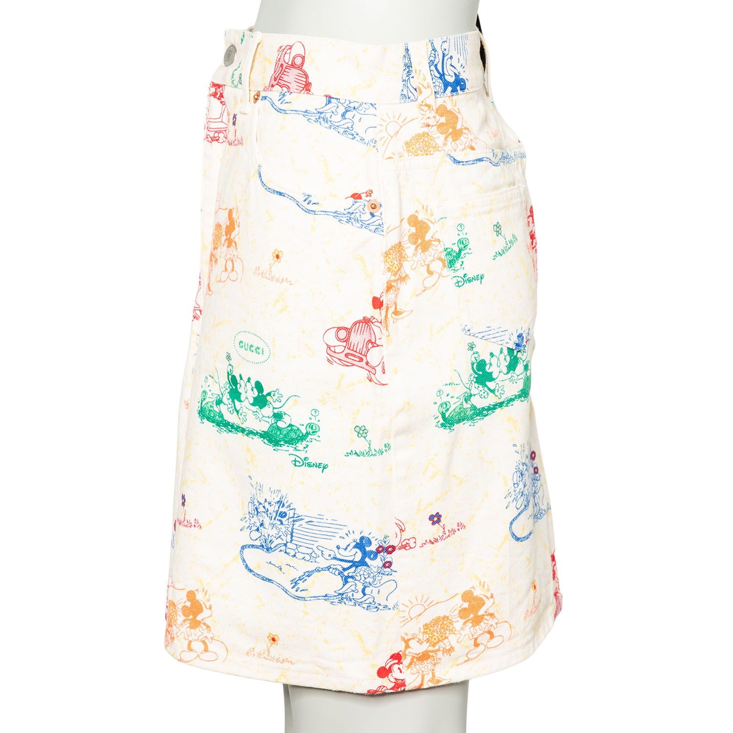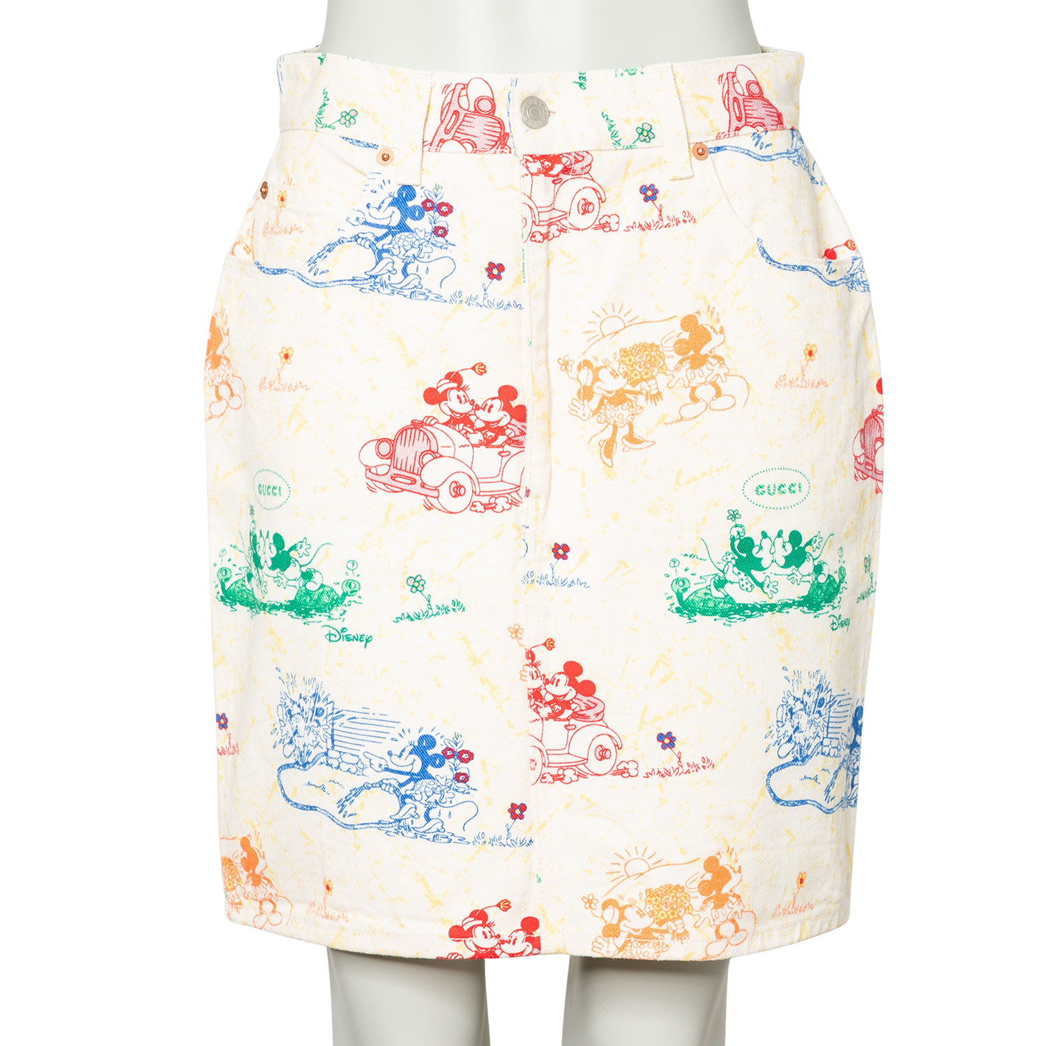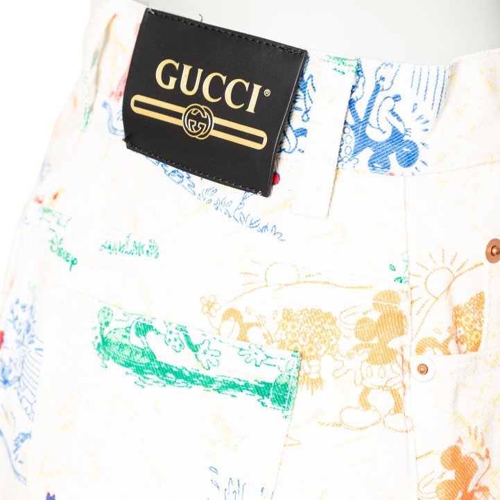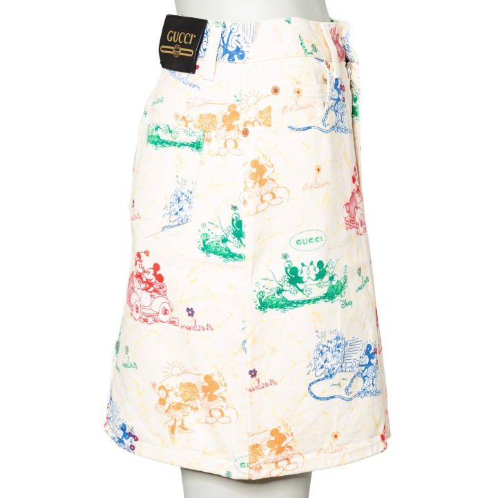 Limitierter GUCCI x DISNEY Kollektion. Jeansrock aus 100% Baumwolle in Weiß mit Musterung in Multicolor. Guter Erhalt.