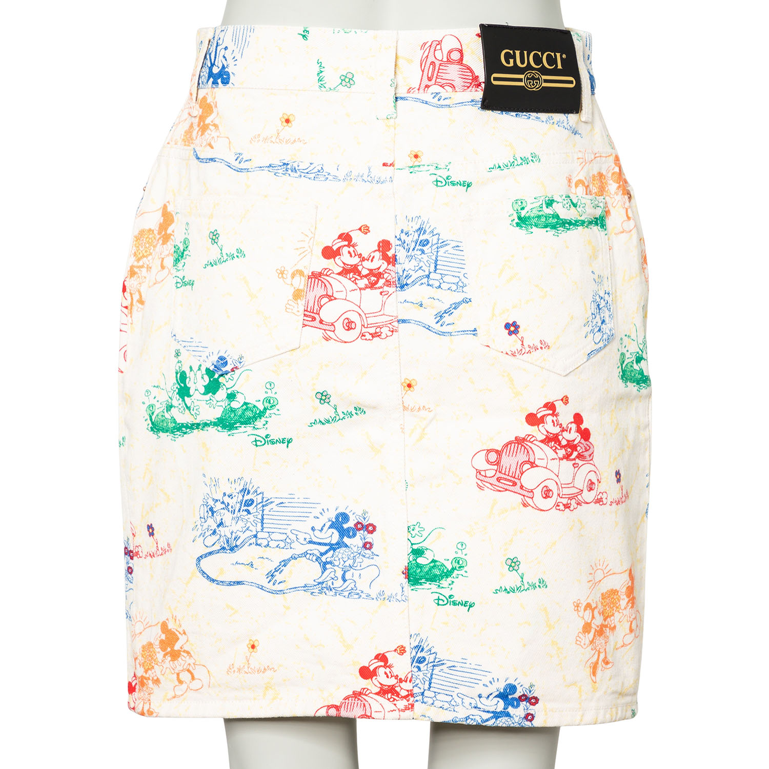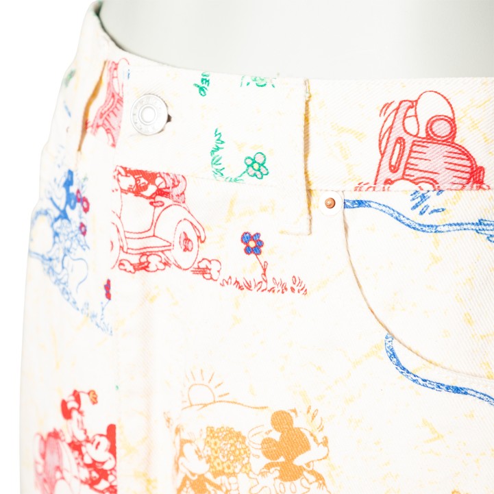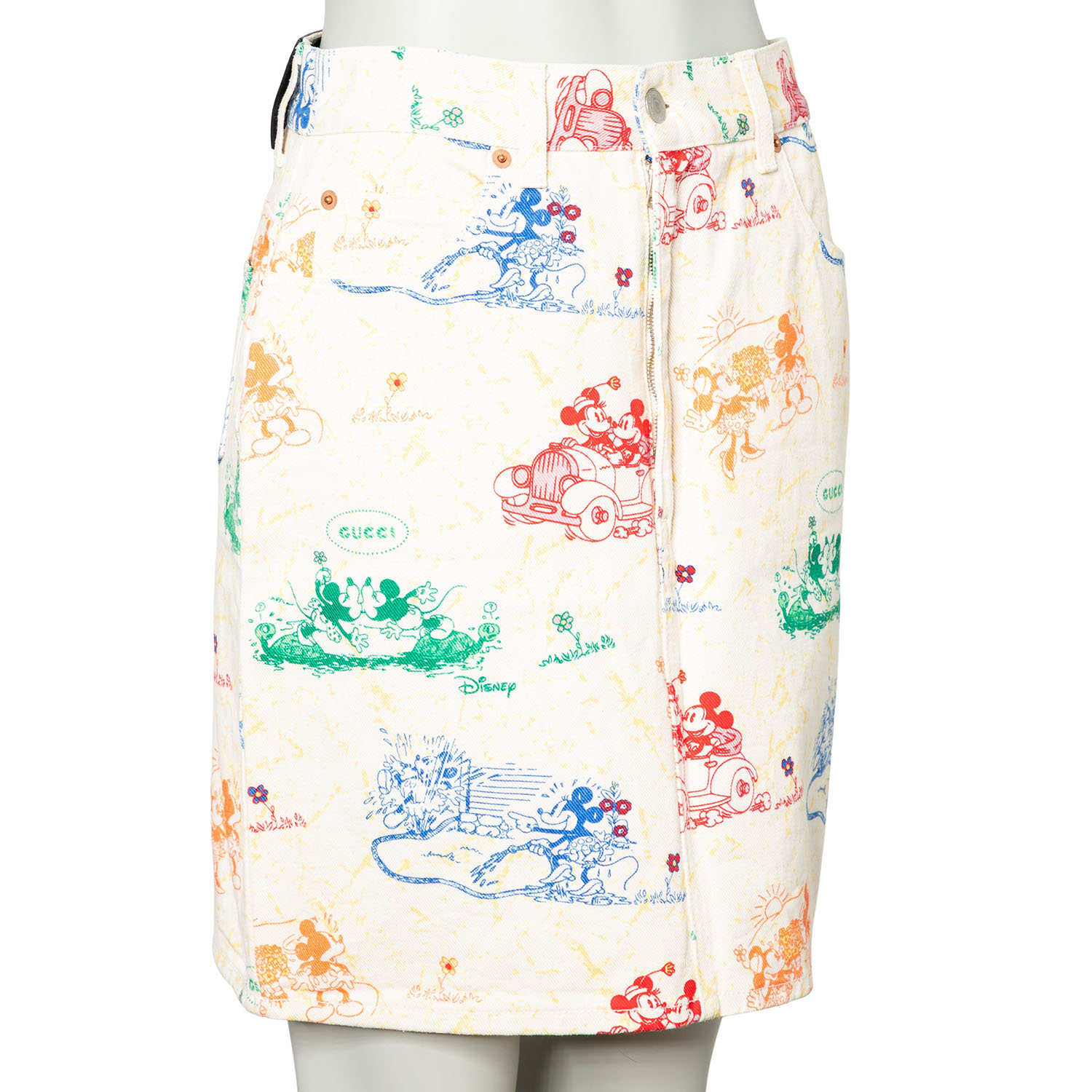 Limitierter GUCCI x DISNEY Kollektion. Jeansrock aus 100% Baumwolle in Weiß mit Musterung in Multicolor. Guter Erhalt.