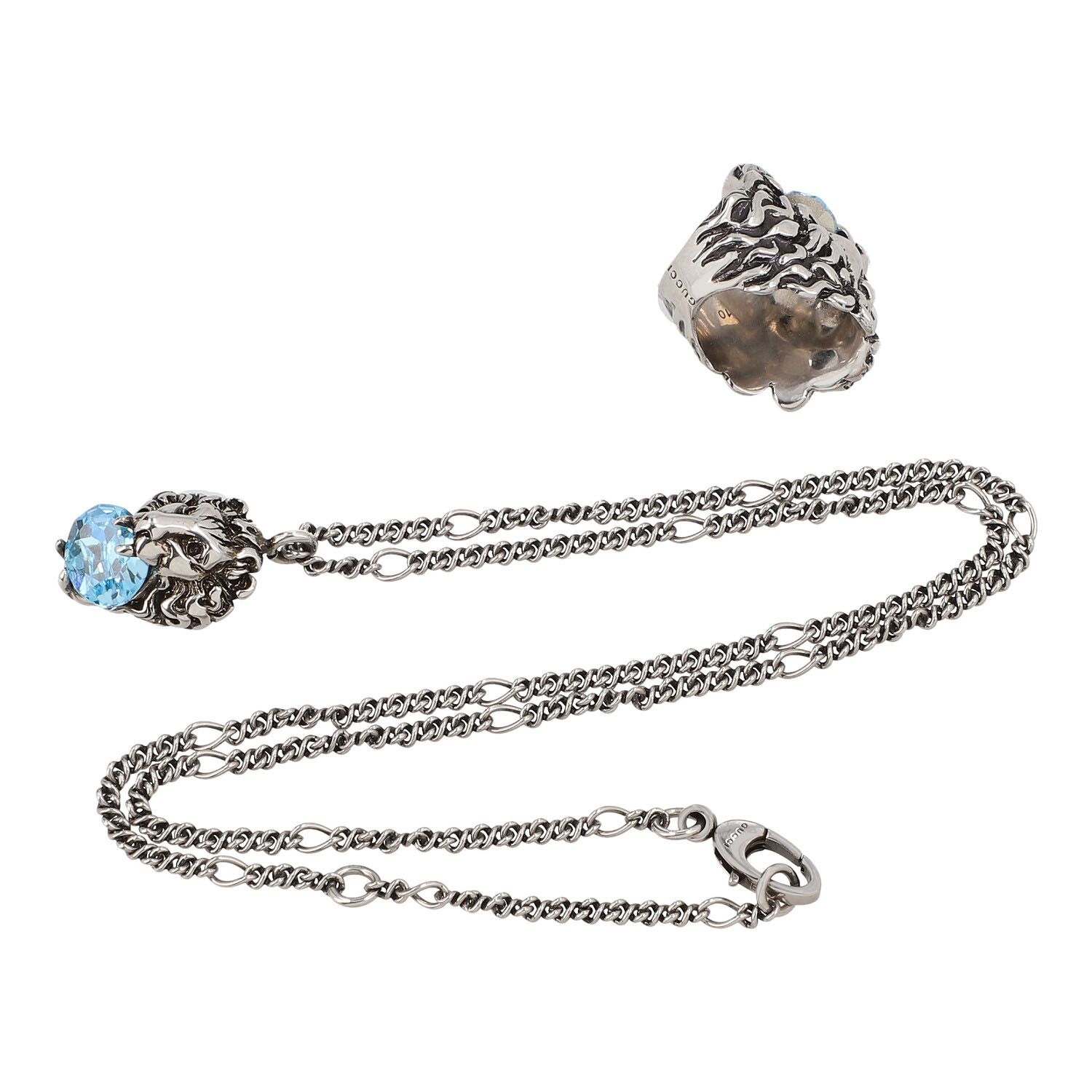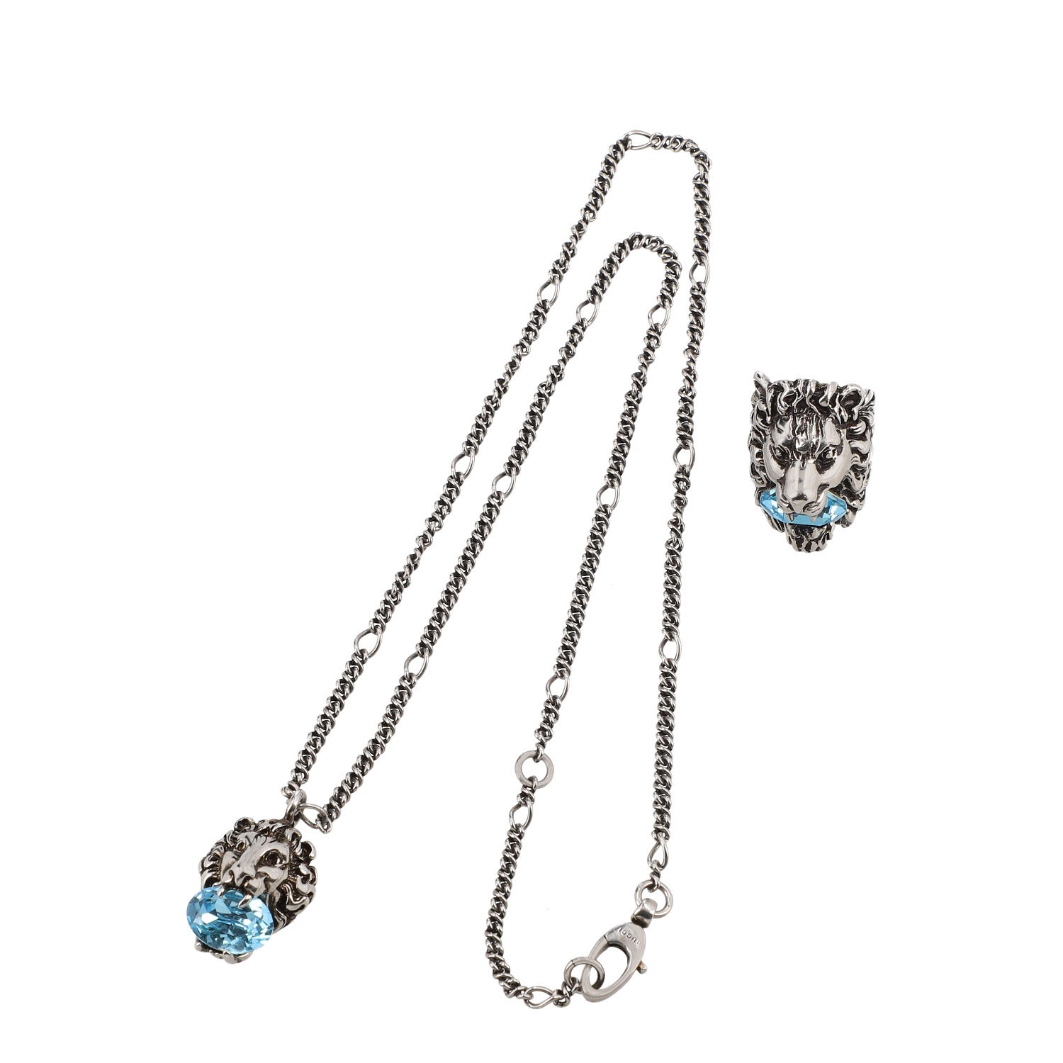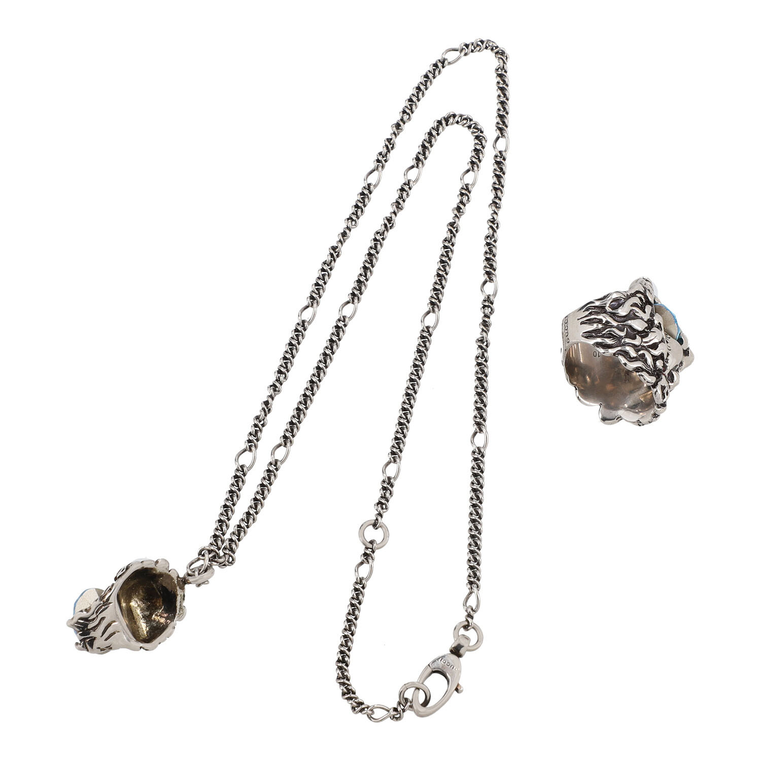 Silberfarbener Ring und Halskette, Löwenkopf mit hellblauem Stein. Tragespuren vorhanden. L.: 60 cm.