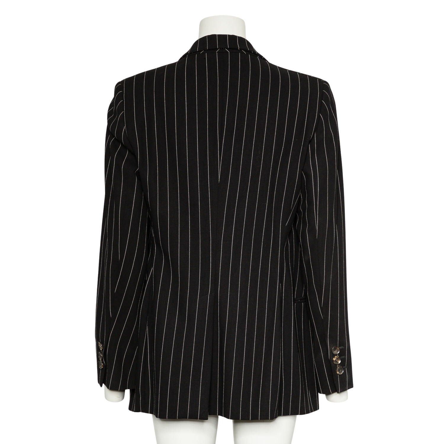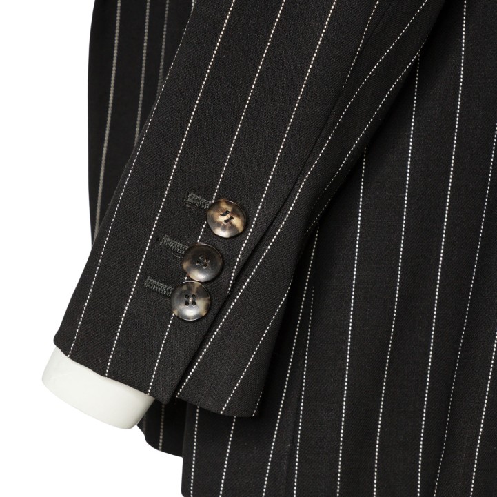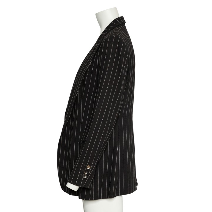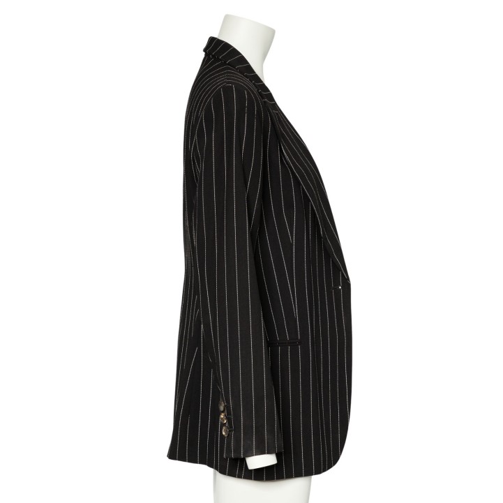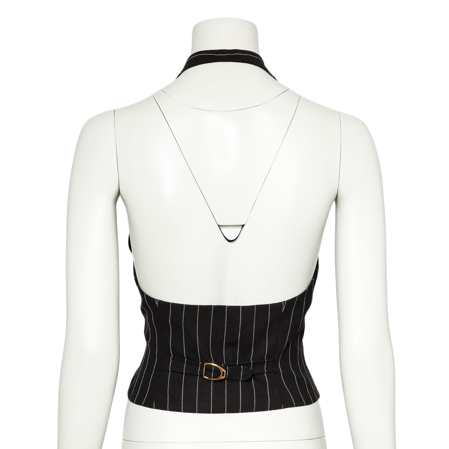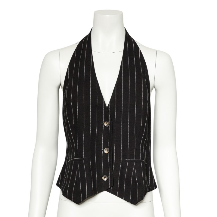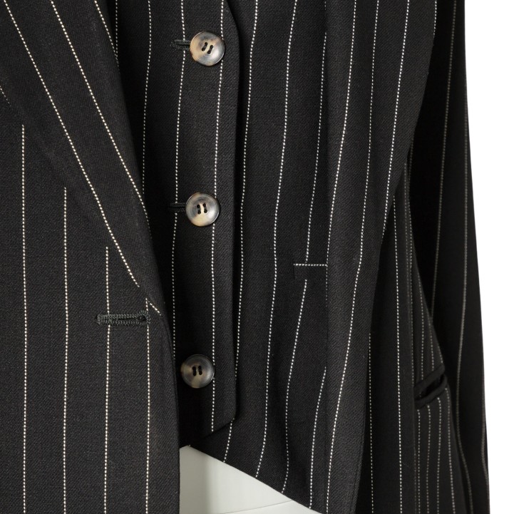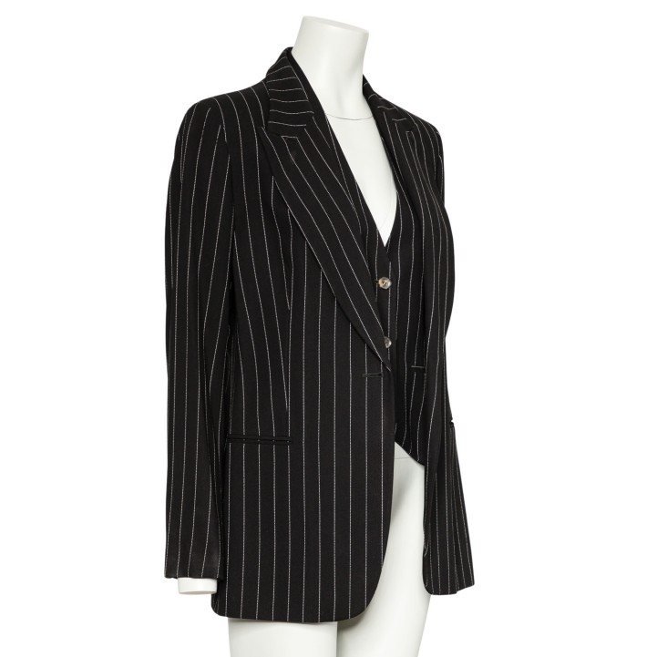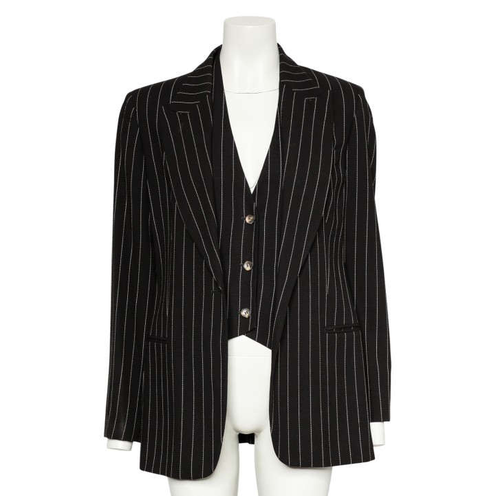 Neckholder-Weste und Blazer in Schwarz mit Nadelstreifen. Diverse Tragespuren vorhanden.