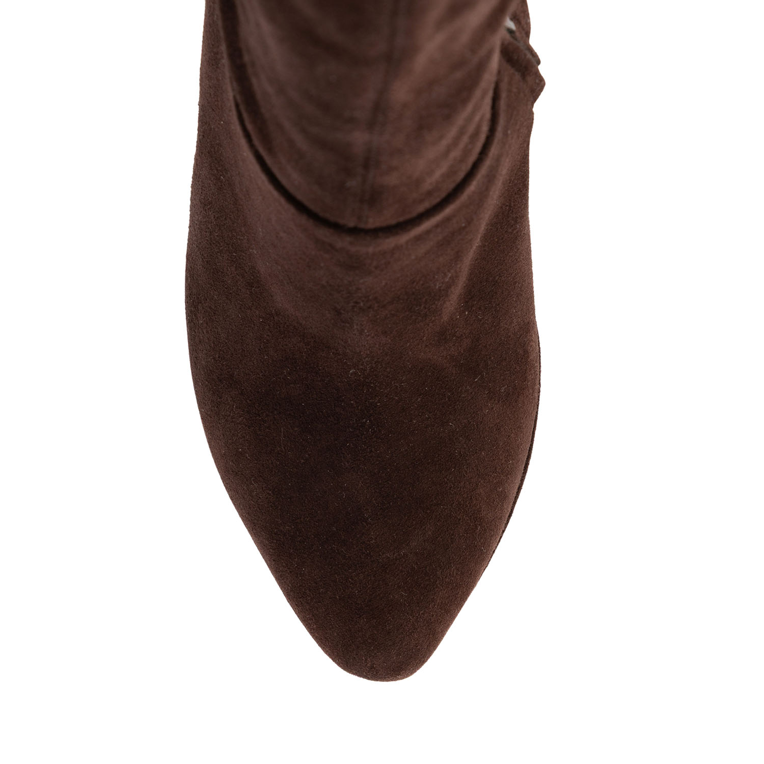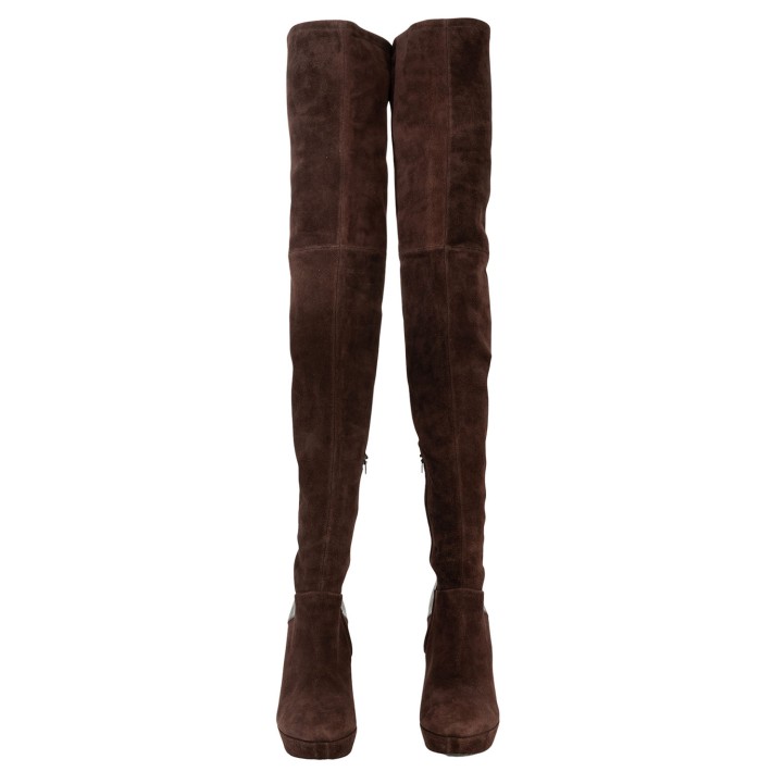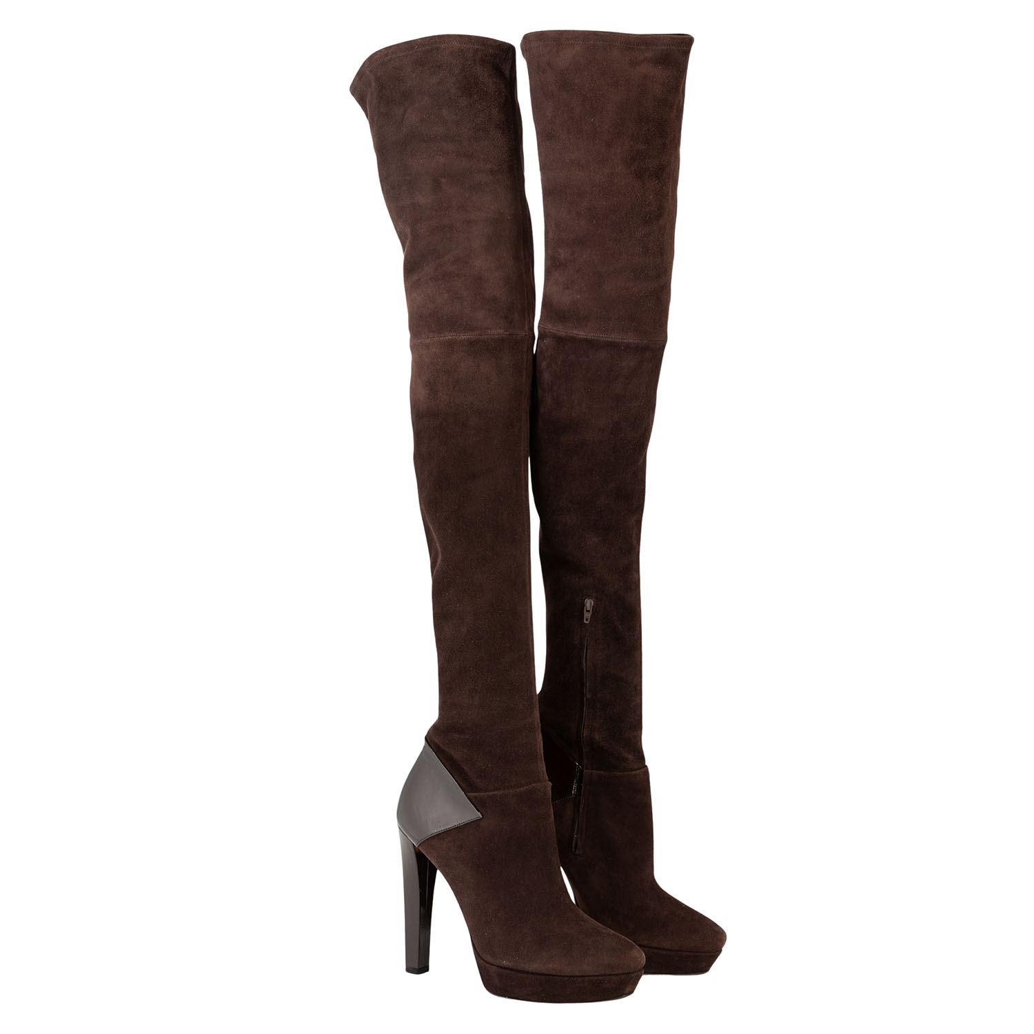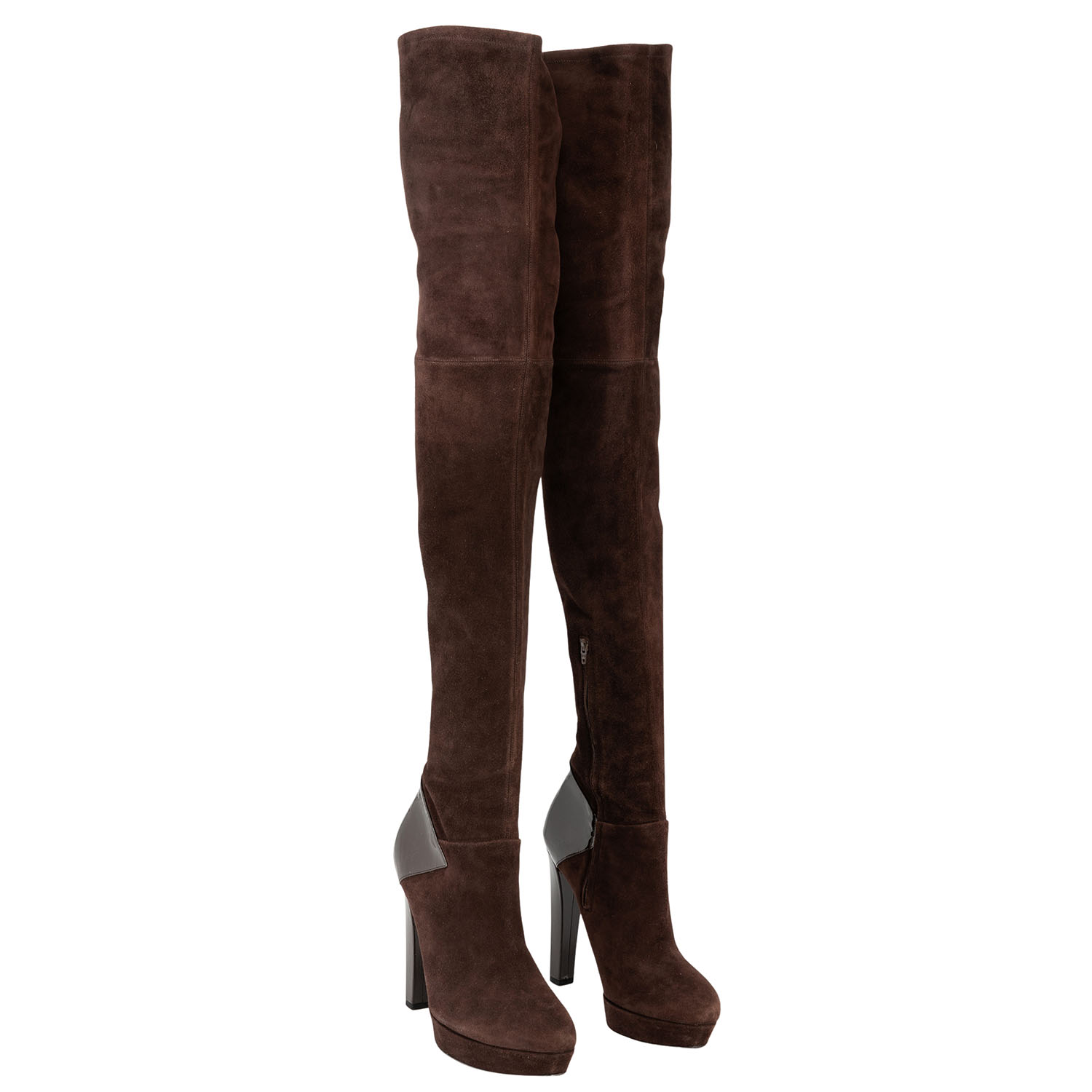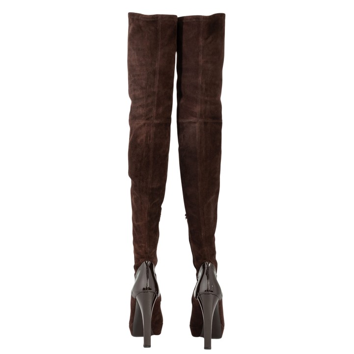 NP. ca.: 2.450,-€. Overknees aus dunkelbraunem Wildleder mit Plateausohle (2,5cm) und einer Absatzhöhe von ca. 12,5cm. Ferse mit Lackleder-Detail. Seitlicher Reißverschluss. Guter Erhalt.