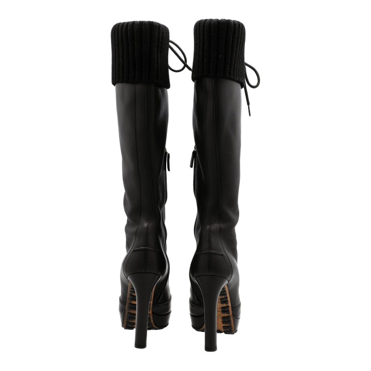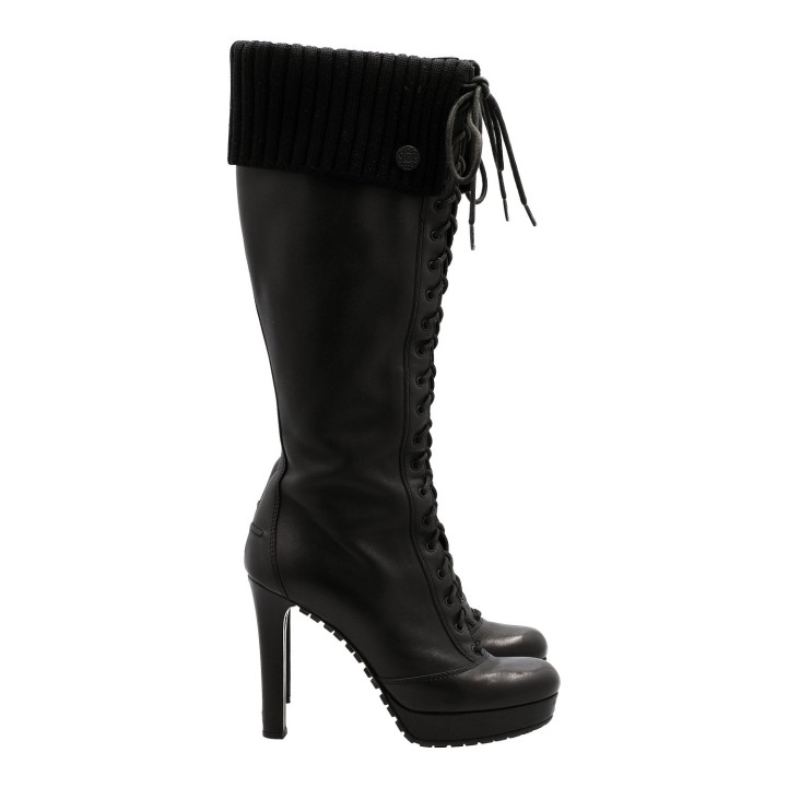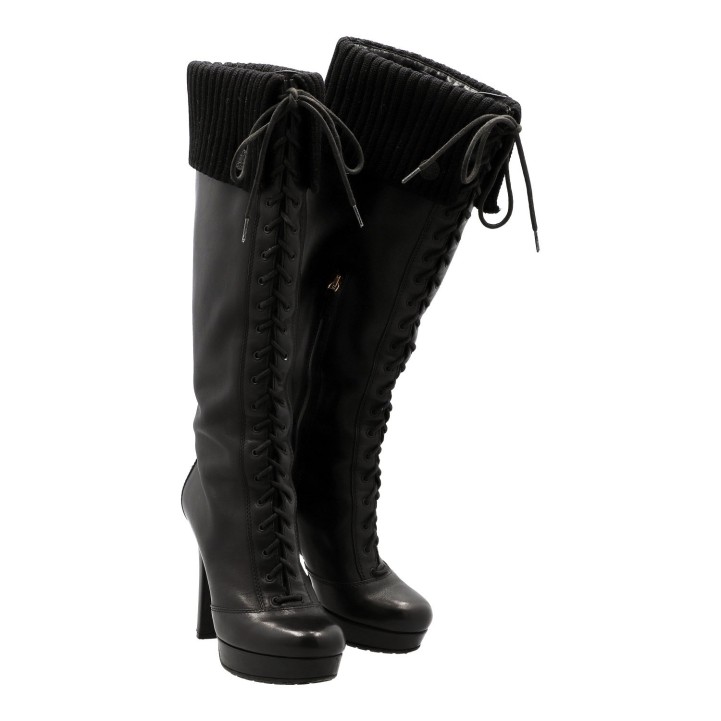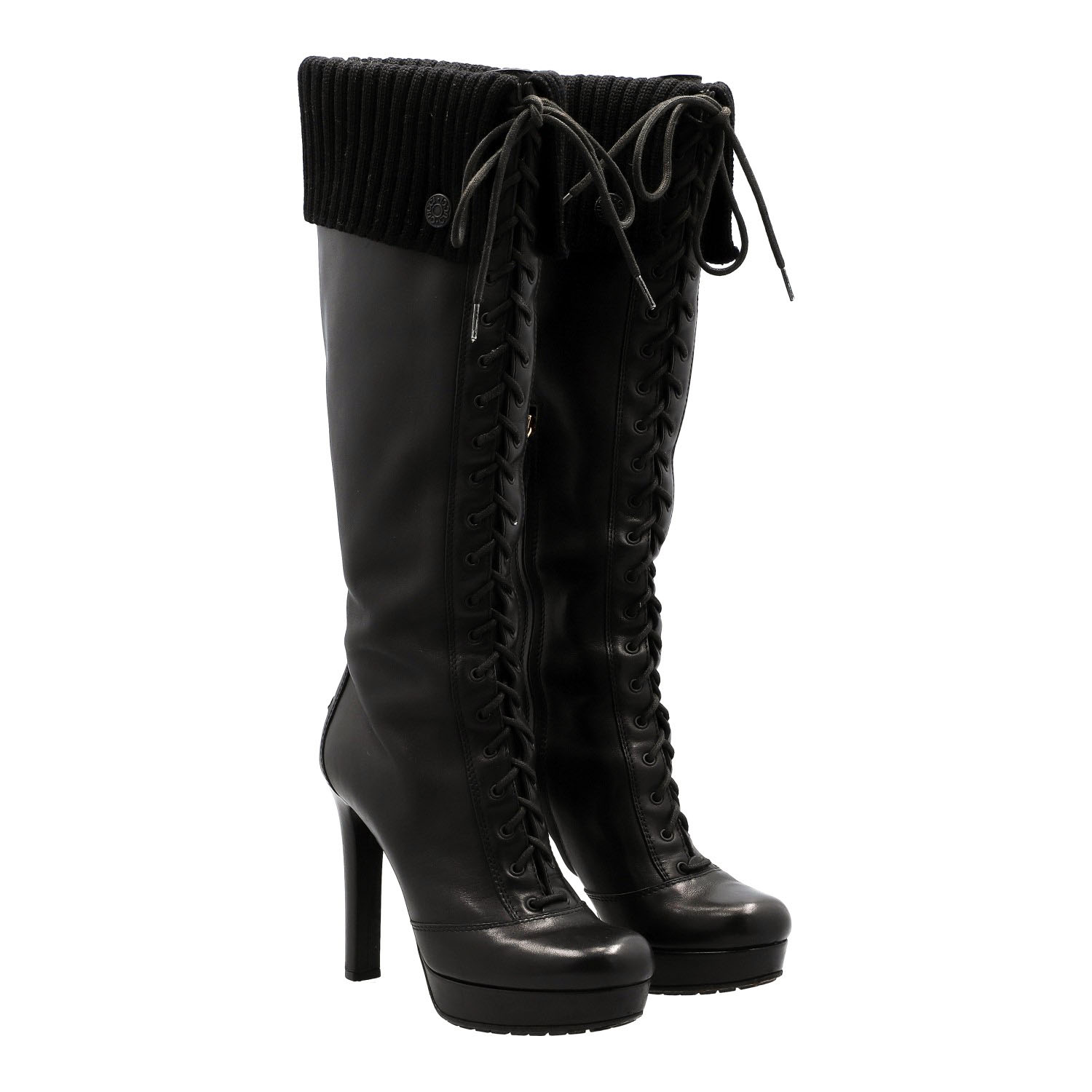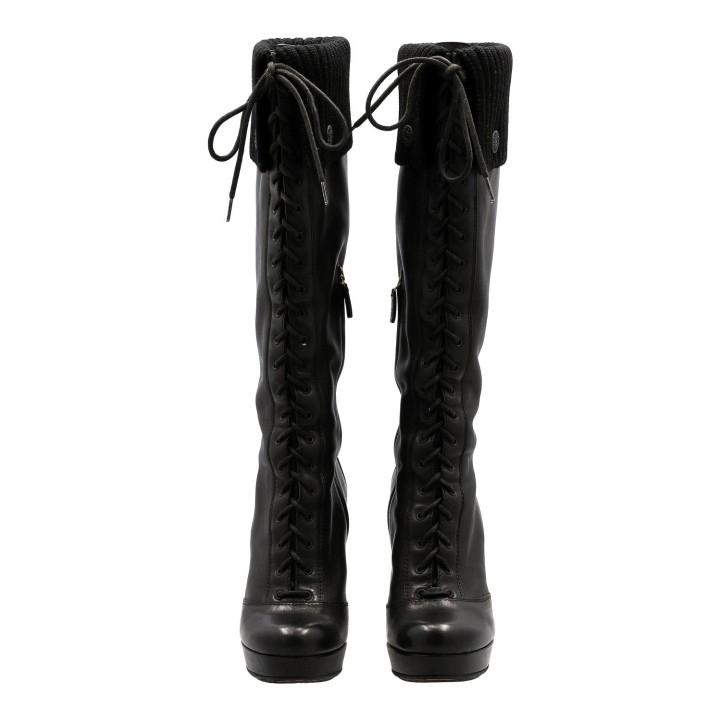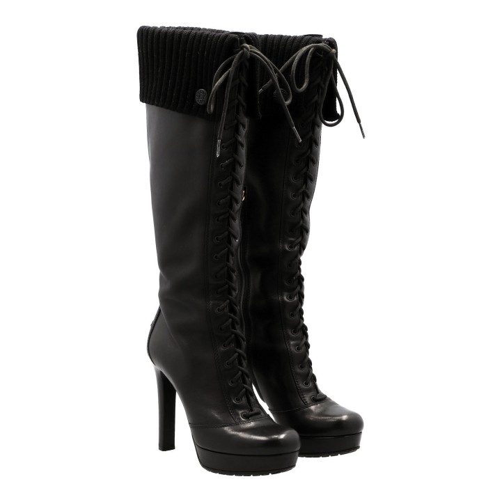 Aus Leder in Schwarz. Hoher Schaft mit dekorativer Schnürung, Bündchen Dekor, seitlichem Reißverschluss und gummierter Laufsohle. Plateausohle ca. 2cm, Absatzhöhe ca. 12cm. Guter Erhalt.