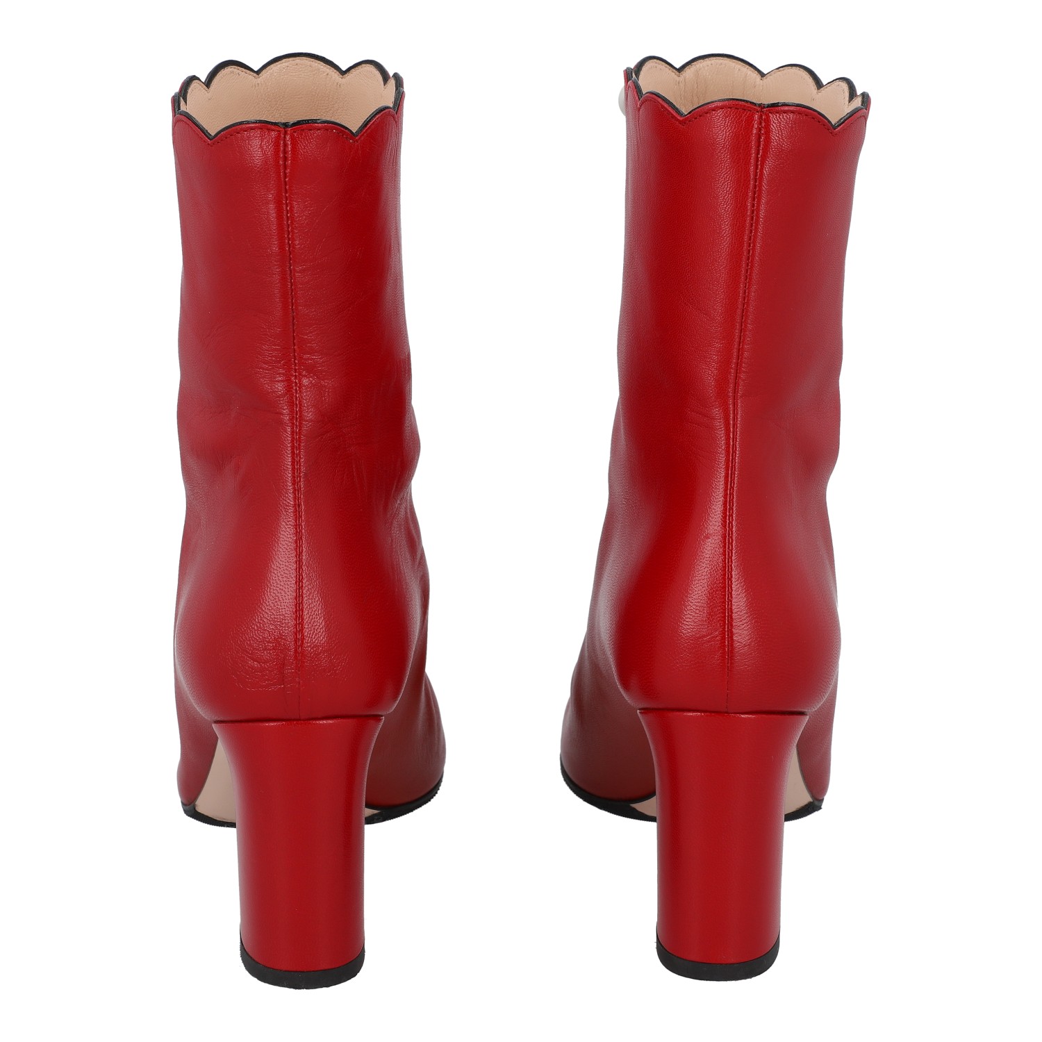 Rotes Leder mit dekorativem Wellensaum und Perlenbesatz. Absatzhöhe: 7,5 cm. Tragespuren vorhanden, besohlt