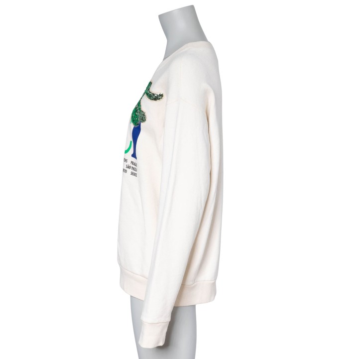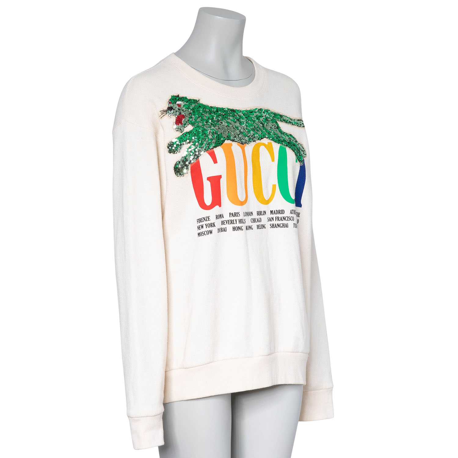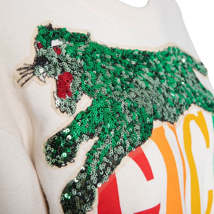 Cremefarbenes Modell mit Städtenamen, Logo in Multicolor und Tiger in grün aus Pailetten. Tragespuren vorhanden.