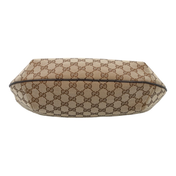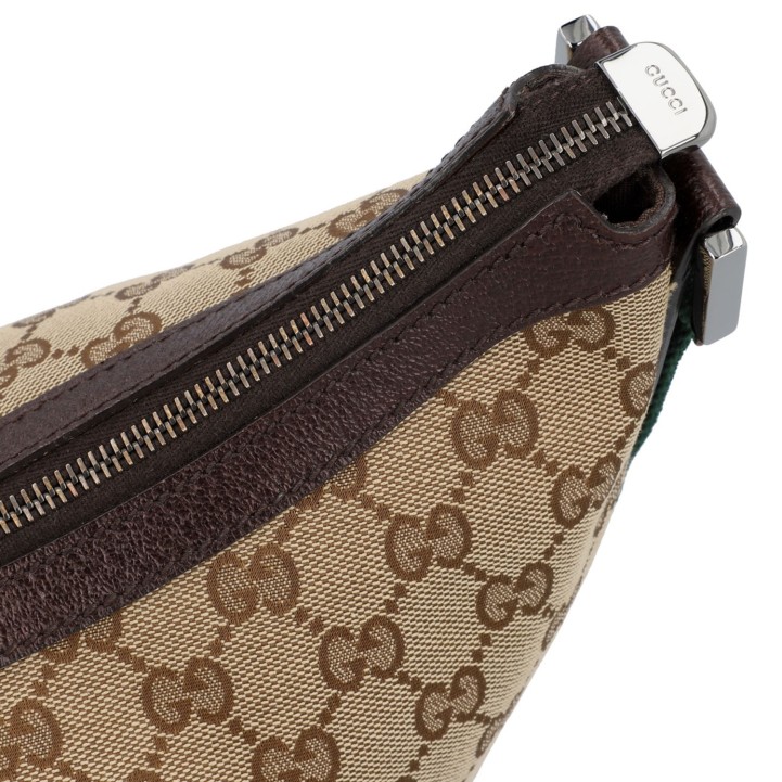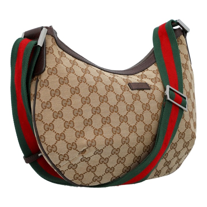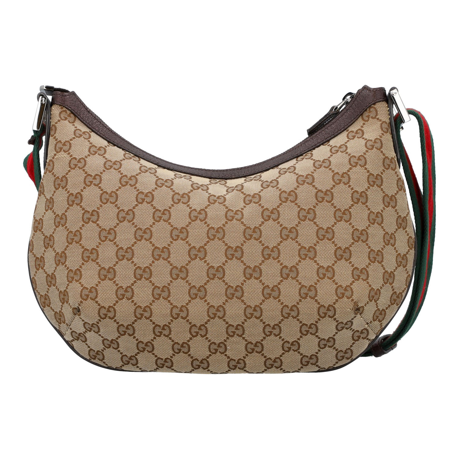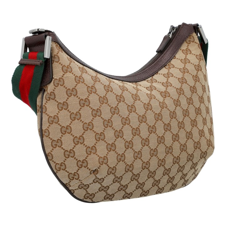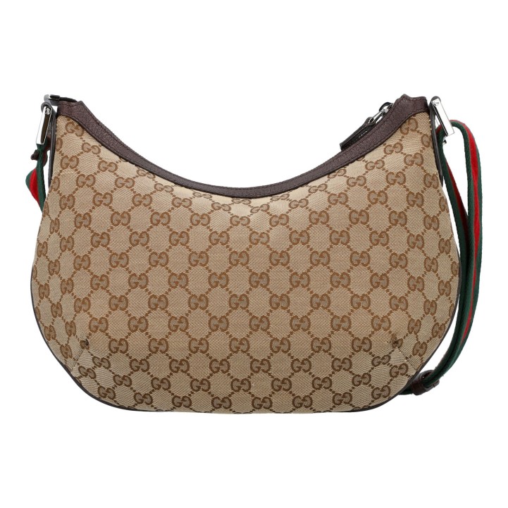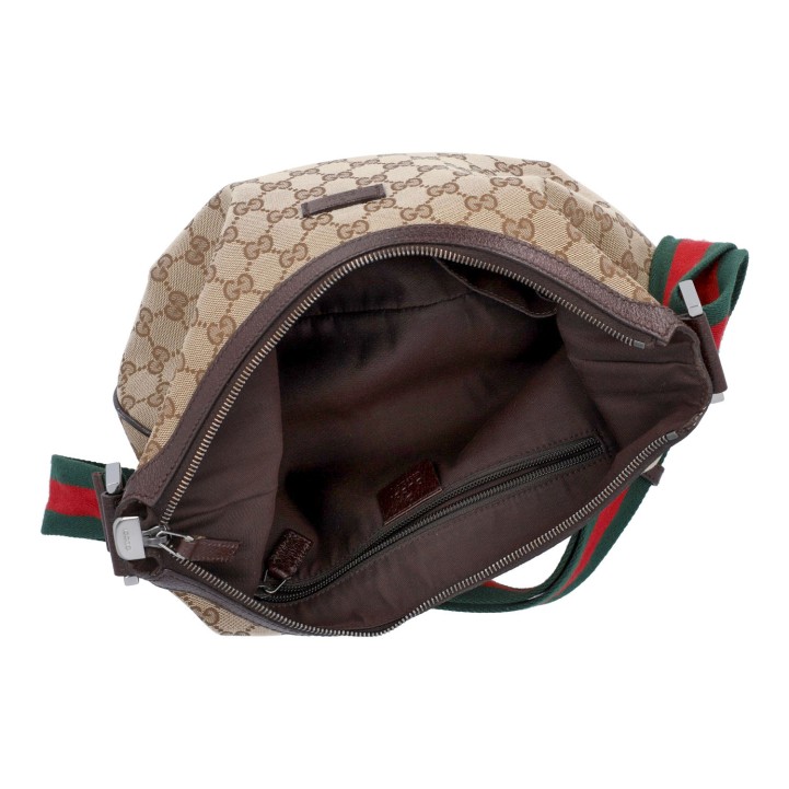 Guccissima-Canvas mit braunen Lederdetails, silberfarbener Hardware, Reißverschluss und längenverstellbarem Schulterriemen aus rot-grünem Textil. Innenraum aus braunem Textil mit zwei Fächern. Gebrauchsspuren vorhanden. 35 x 22 cm.