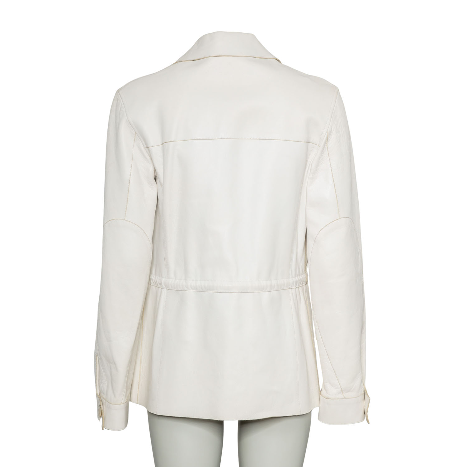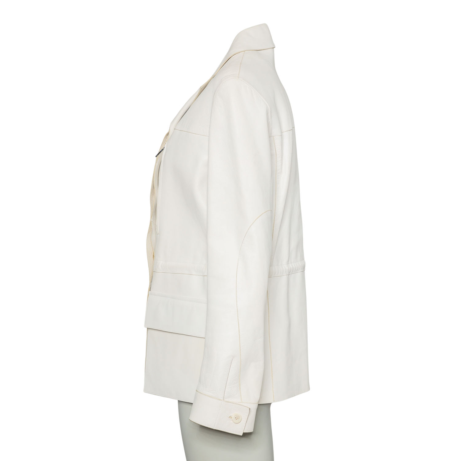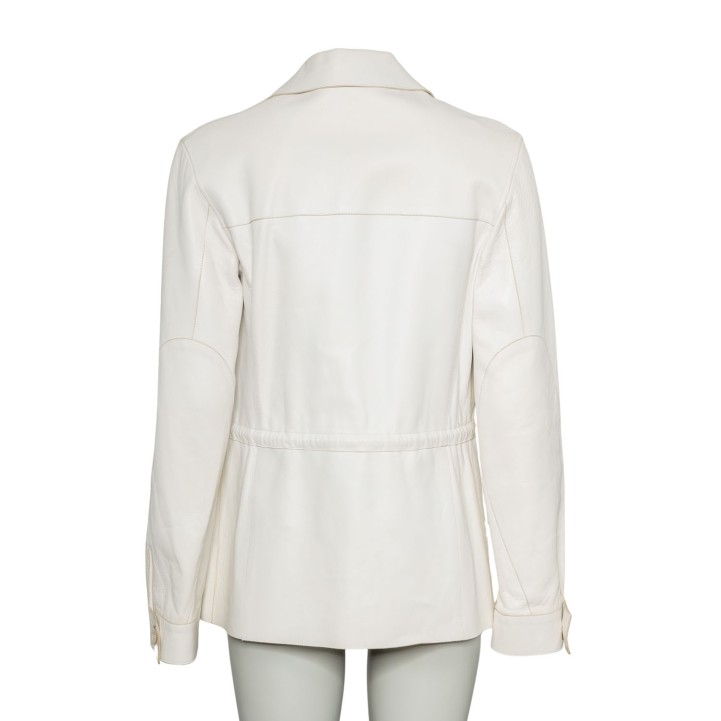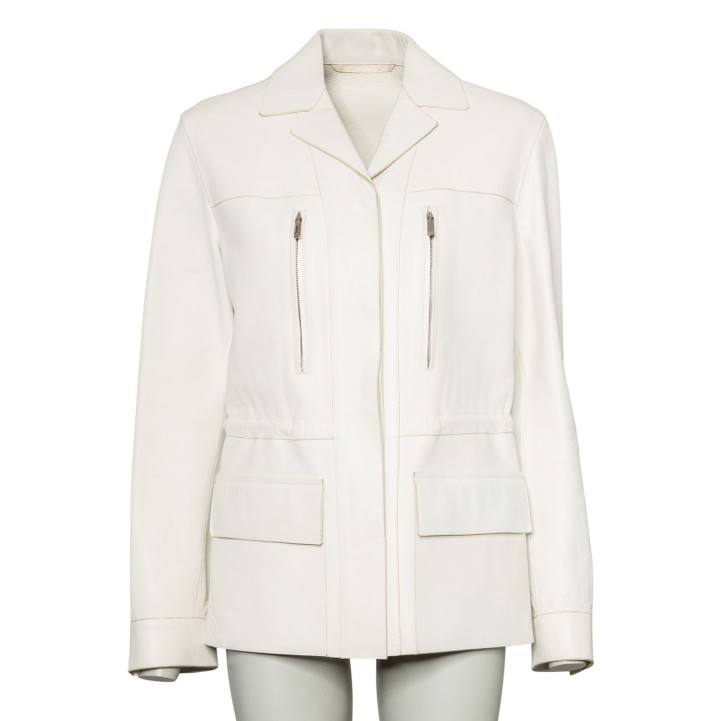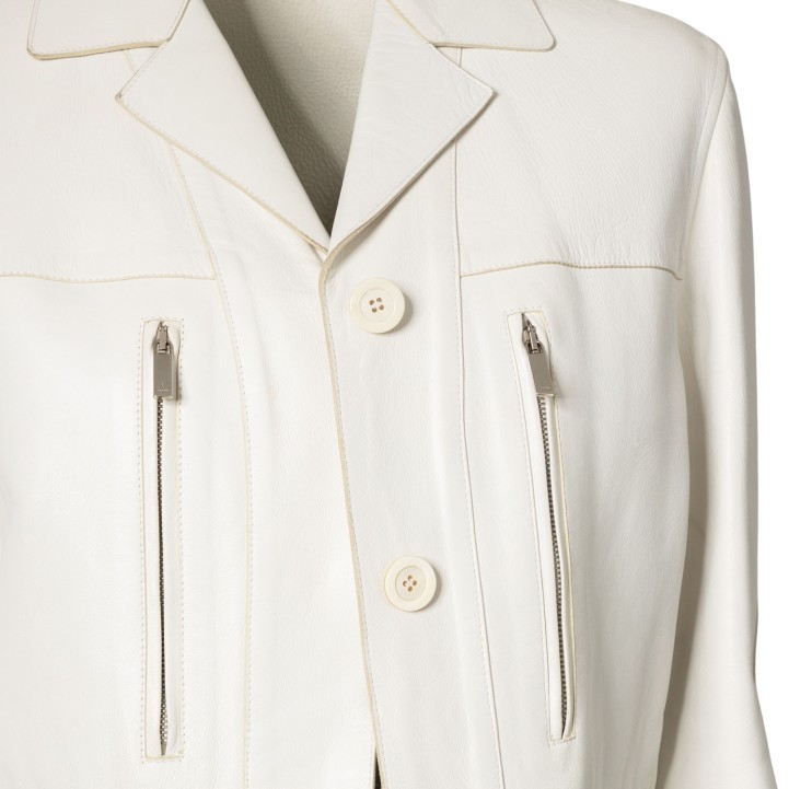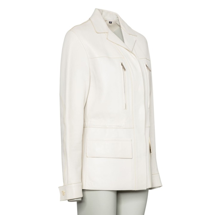 Weißes Leder mit Reverakrgen, Knopfverschluss, Pattentaschen und Reißverschlusstaschen. Tragespuren, Flecken und Verfägungen vorhanden.