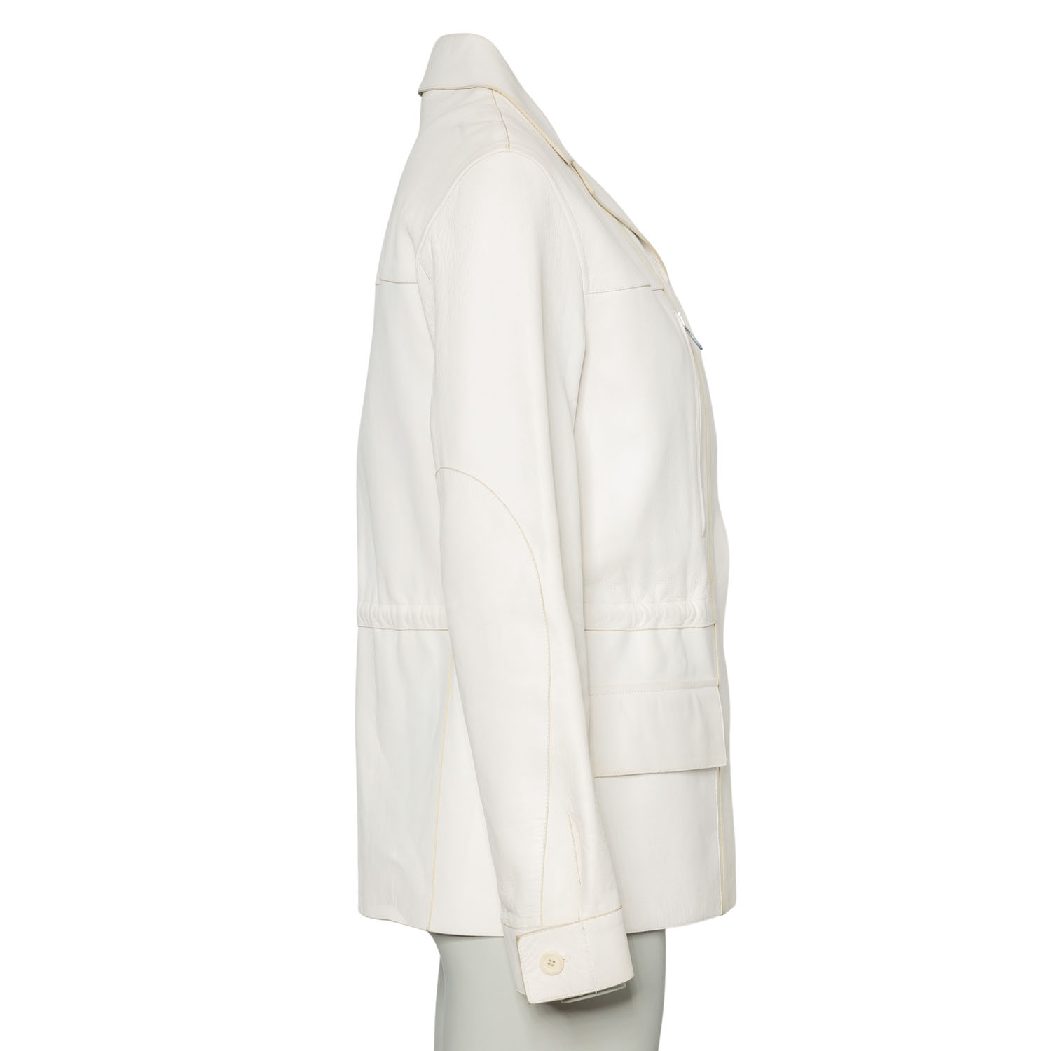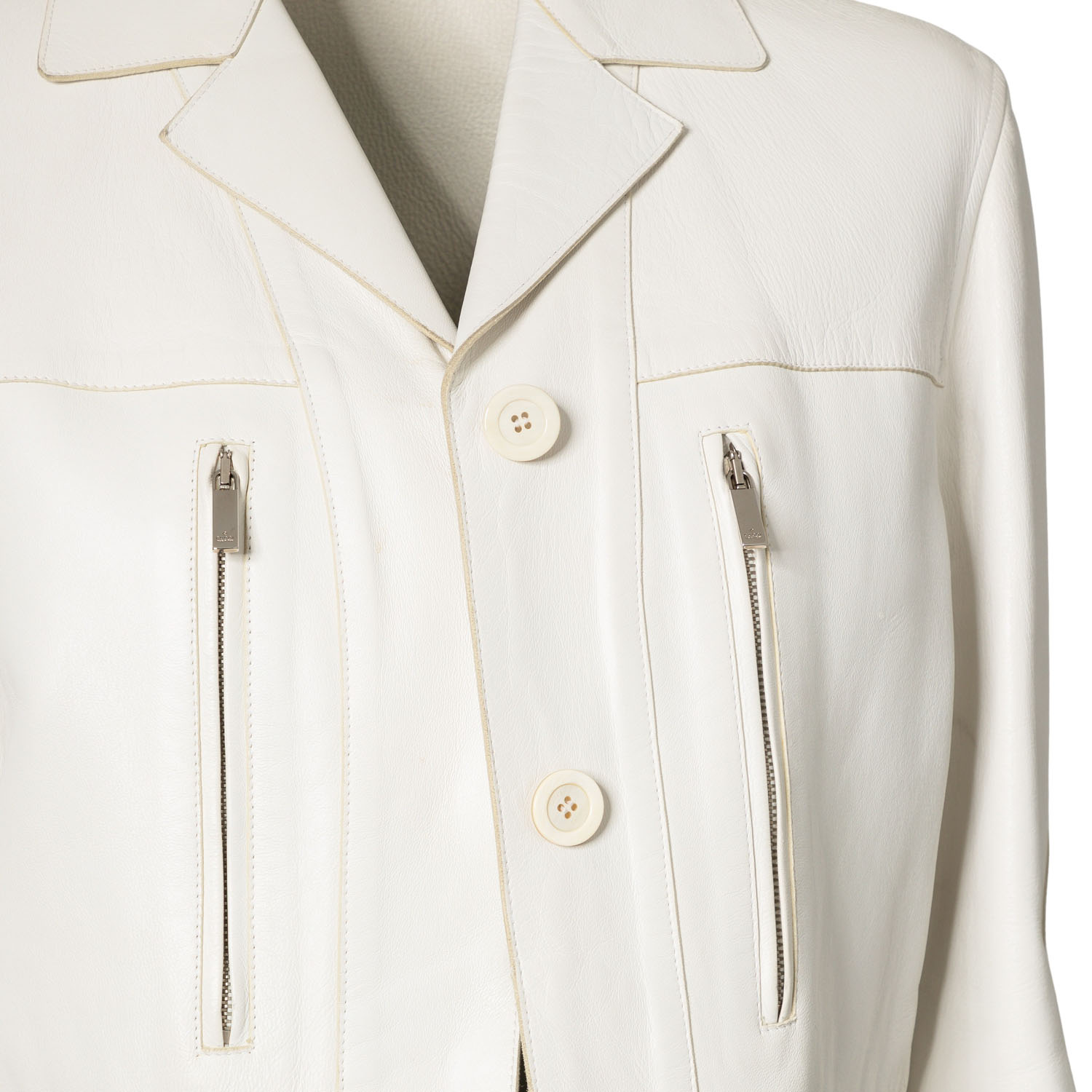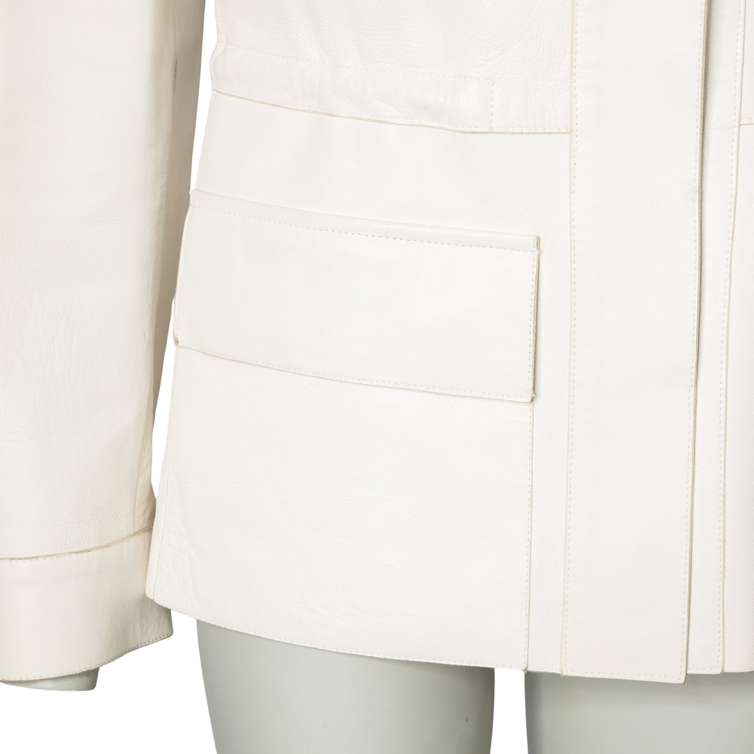 Weißes Leder mit Reverakrgen, Knopfverschluss, Pattentaschen und Reißverschlusstaschen. Tragespuren, Flecken und Verfägungen vorhanden.