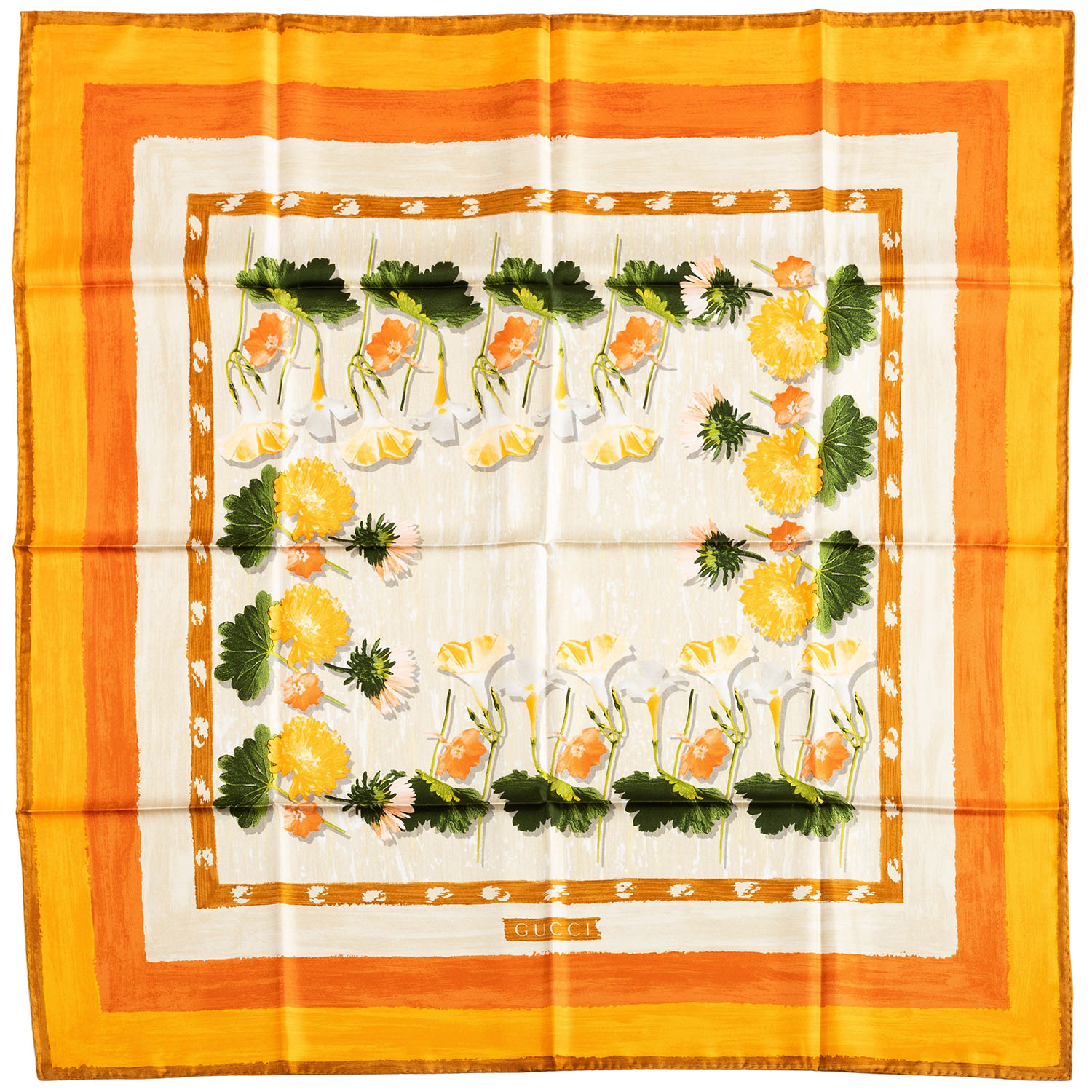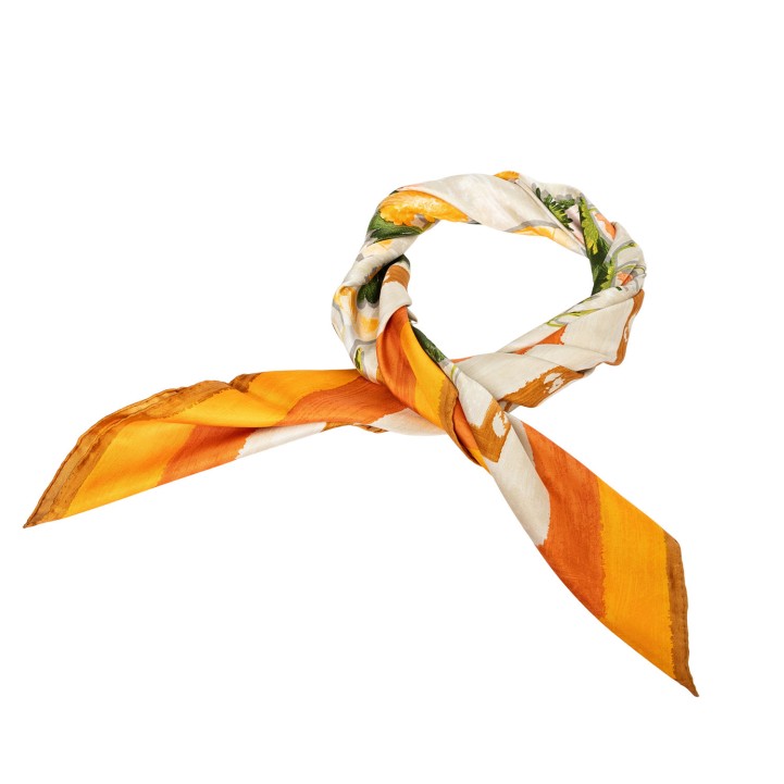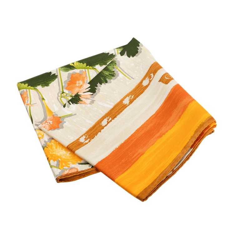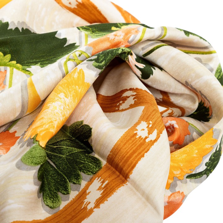 100% Seide in Orangetönen mit floraler Musterung auf beigem Grund. Handrollierter Saum. Sehr guter Erhalt. 90x90cm.
