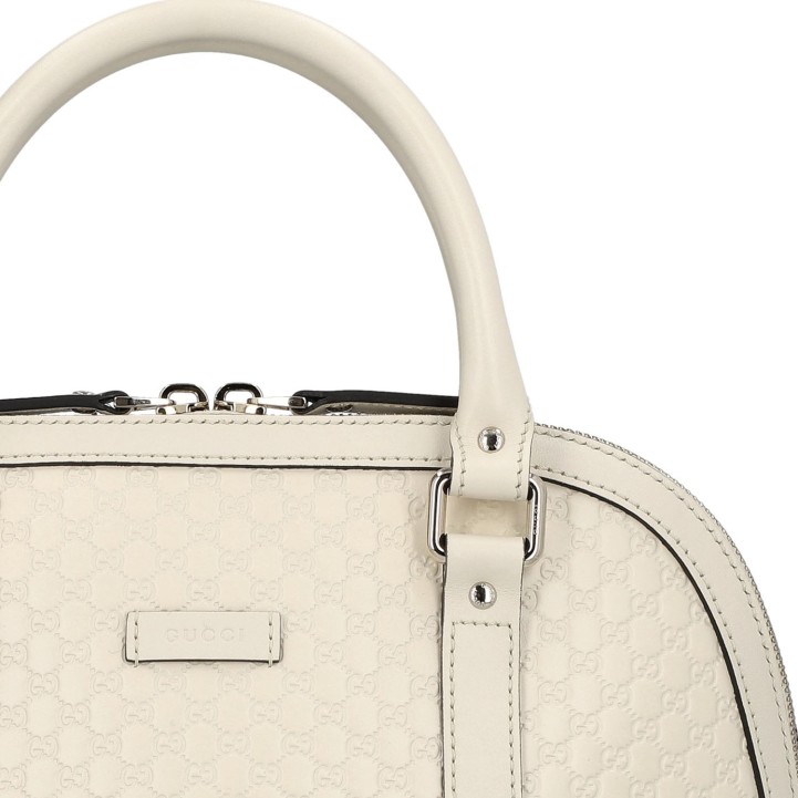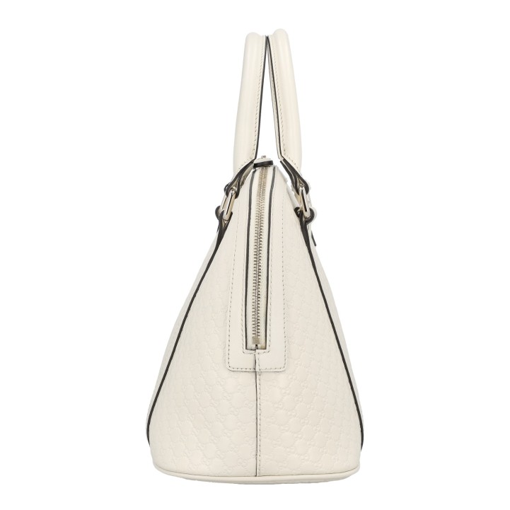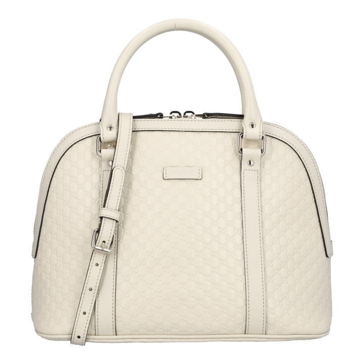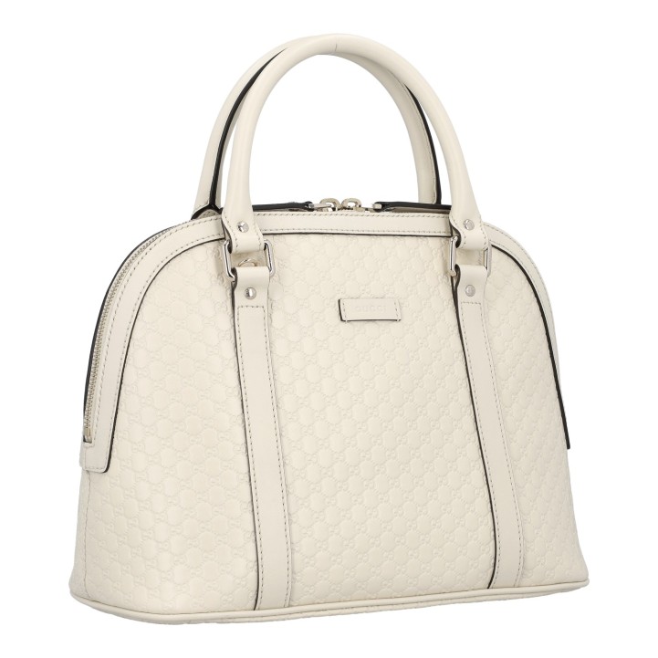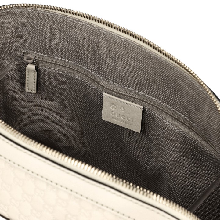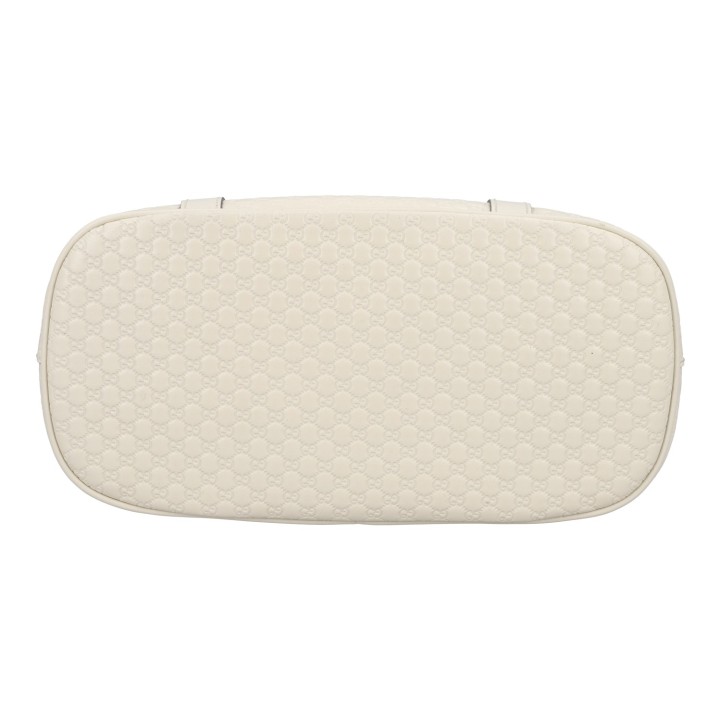 Aus Leder in Weiß mit Allover GG-Logo Prägung. Hauptfach mit umlaufendem Reißverschluss. Goldfarbene Hardware, textiles Innenfutter, drei kleine Seitenfächer. Schulterriemen und Staubbeutel anbei. Guter Erhalt. 31x16x22cm.