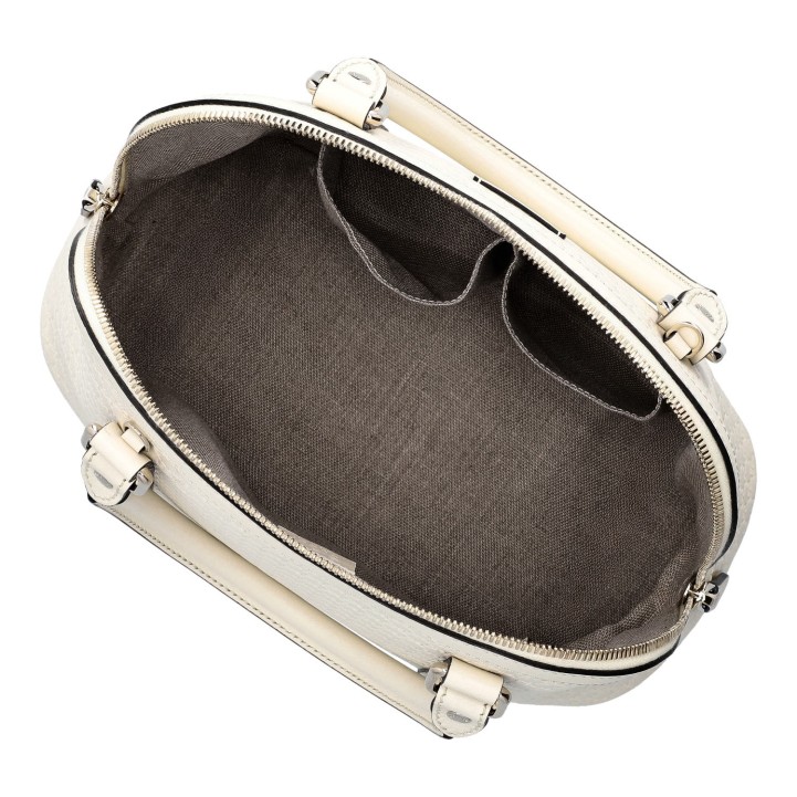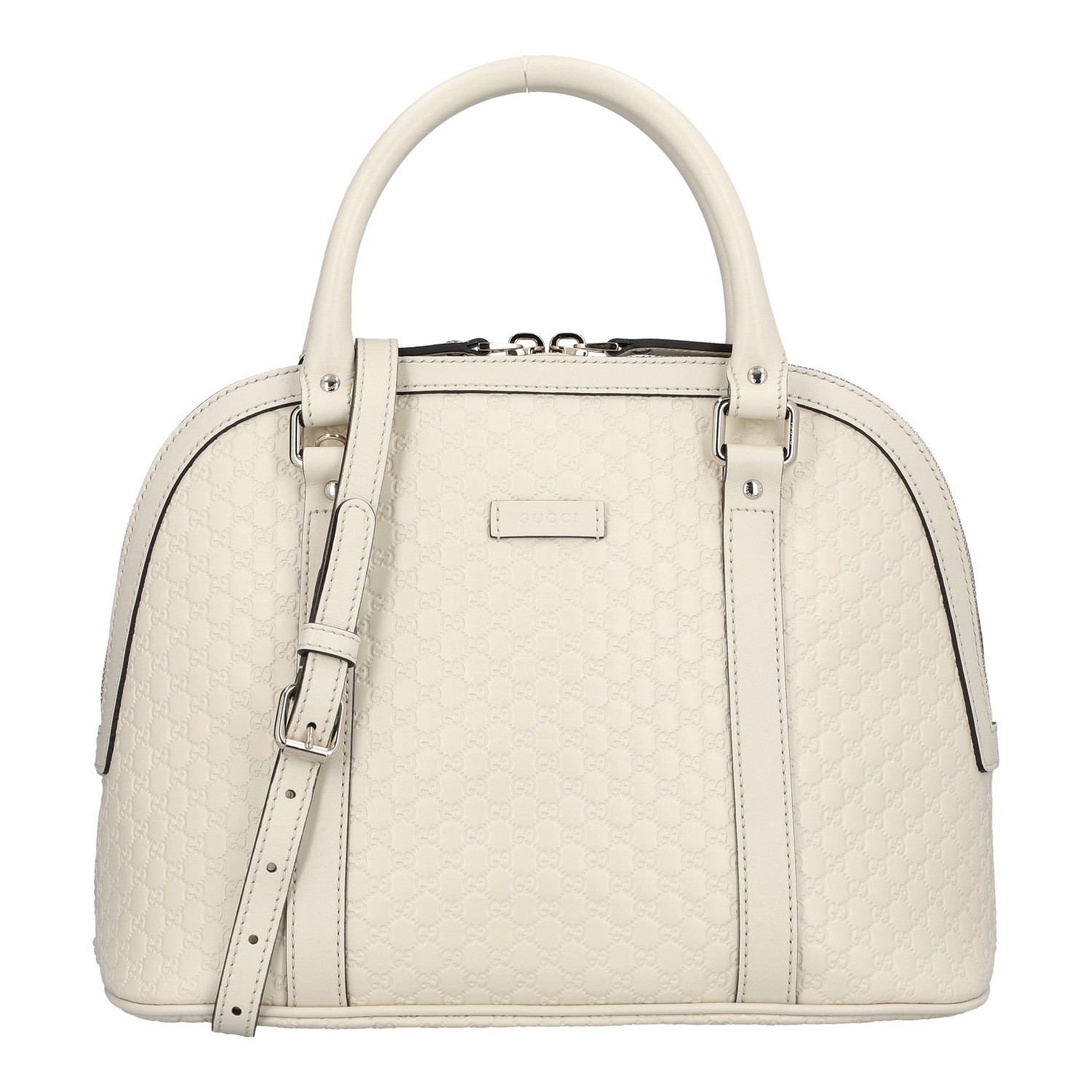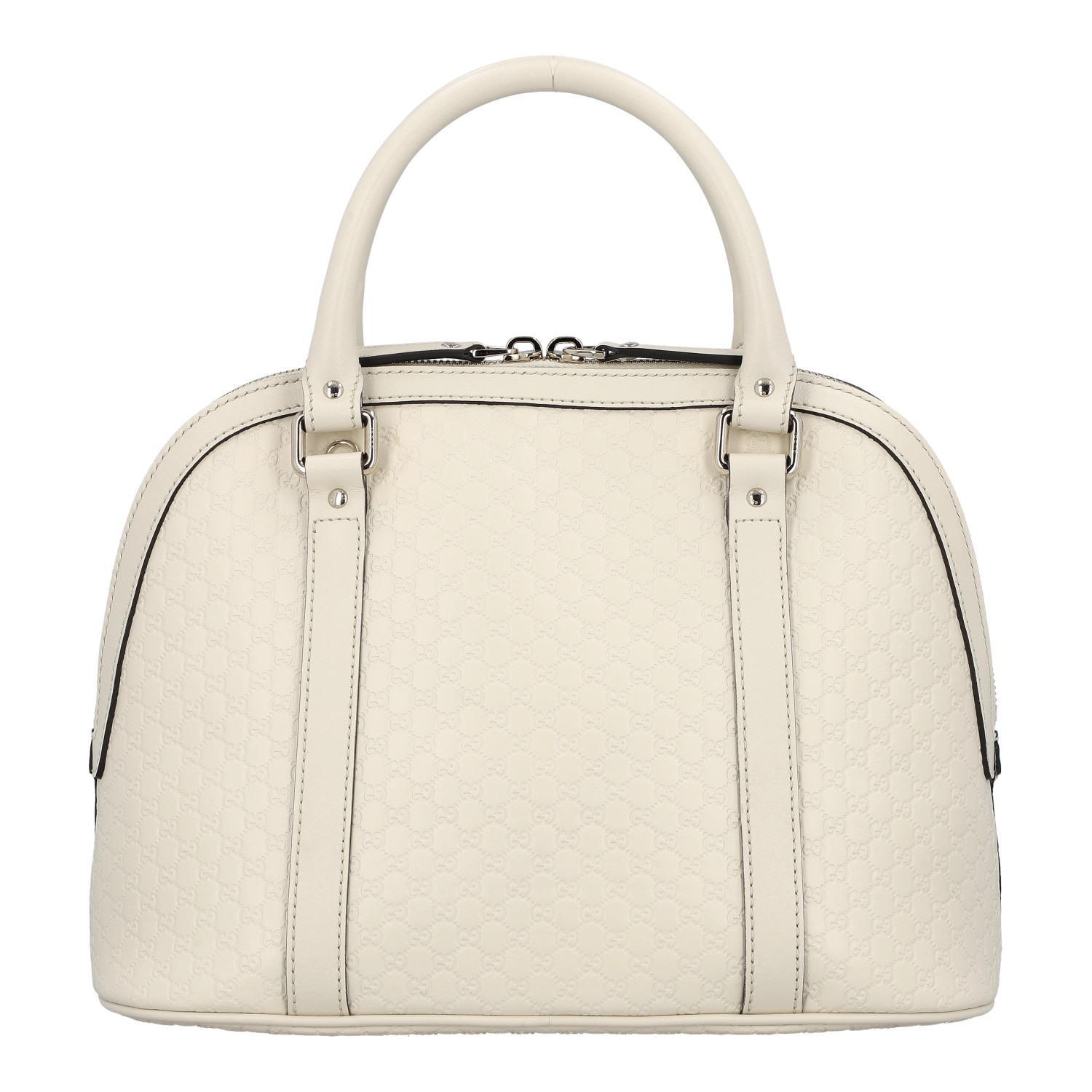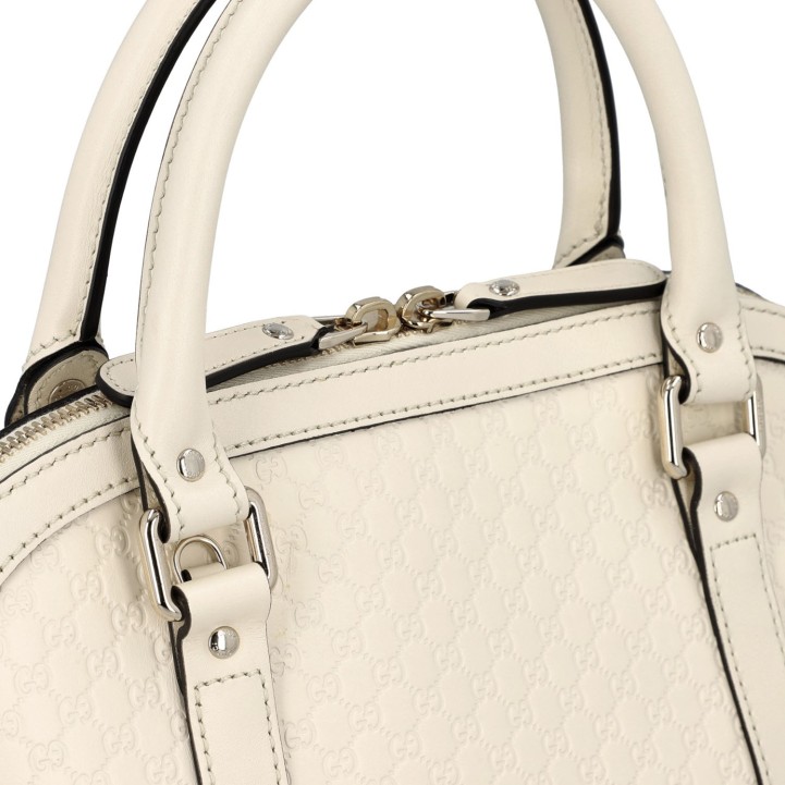 Aus Leder in Weiß mit Allover GG-Logo Prägung. Hauptfach mit umlaufendem Reißverschluss. Goldfarbene Hardware, textiles Innenfutter, drei kleine Seitenfächer. Schulterriemen und Staubbeutel anbei. Guter Erhalt. 31x16x22cm.