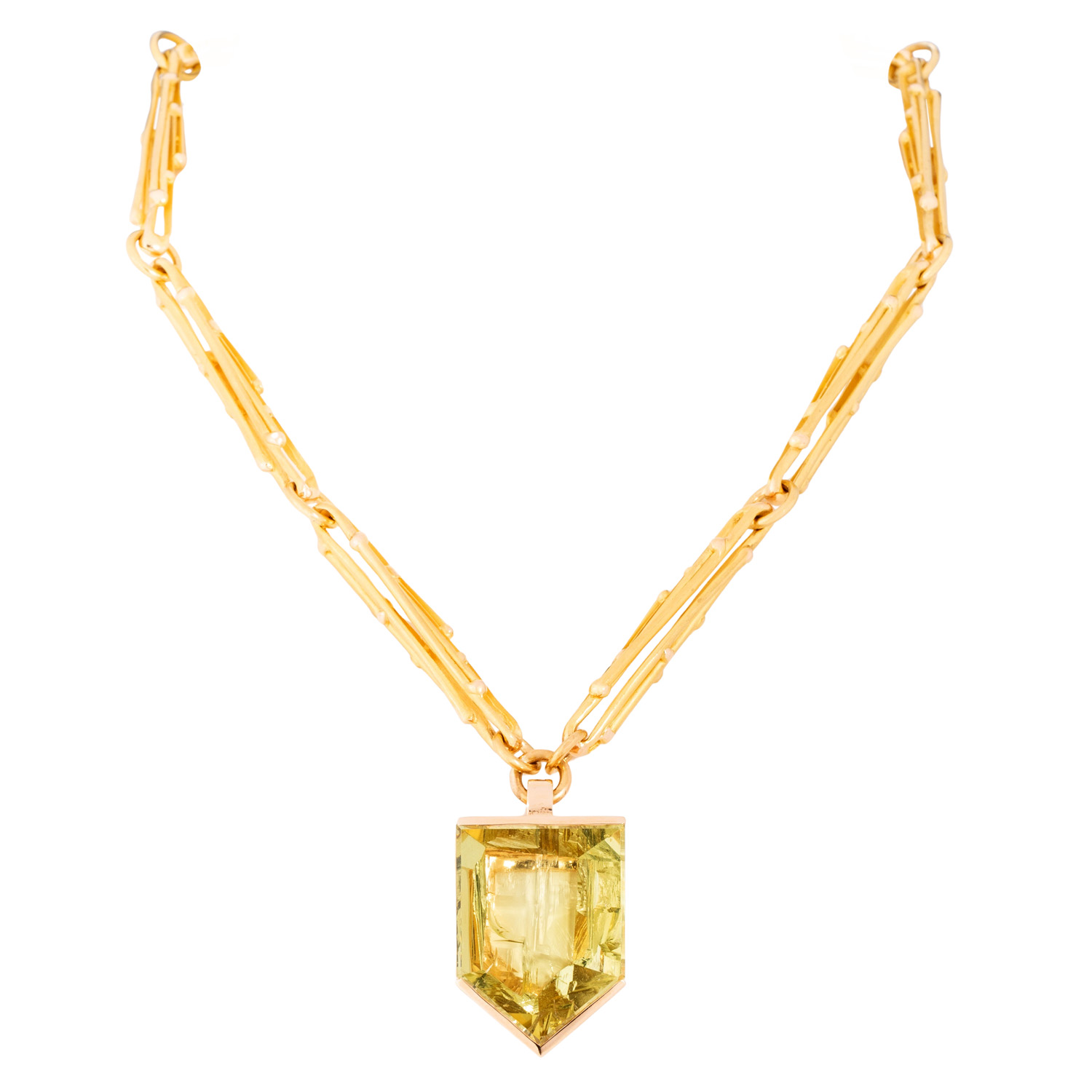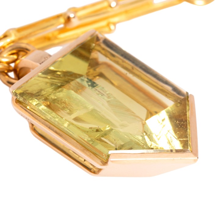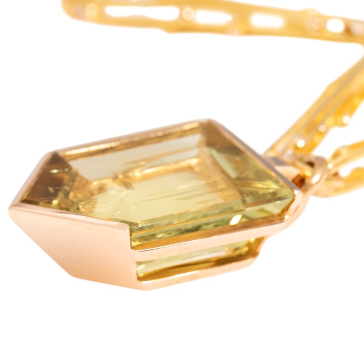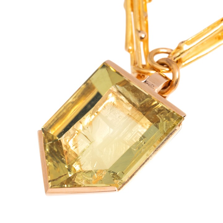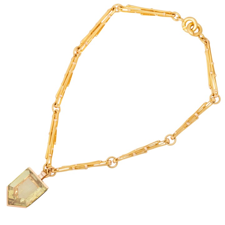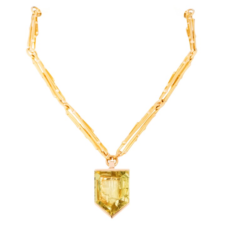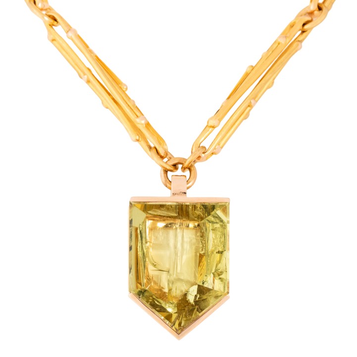 von 58,96 ct, rückseitig mit Rohkristallfläche, Anhänger RSG 18K, Kette GG 18K, 98,7 g, Kettenlänge ca. 42 cm, Anhänger Länge ca. 4,5 cm, 1990er Jahre, leichte Tragespuren, Herstellermarke a. d. Anhänger, inkl. 2 Kaufbelegen.
