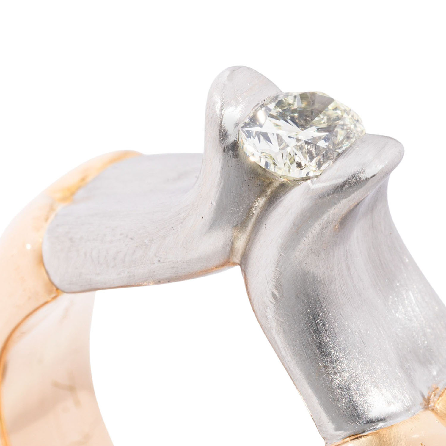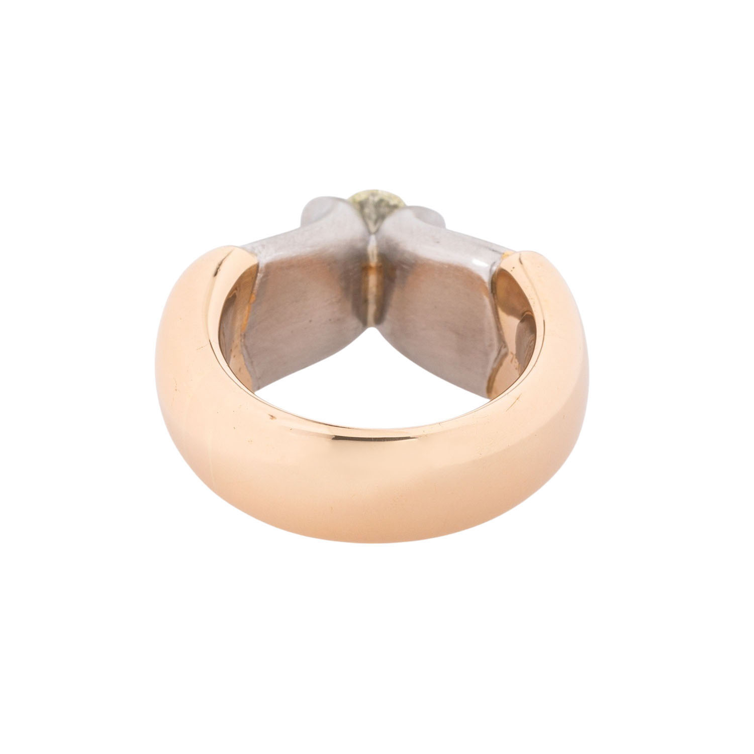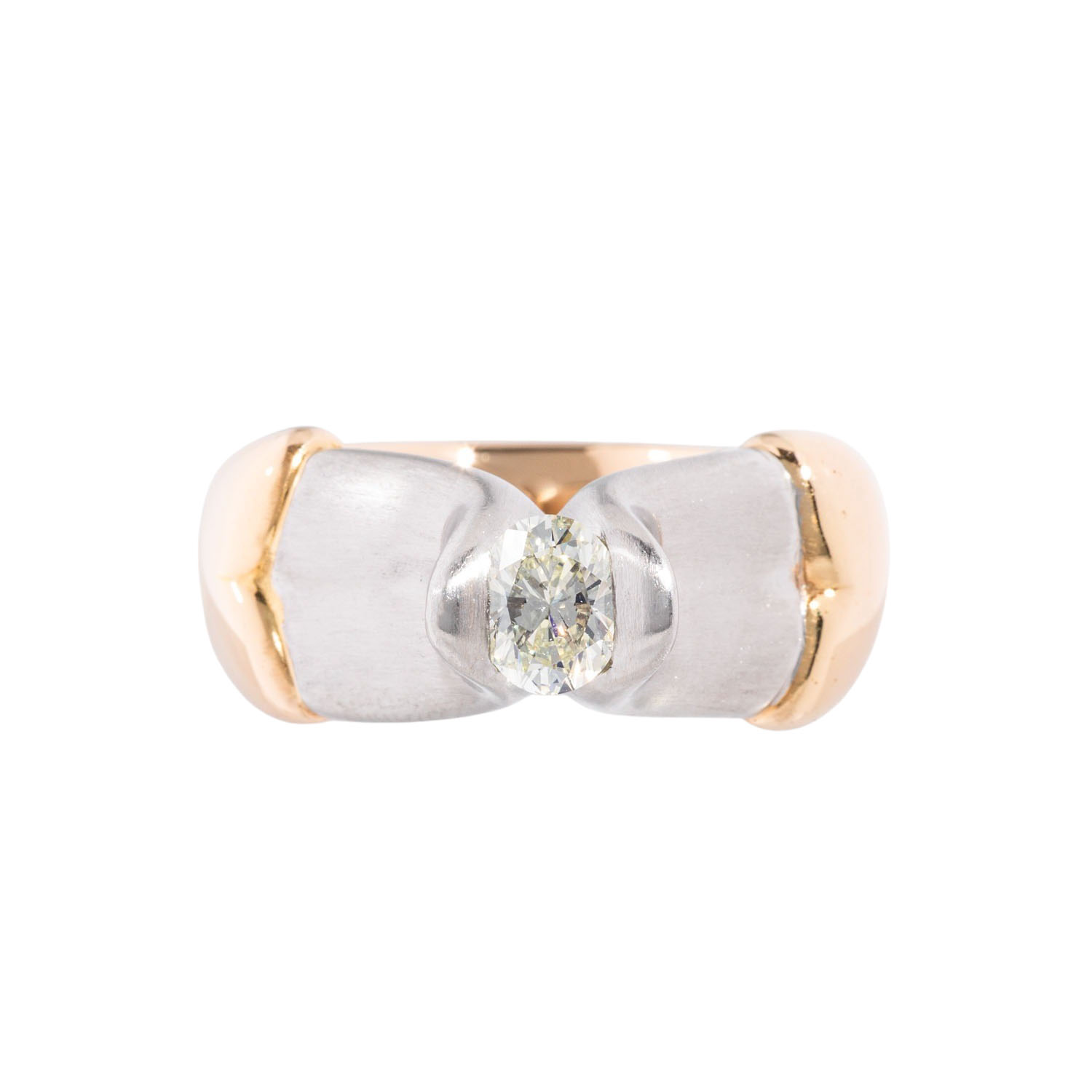 mit pastellgelbem, ovalen Diamanten 'light yellow' von ca. 0,93 ct, SI, GG 18K/PT 950, 37,9 g, RW: 60, 1990er Jahre, leichte Tragespuren, Haarrisse innenseitig in der Ringschiene, Unikat, Tomi Ungerer Zeichnung, mit Herstellersignatur und -Gravur, Rechnung von 1994 anbei.