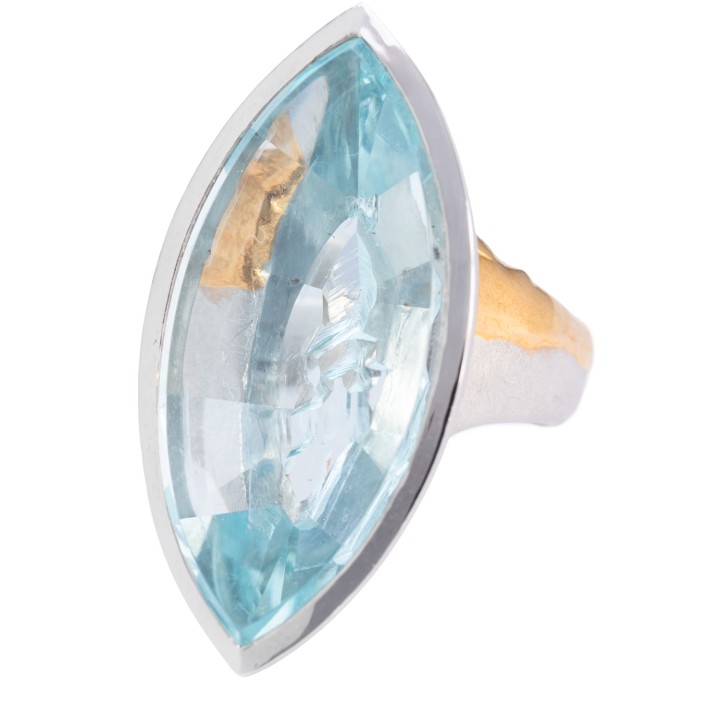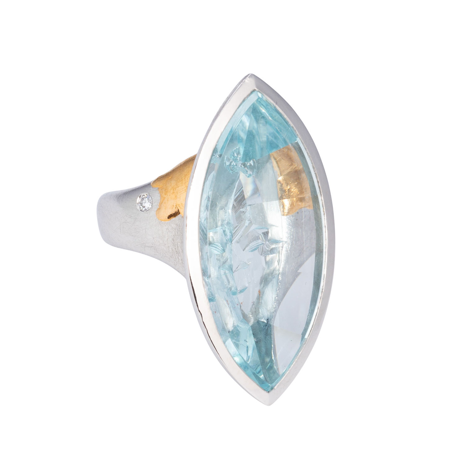 Spiegelschliff in Navetteform, unterseitig Kristall-Rohflächen tlw. graviert und 1 kleiner Brillant ca. 0,03 ct, Platin mit Feingolddetails, 35,9 g, RW: 53, Kauf in 1995, Tragespuren, punziert 'Krauss', mit Zertifikat und Kaufbeleg, UNIKAT!