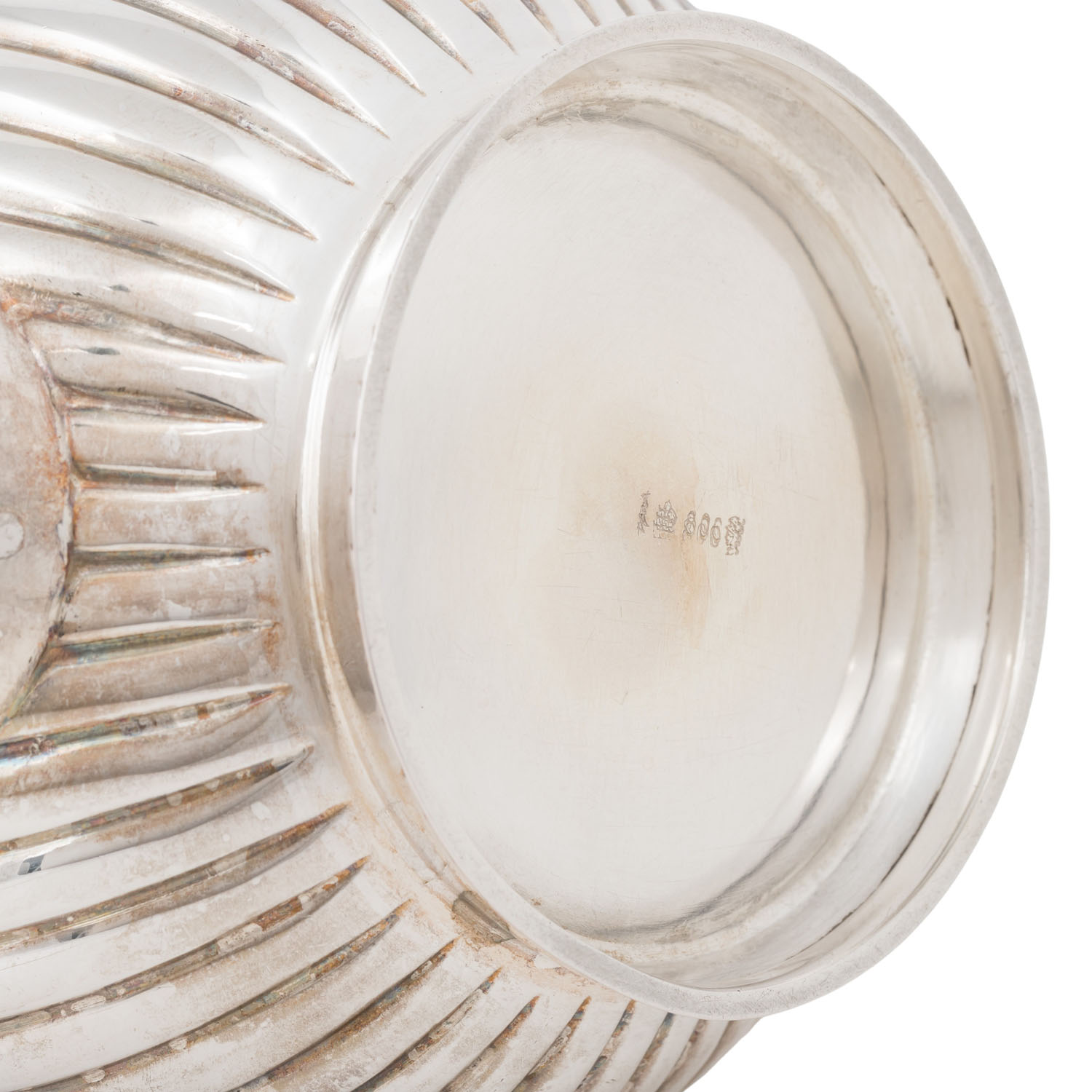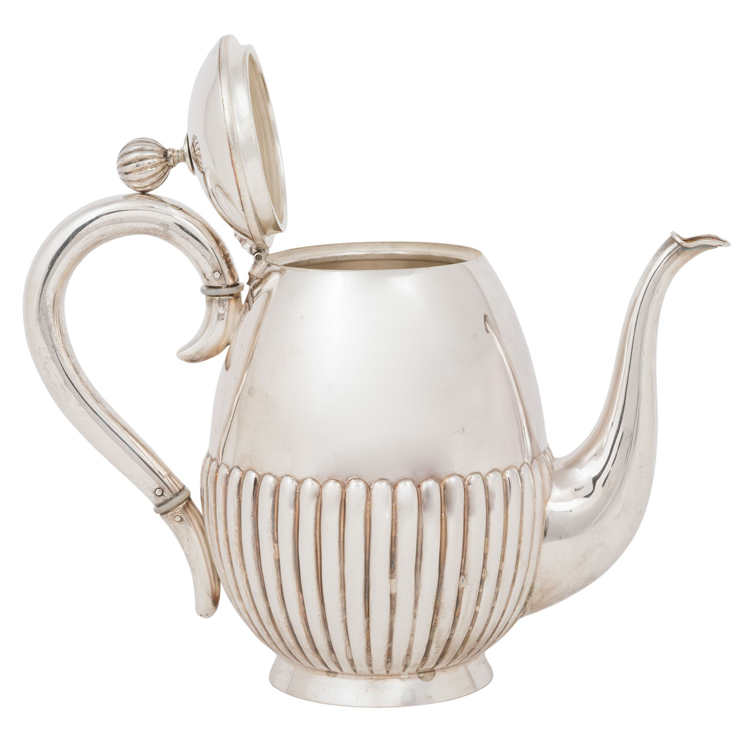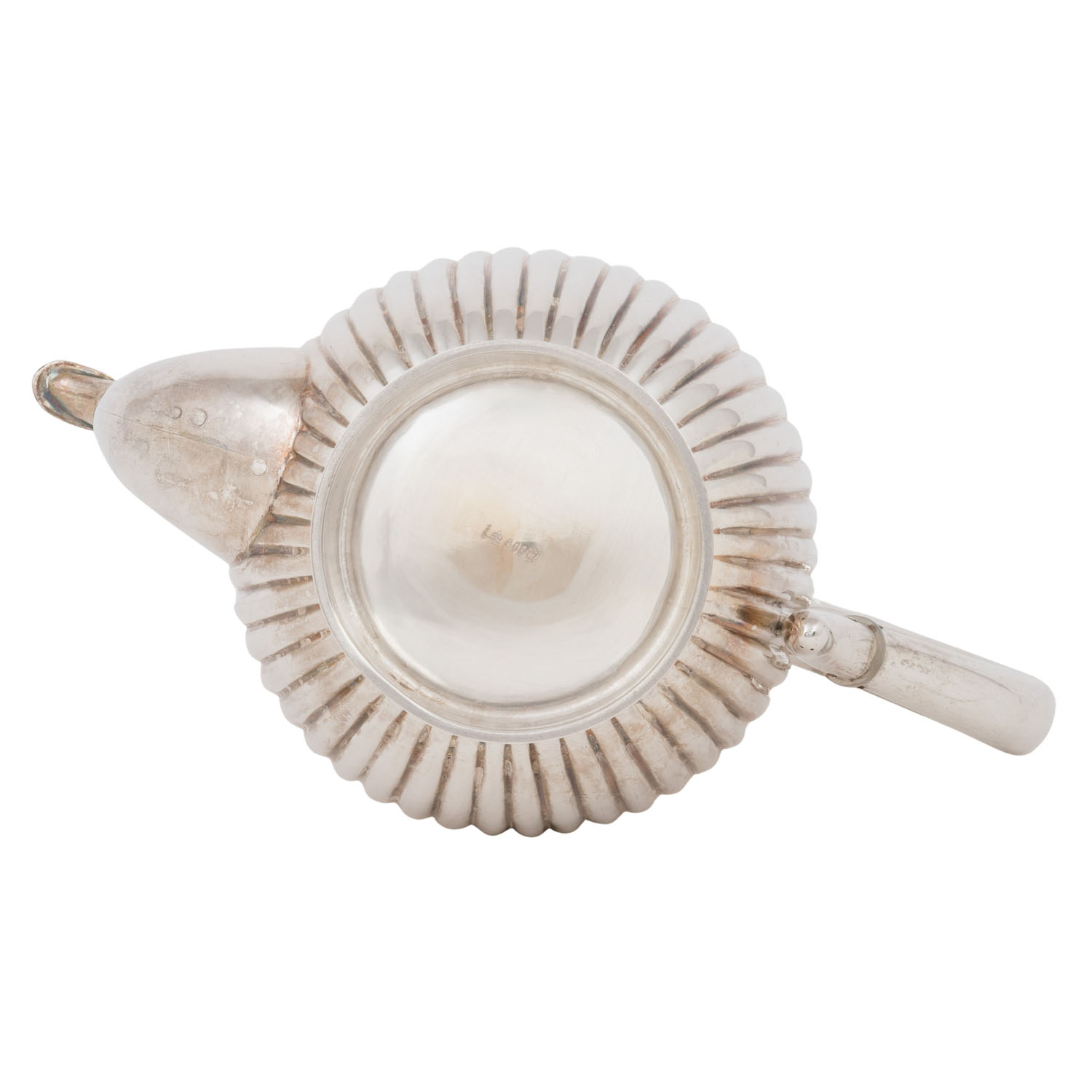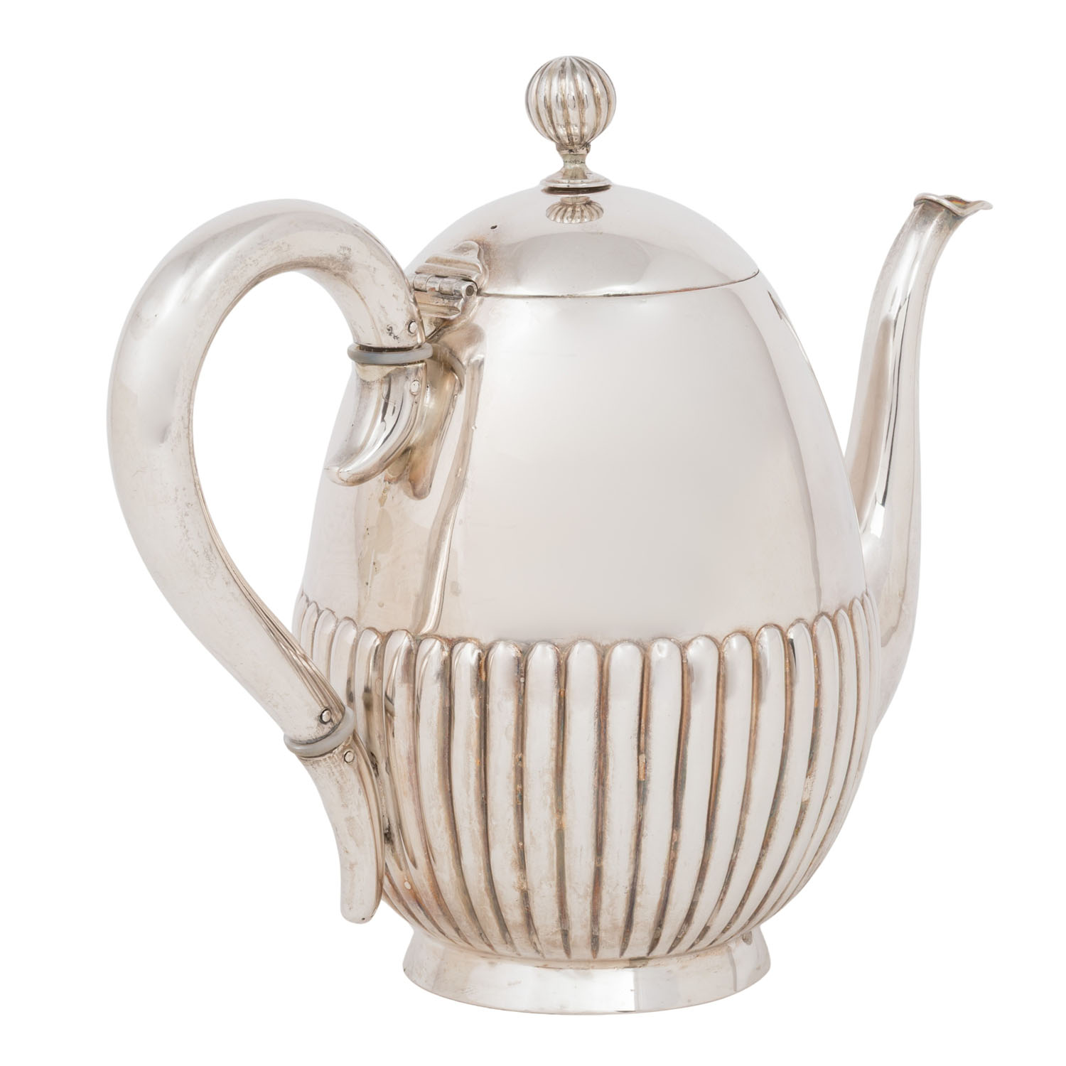 runder Standfuß, bauchige Wandung mit halbhohem, getriebenem Pfeifendekor, Schwanenhals-Ausgießer, ohrenförmige Handhabe mit Isolierringen (besch.), scharnierter Deckel mit kugelförmigem Deckelknauf, H: ca. 19 cm, Marken: Halbmond, Krone, 800, MZ, Gewicht ca. 497 g. Alters- und Gebrauchsspuren. Stellenweise min. gedellt. Leicht unebener Stand.