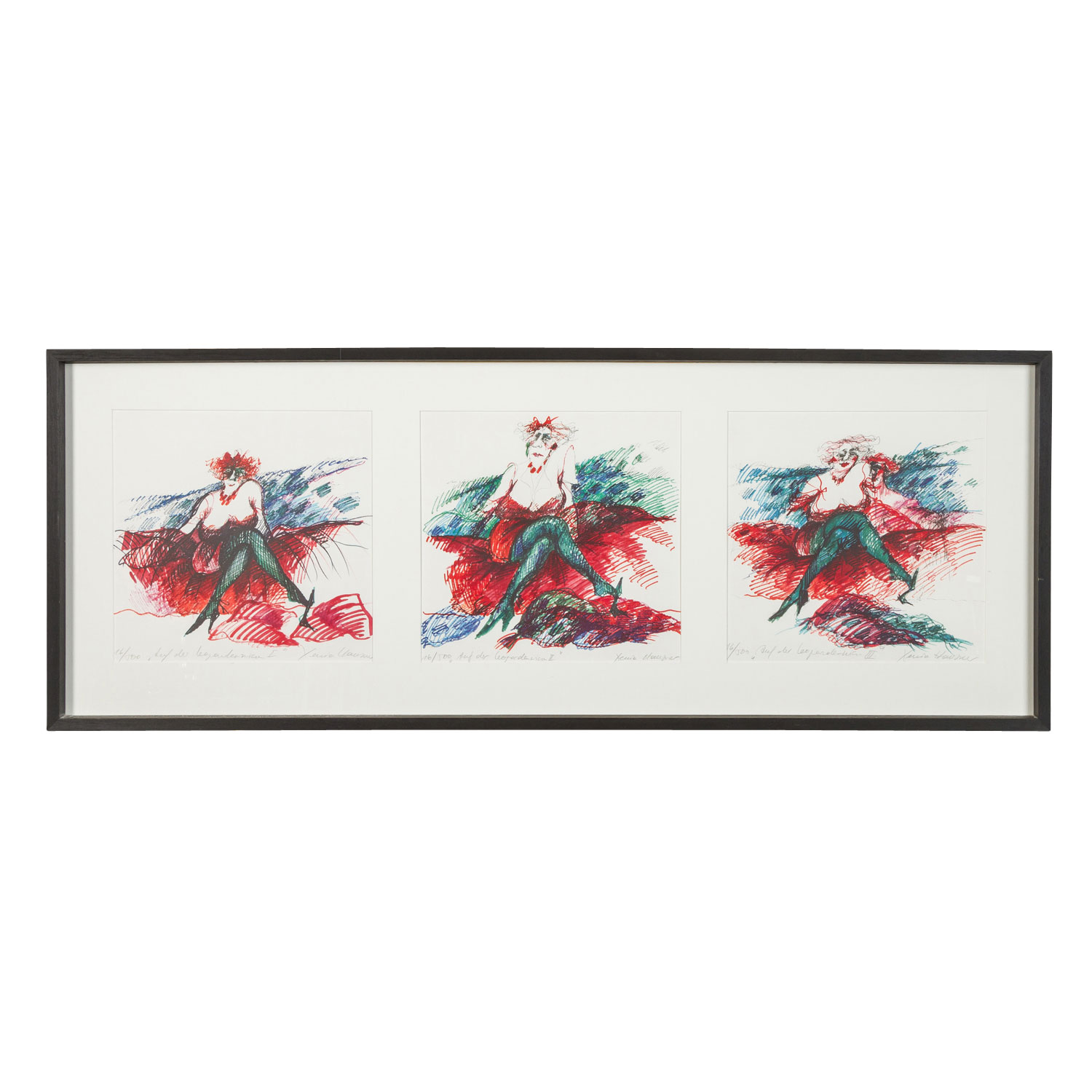 3 Farblithographien in einem Rahmen, jeweils u.li. mit Bleistift von Hand nummeriert 16/500 und betitelt, jeweils u.re. mit Bleistift von Hand signiert, HxB: Passepartout-Ausschnitt jeweils ca. 28x28 cm, Außenmaße Rahmen ca. 41x110 cm. Altersspuren. Im Passepartout hinter Glas gerahmt (Alters- und Beriebsspuren).