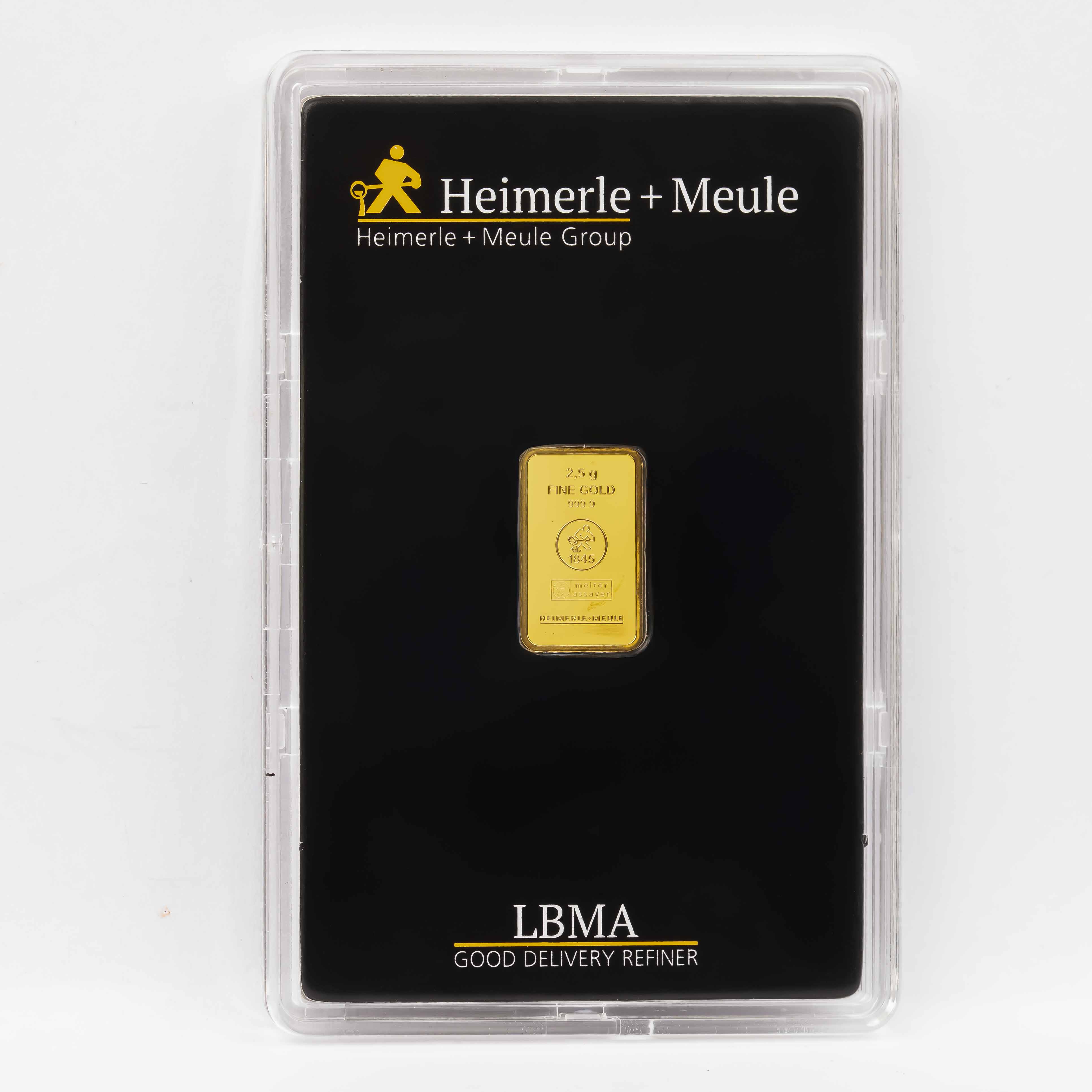 Goldbarren – 2,5g GOLD fein, geprägter Goldbarren, Heimerle+Meule,