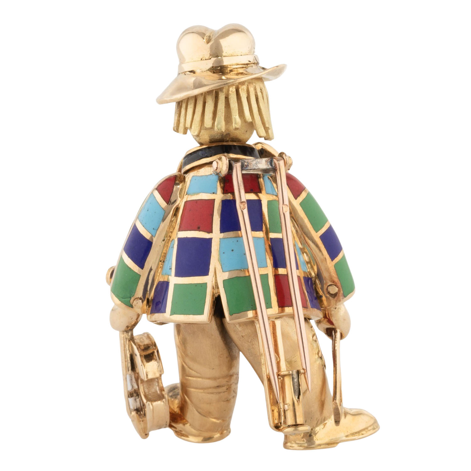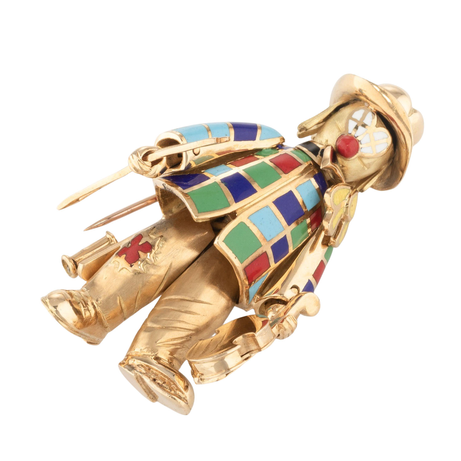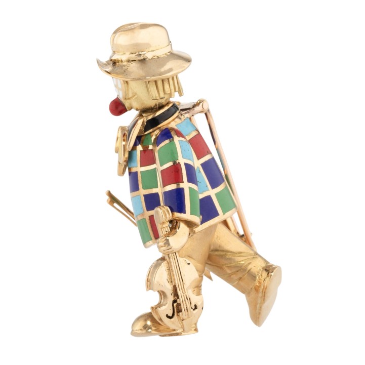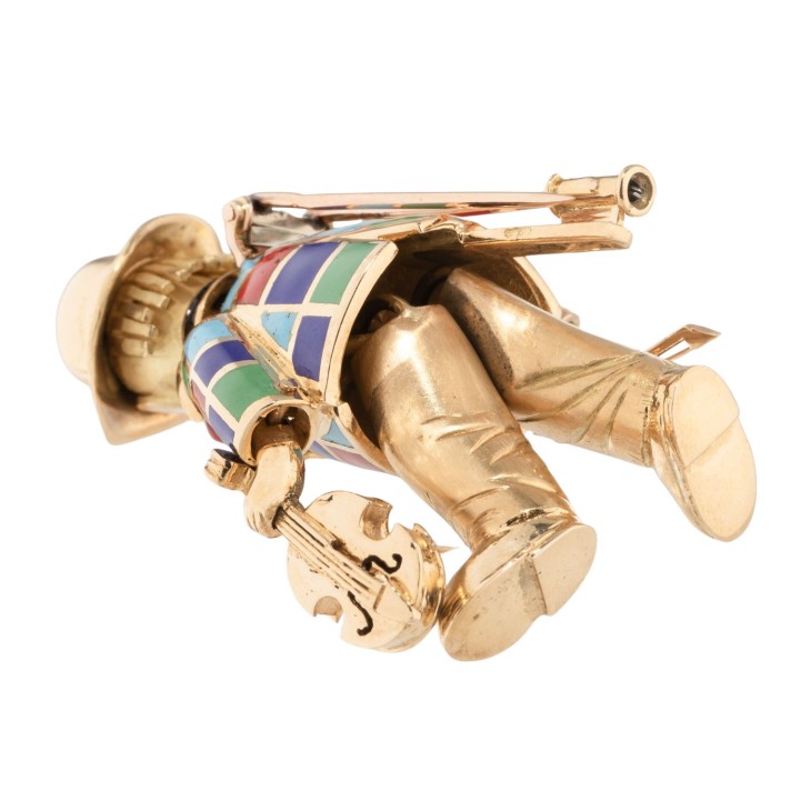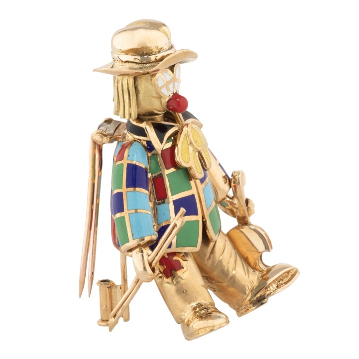 aus GG 18K, 34 g, 4,5x2,5x1,5 cm, voll beweglich montiert mit opak vielfarbigem Email, äußerst liebevolle Darstellung, Frankreich 2. H. 20. Jh., Email am Kragen hinten min. bestoßen, ansonsten sehr guter Erhalt, mit franz. Amtspunze, sehr schöne sammelwürdige Arbeit.