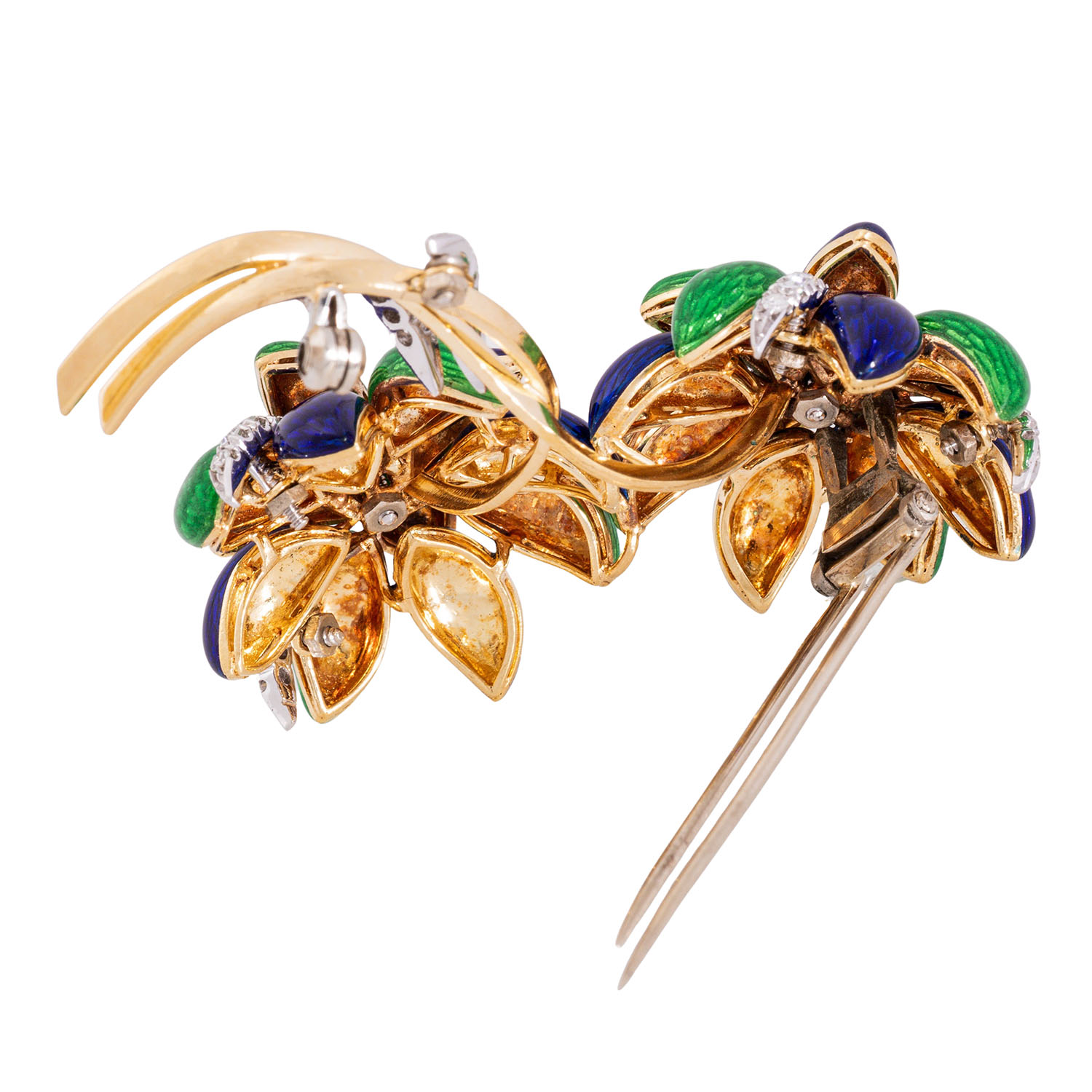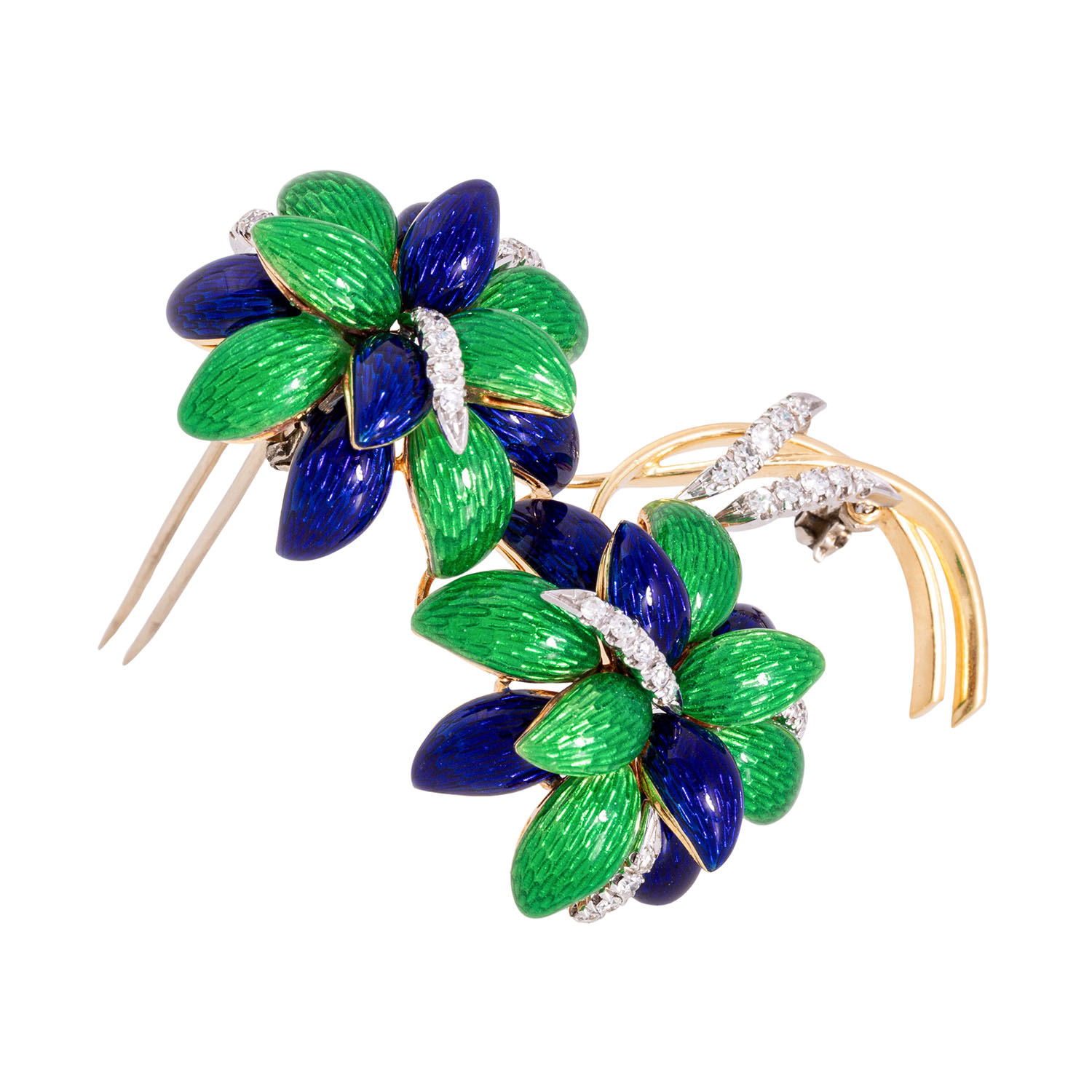 zus. ca. 0,53 ct, FW-WEISS (F-H)/VS-SI, grünes und blaues transparentes Email auf strukturiertem Grund, GG/WG 18K, 32,6 g, L: ca. 6 cm, B: ca. 4,5 cm, um 1950/60, altersgemäß sehr guter Zustand, ausdrucksstarke Darstellung in meisterlicher Ausführung mit Handgravur.