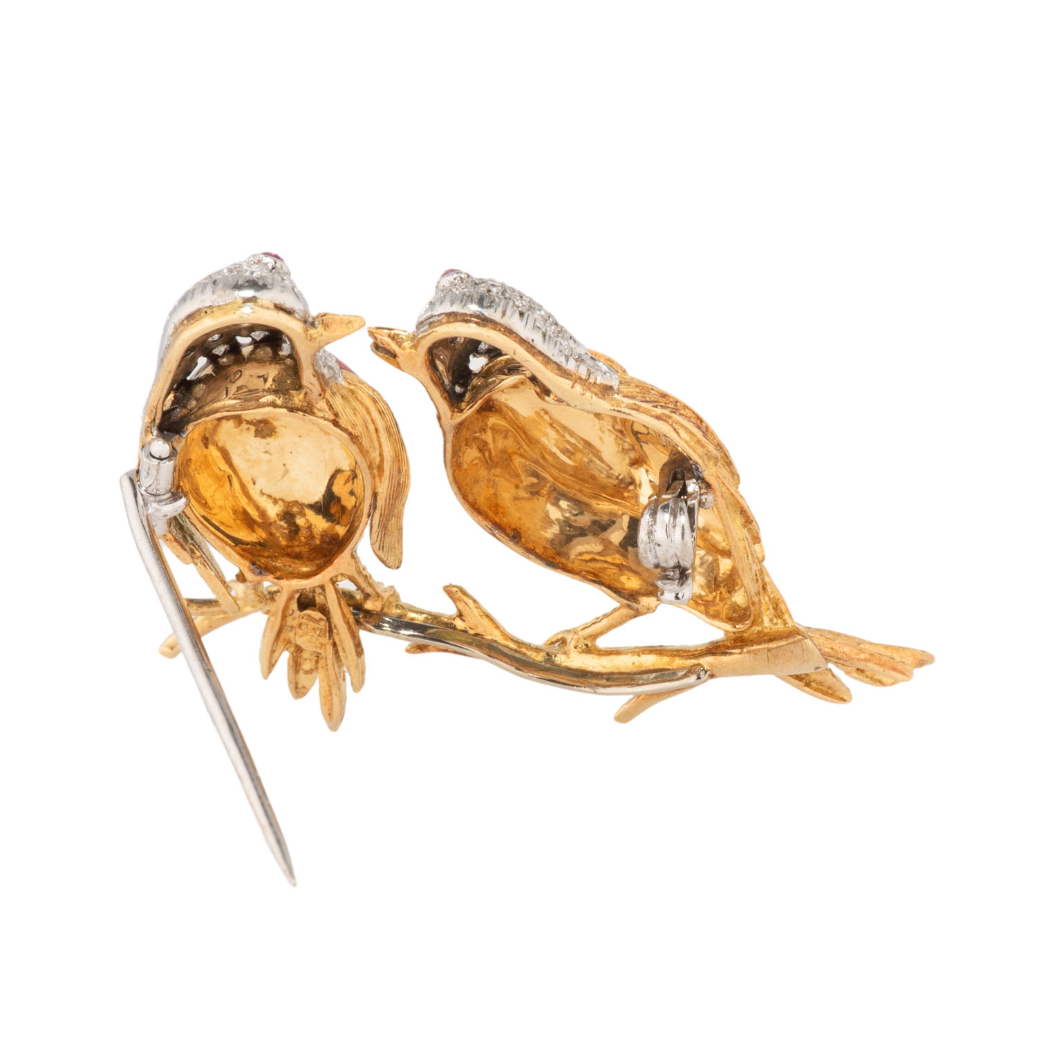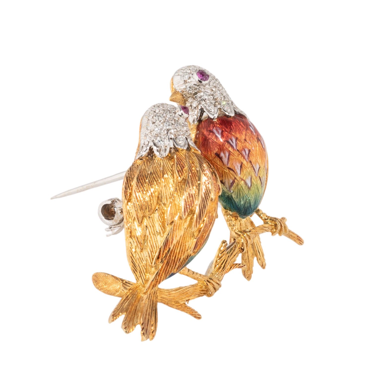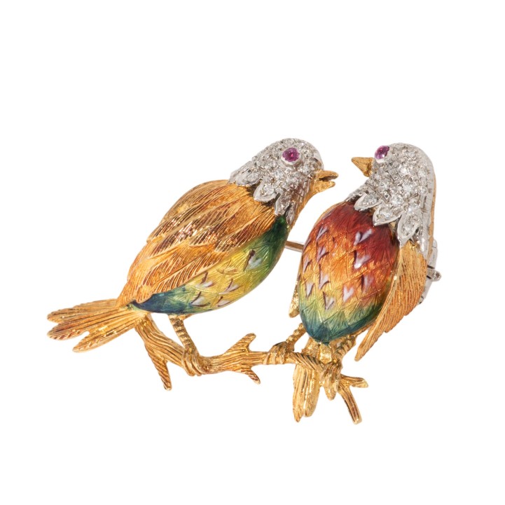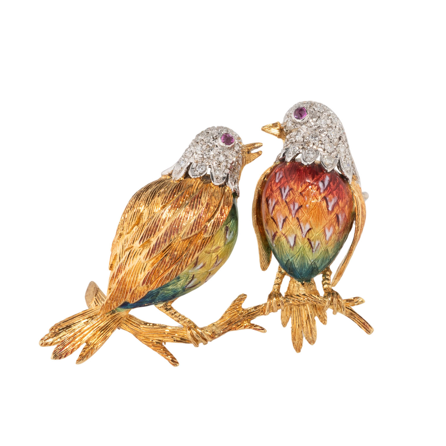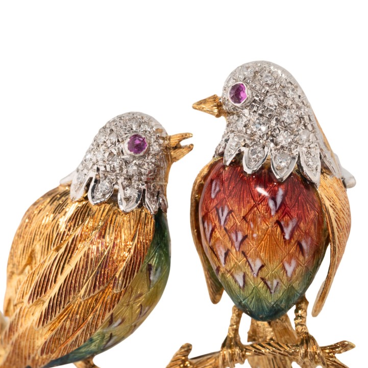 Herausragende Brosche 'Vogelgezwitscher', mit buntem Email, 2 Rubinen und 35 Achtkantdiamanten,