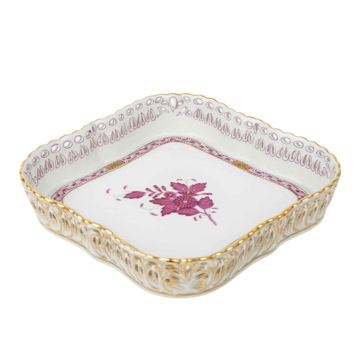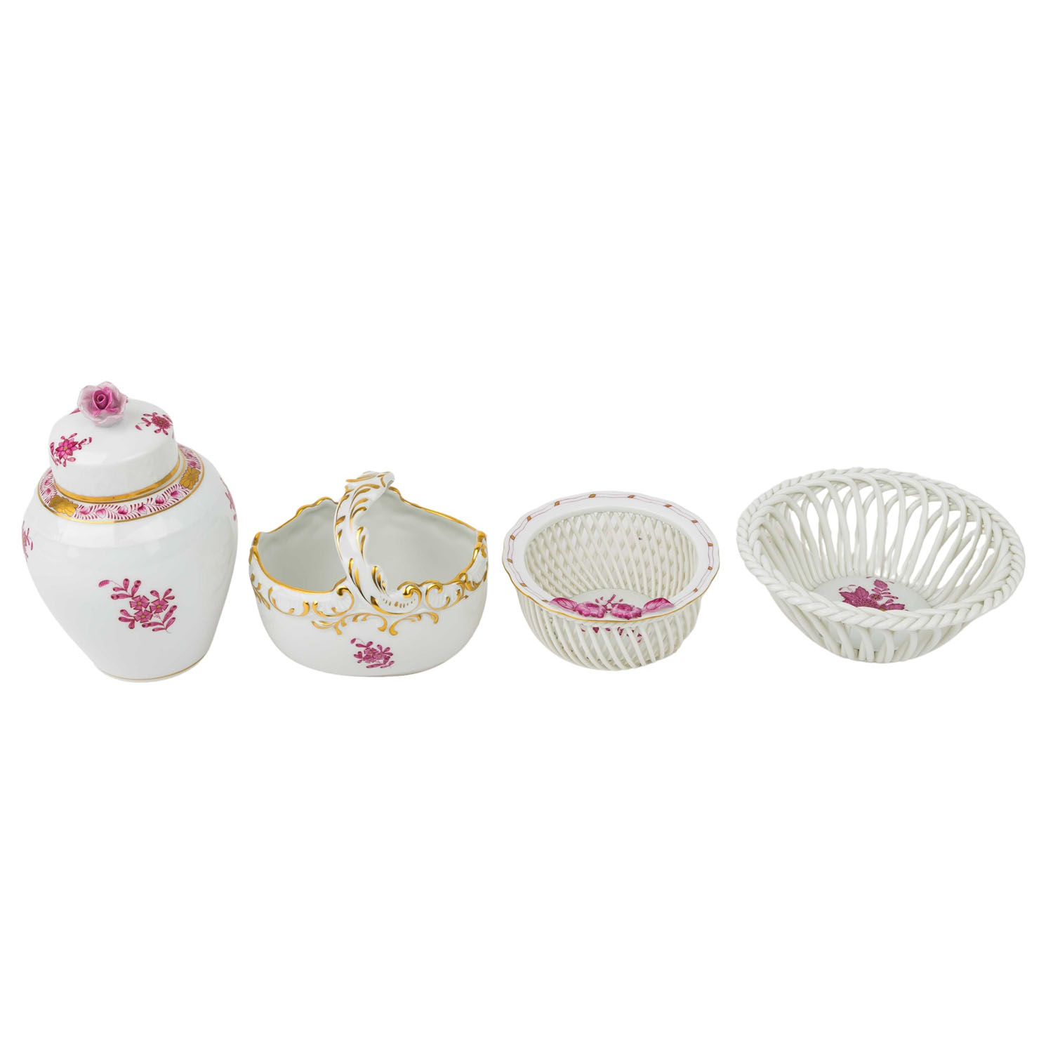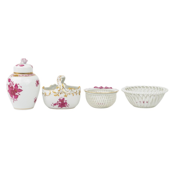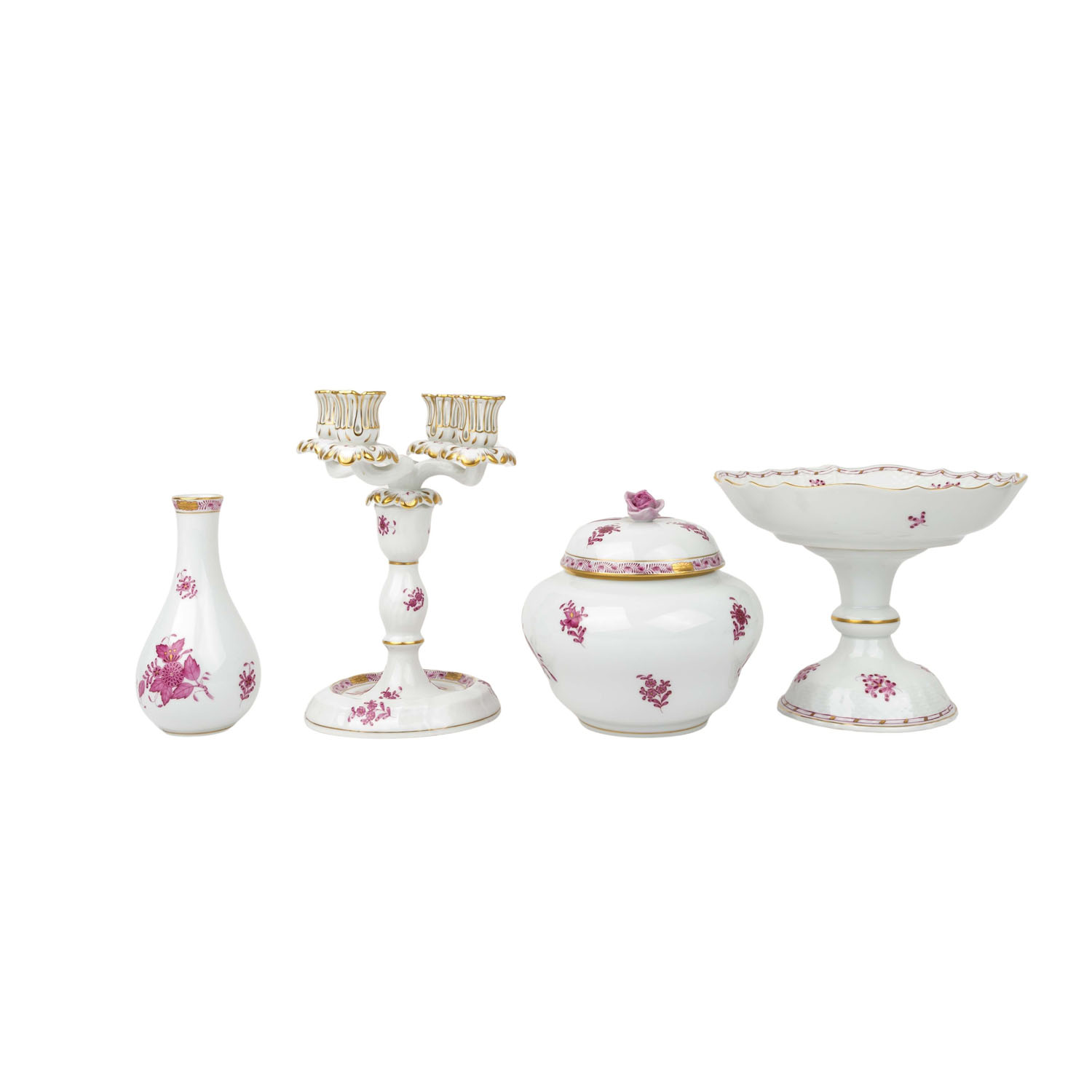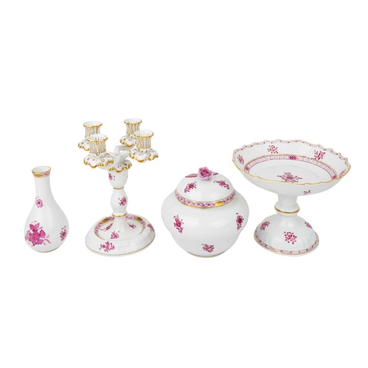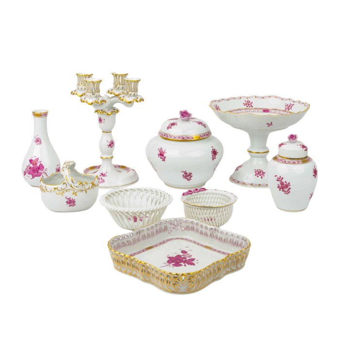 überwiegend im Dekor Apponyi Purpur, bestehend aus 1 Tafelaufsatzschale, Form- und Dekornr. 1313 WR3 (Waldstein Purpur), H 16 cm x D 21 cm, kleine Vase (7052/AP), H 16 cm, 4-flammiger Leuchter, 1 Tülle mit Haarriss innen (7915/AP), H 23 cm, kl. Schale mit Durchbruchdekor (7371/AP), D 12 cm, Korbschale mit Henkel (7457/AP), kl. Deckelvase (6460/AP), H 14, 5 cm, Bonboniere, (6091/AP), H 15, 5 cm, Korbschälchen (7376/AP), D 10 cm sowie eine flache Durchbruchschale, (7510), L 18 cm. verschiedene Herend Marken, tlw. Alters- und Gebrauchsspuren.