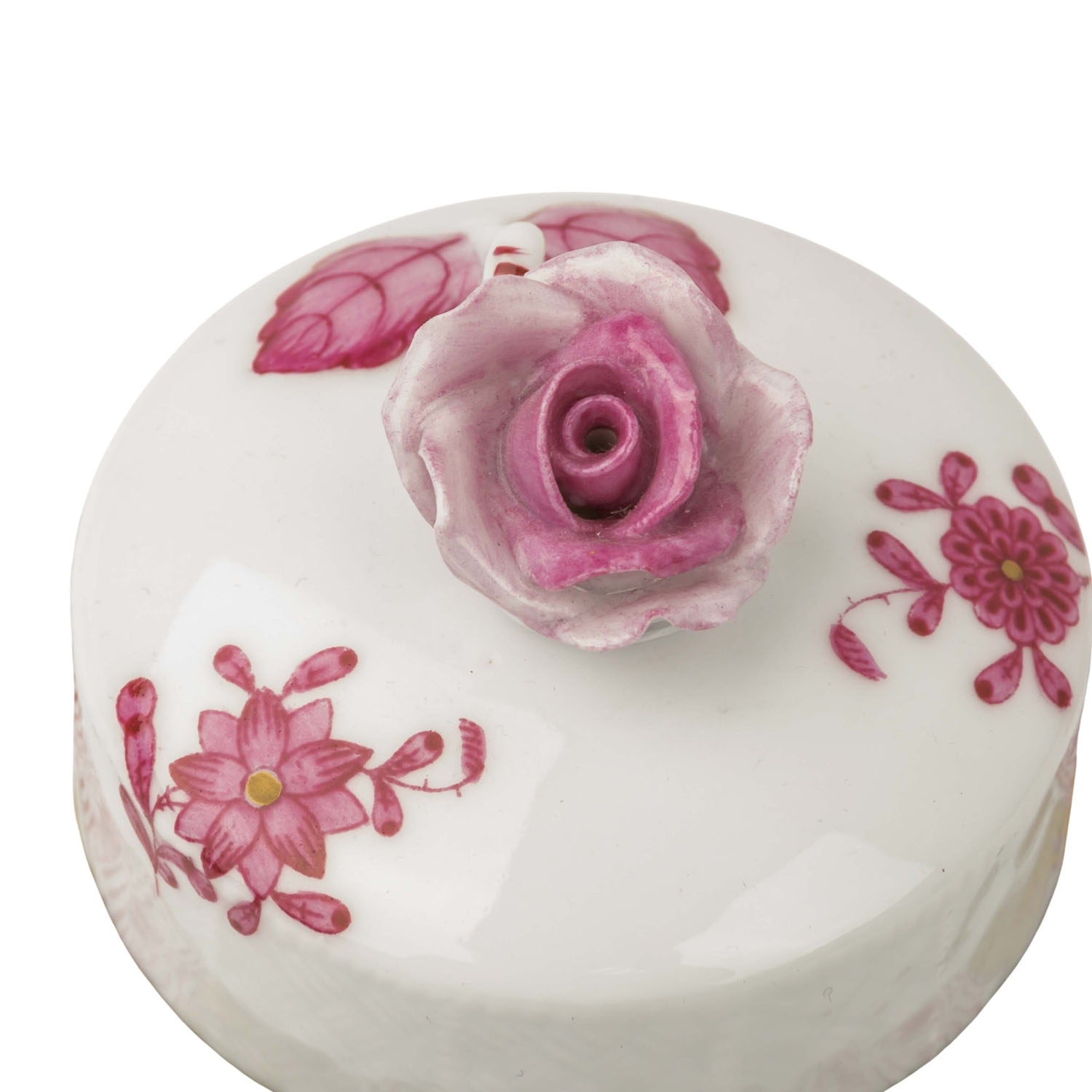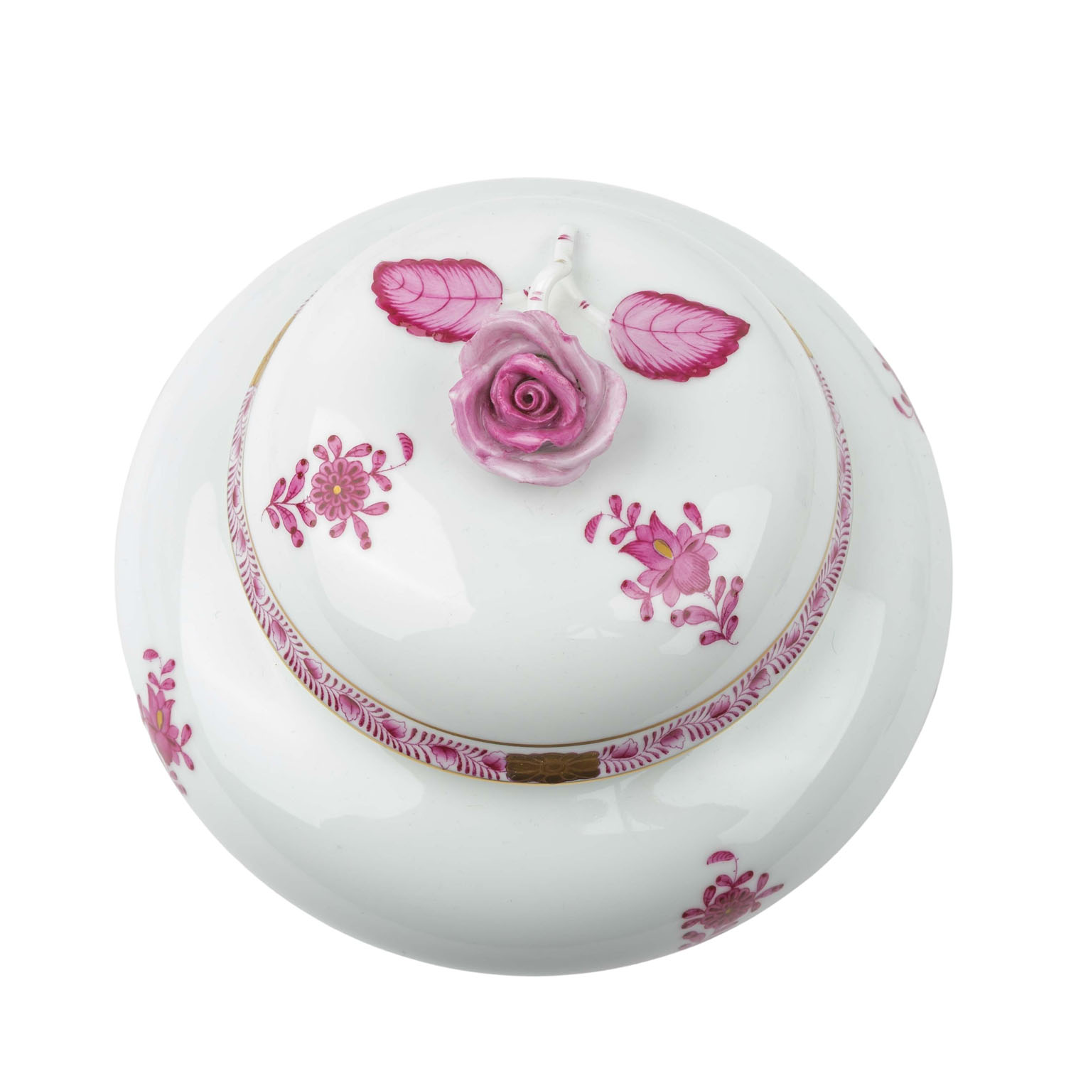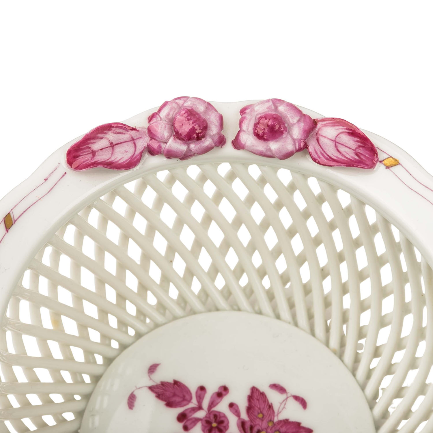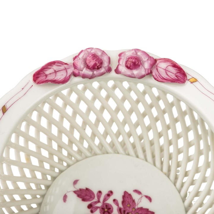 überwiegend im Dekor Apponyi Purpur, bestehend aus 1 Tafelaufsatzschale, Form- und Dekornr. 1313 WR3 (Waldstein Purpur), H 16 cm x D 21 cm, kleine Vase (7052/AP), H 16 cm, 4-flammiger Leuchter, 1 Tülle mit Haarriss innen (7915/AP), H 23 cm, kl. Schale mit Durchbruchdekor (7371/AP), D 12 cm, Korbschale mit Henkel (7457/AP), kl. Deckelvase (6460/AP), H 14, 5 cm, Bonboniere, (6091/AP), H 15, 5 cm, Korbschälchen (7376/AP), D 10 cm sowie eine flache Durchbruchschale, (7510), L 18 cm. verschiedene Herend Marken, tlw. Alters- und Gebrauchsspuren.