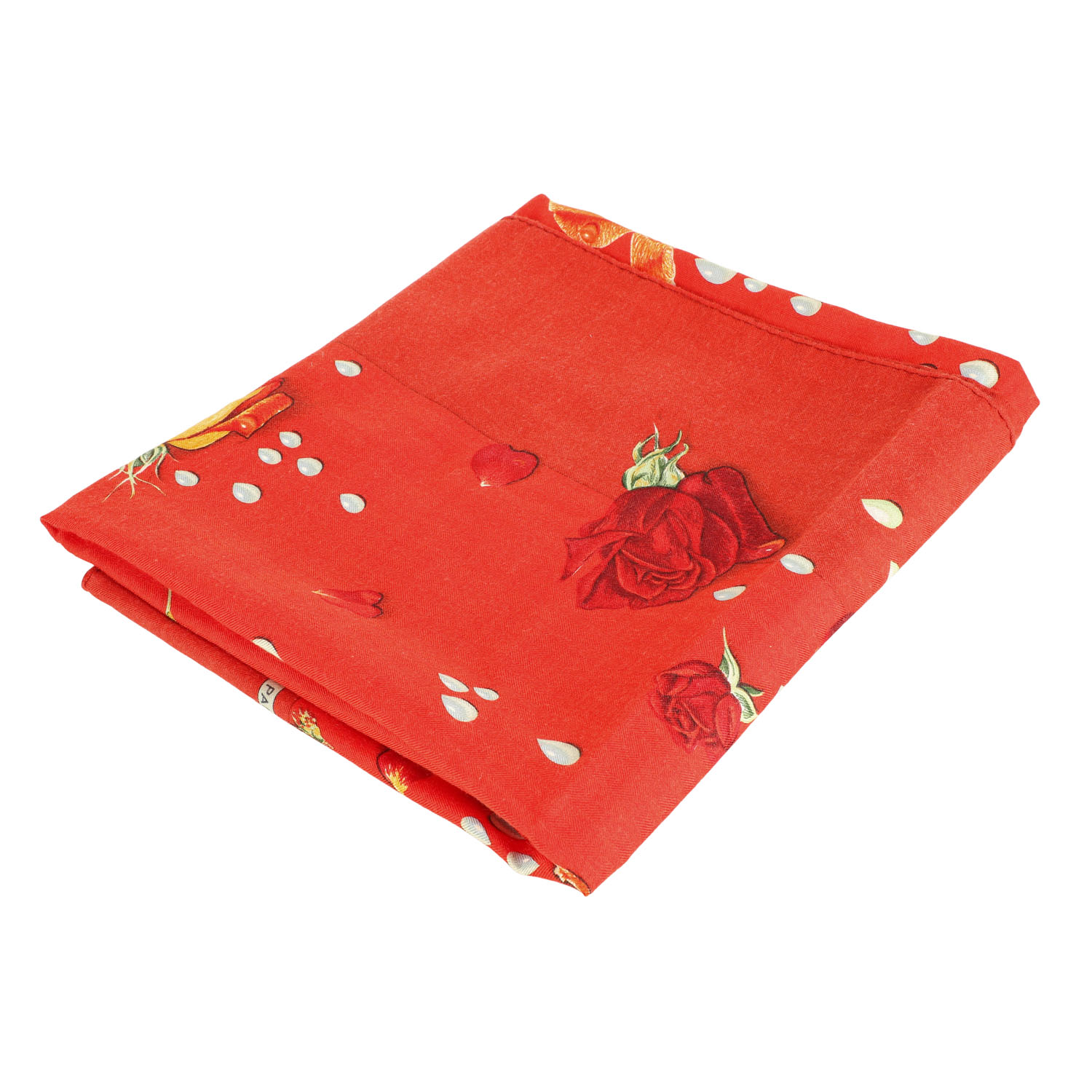 by Anne Gavarni, Entwurf erstmals erschienen 1960. Akt. NP.: 1.260,-€. 65% Kaschmir, 35% Seide. Rosenmotiv auf rotem Grund. 140 x 140 cm. Handrollierte Säume. Tragespuren vorhanden, Pilling, gezogener Faden, kein Etikett.