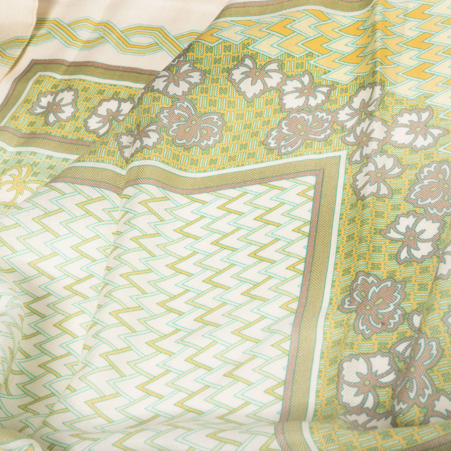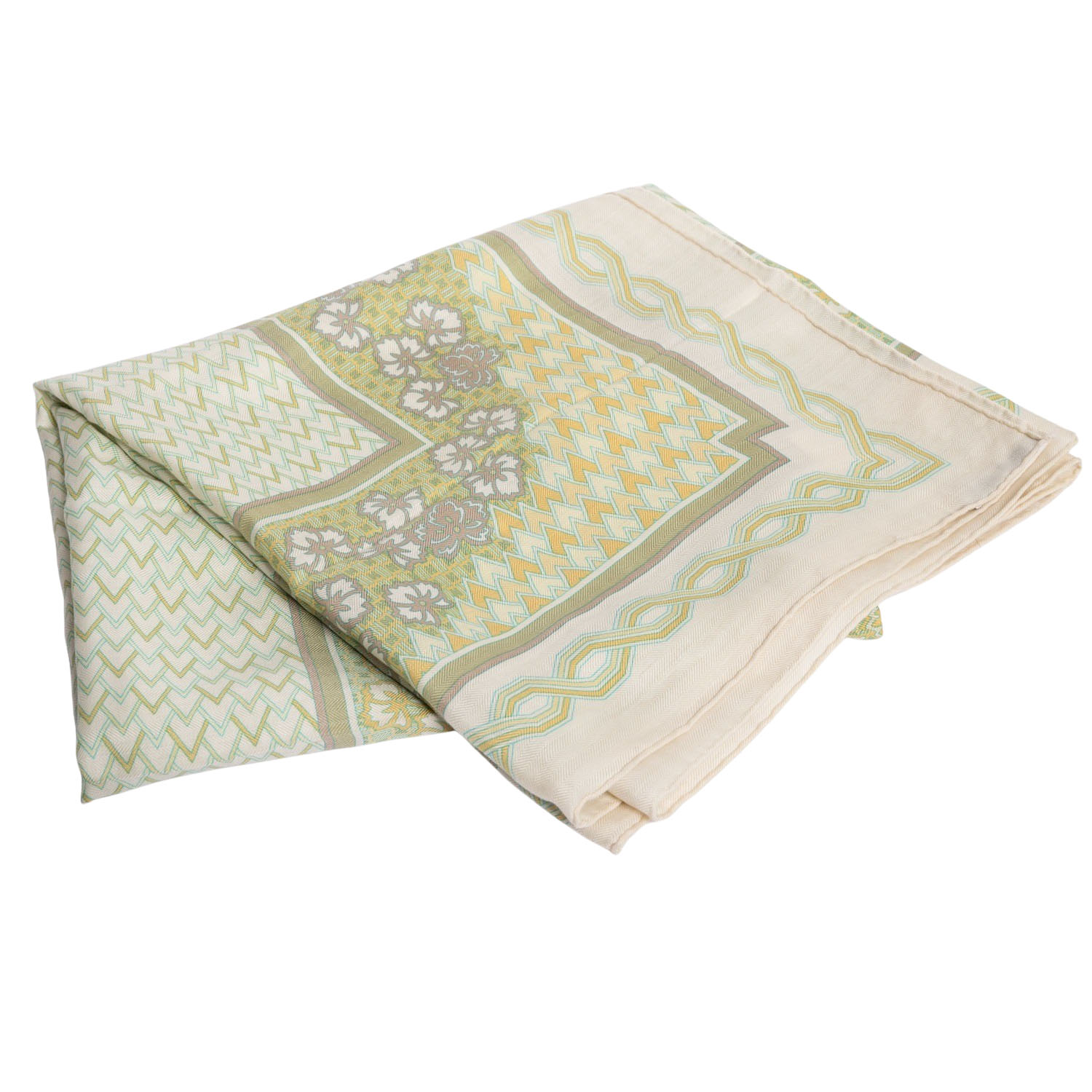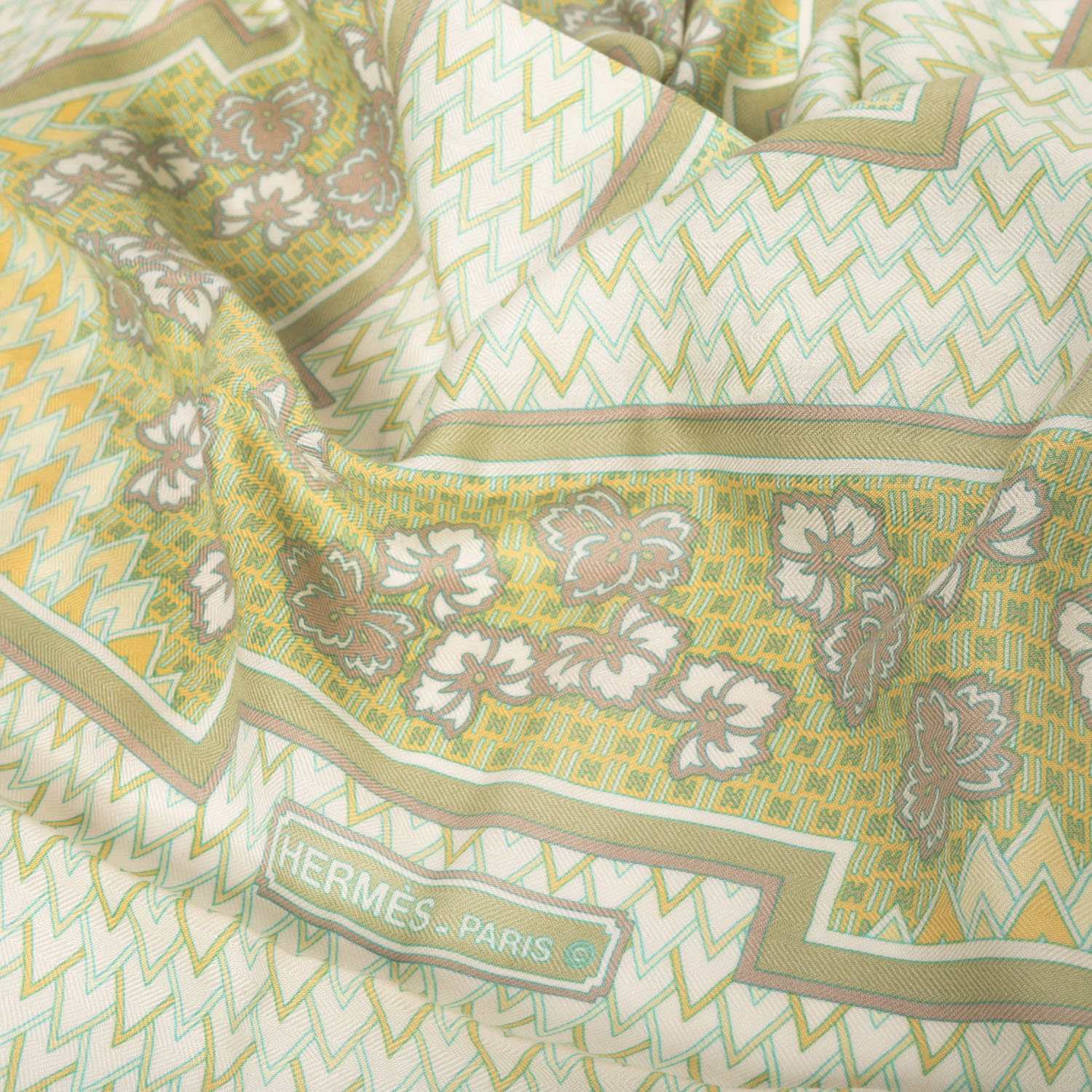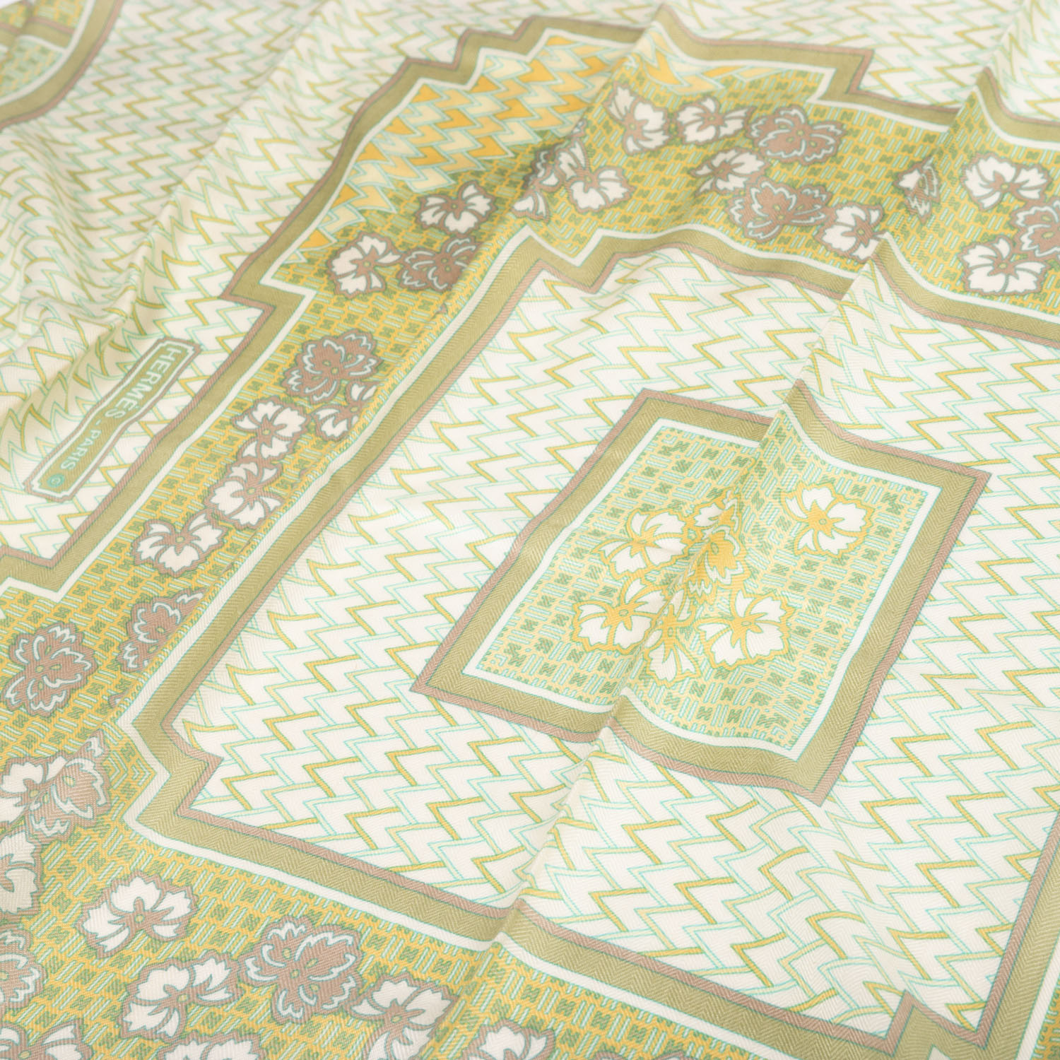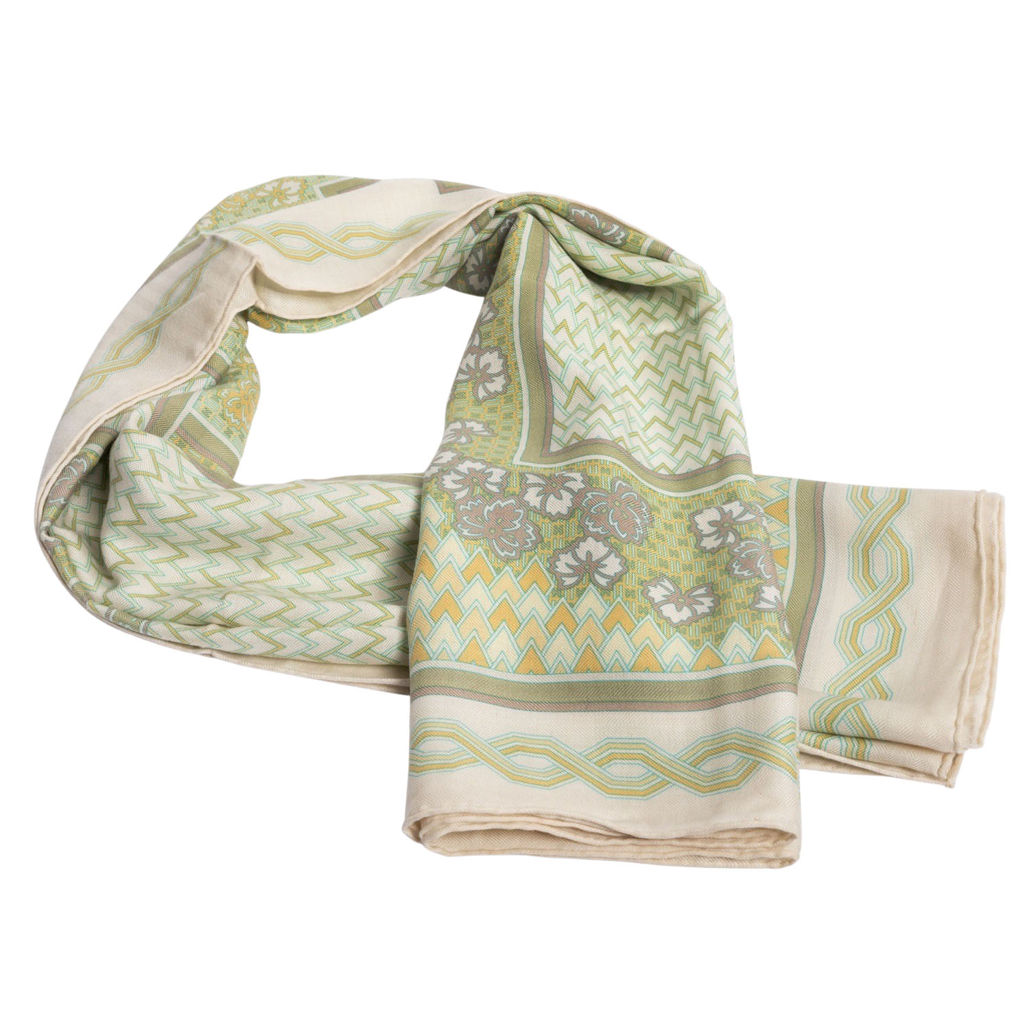 by Catherine Baschet, Entwurf erstmals erschienen 1985. 65% Kaschmir und 35% Seide. Indischer Mustermix in Beige/Gelb und Hellgrün. 140 x 140 cm. Handrollierte Säume. Leichte Tragespuren vorhanden.